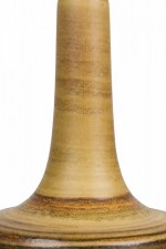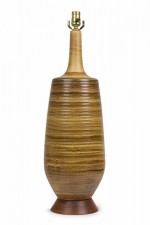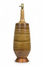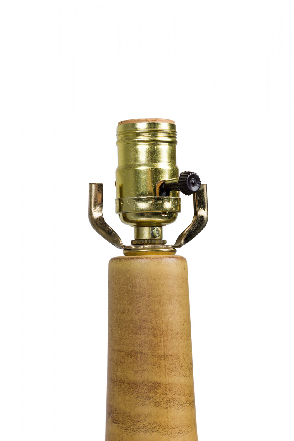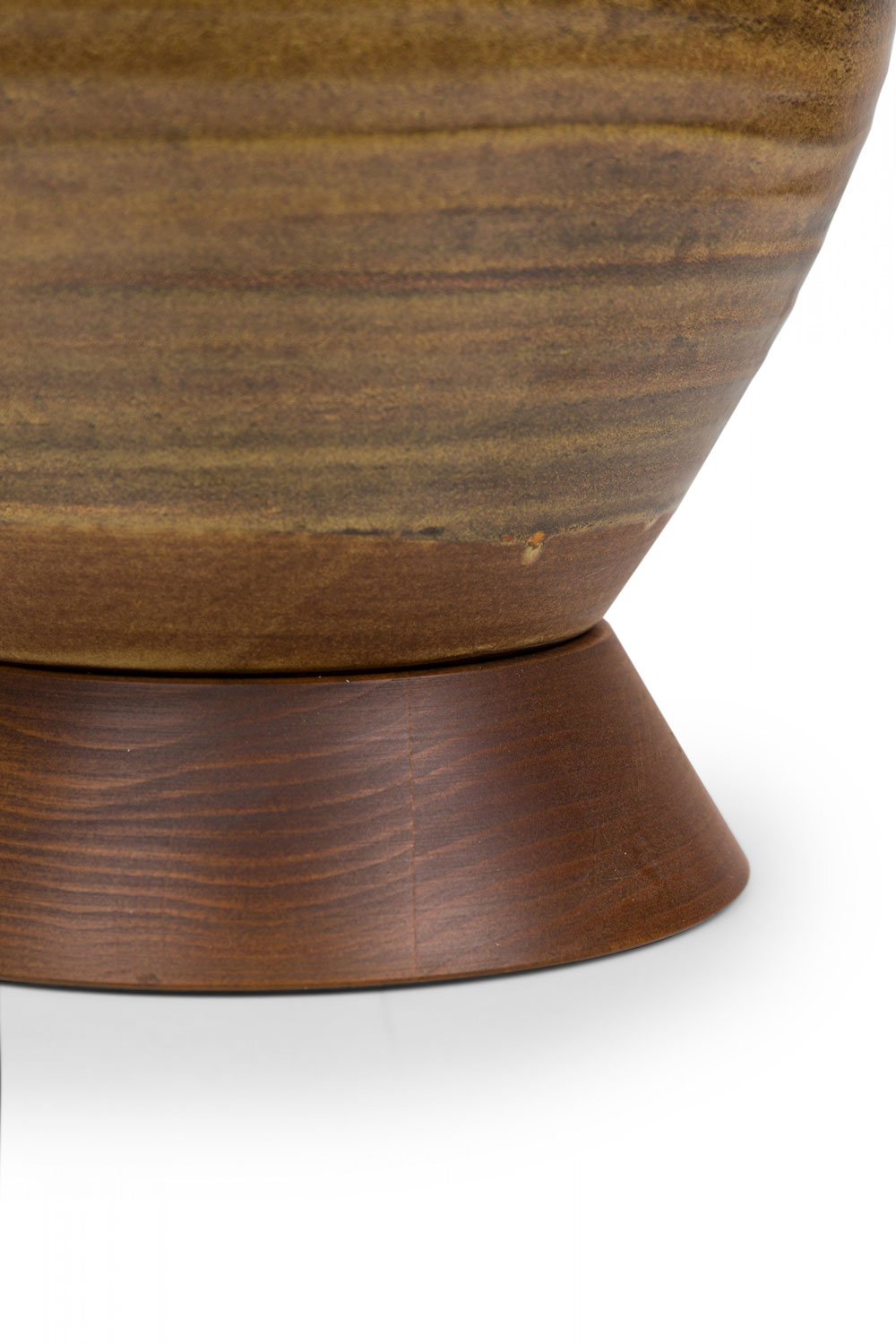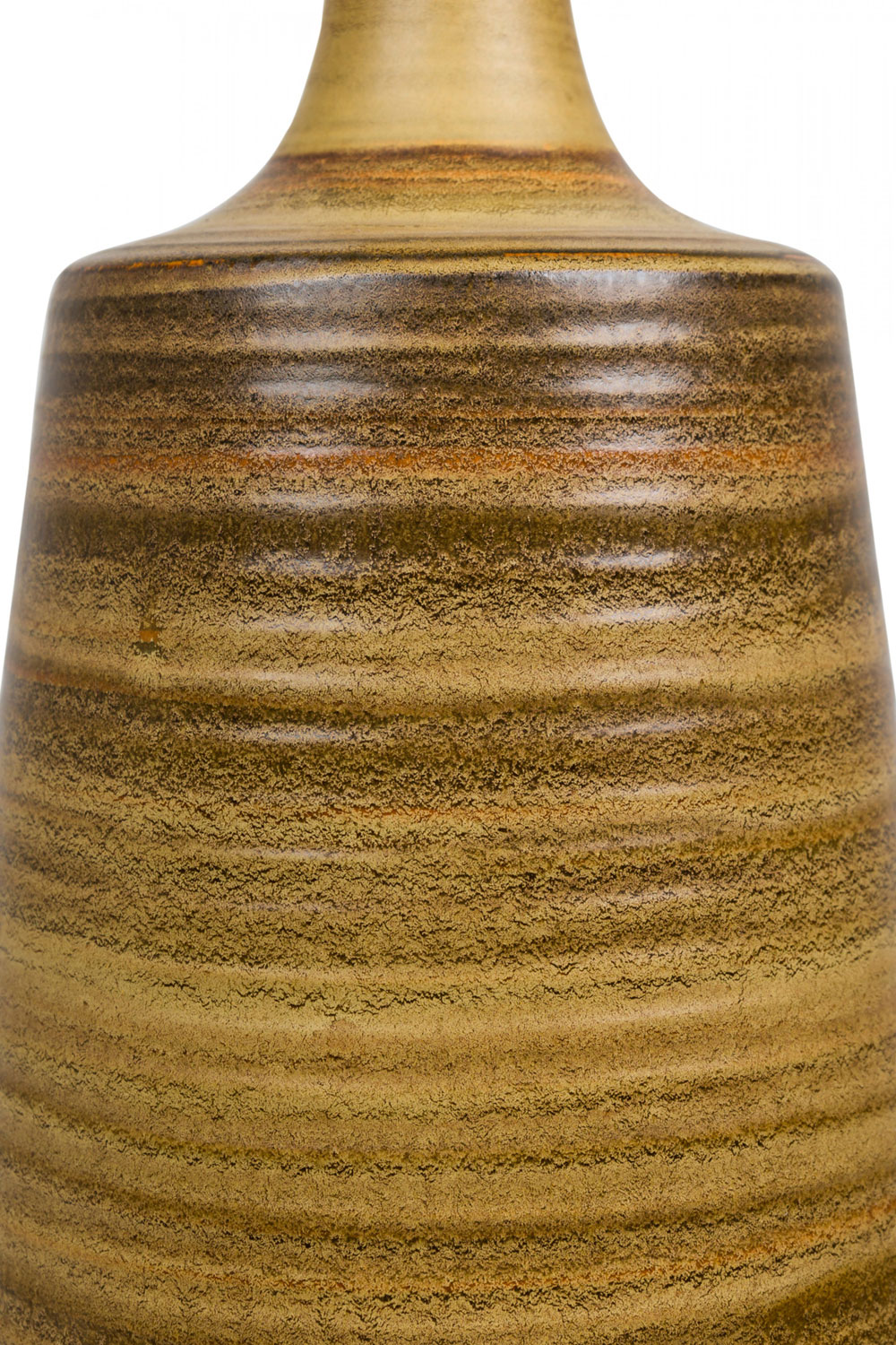 PAIR of Mid-Century American ceramic table lamps in tapered ovoid ribbed form with flattened shoulders which narrow at the neck, both housing functioning light switch sockets. An earthy brown-toned stippled "Earth Glaze" envelops the body in descending horizontal wave patterns, both mounted on tapered, molded wood bases. (PRICED AS PAIR).