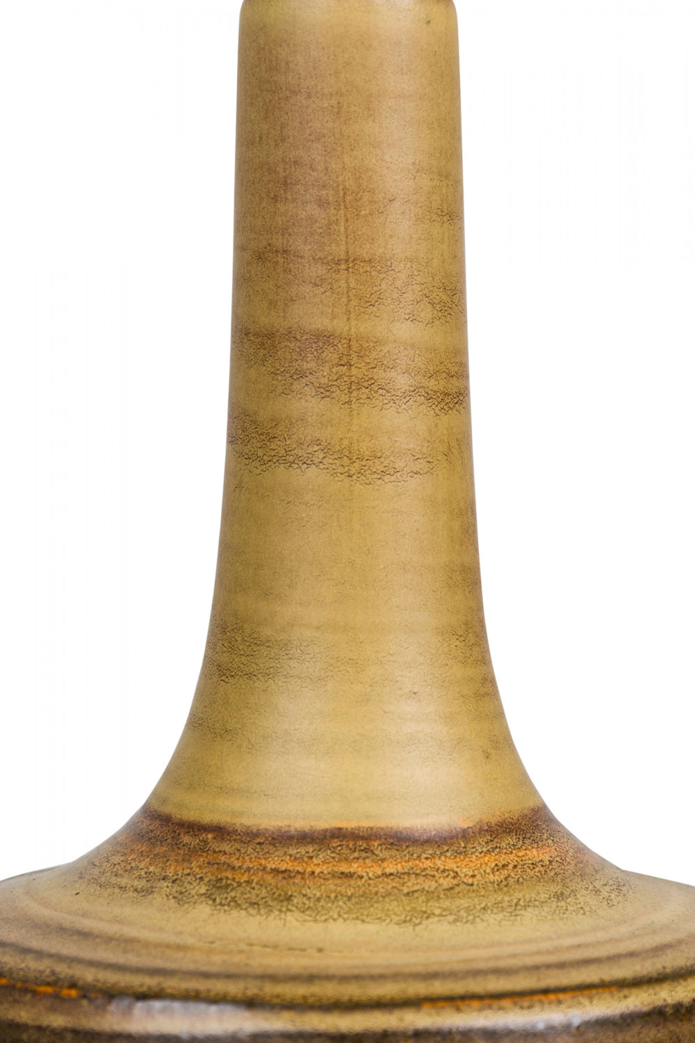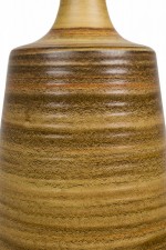 PAIR of Mid-Century American ceramic table lamps in tapered ovoid ribbed form with flattened shoulders which narrow at the neck, both housing functioning light switch sockets. An earthy brown-toned stippled "Earth Glaze" envelops the body in descending horizontal wave patterns, both mounted on tapered, molded wood bases. (PRICED AS PAIR)