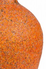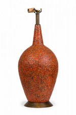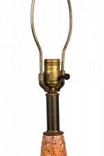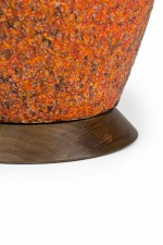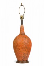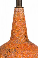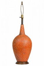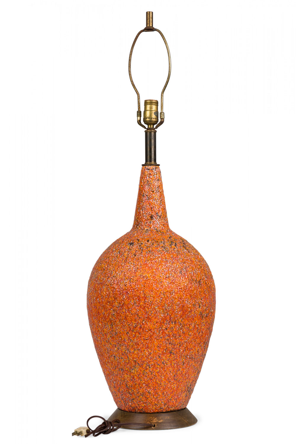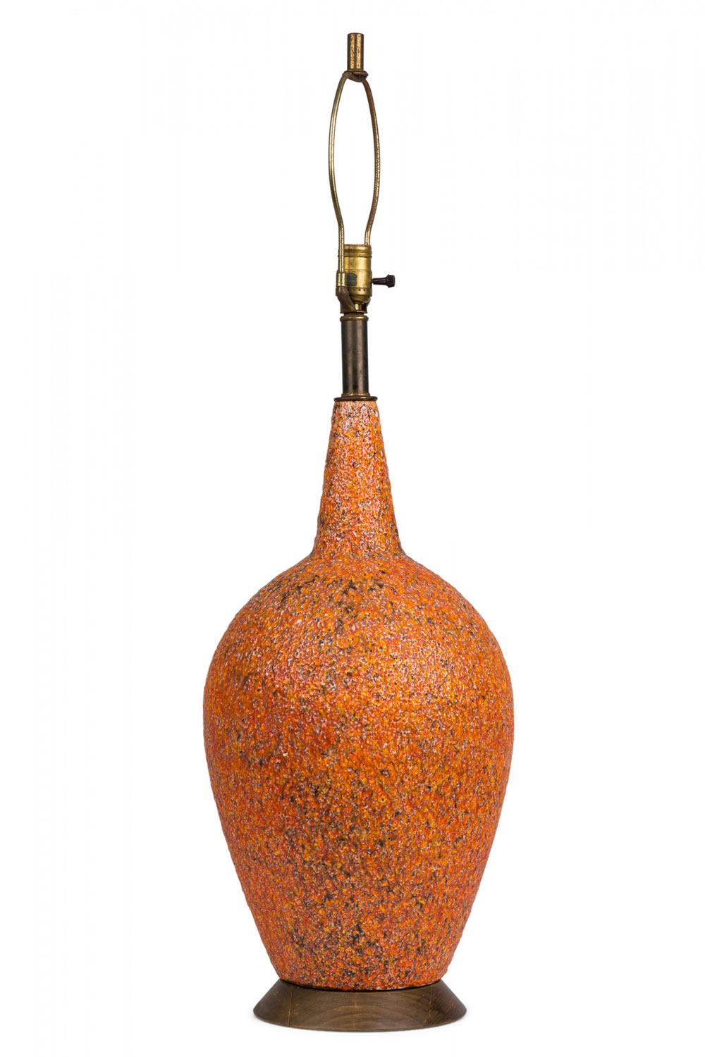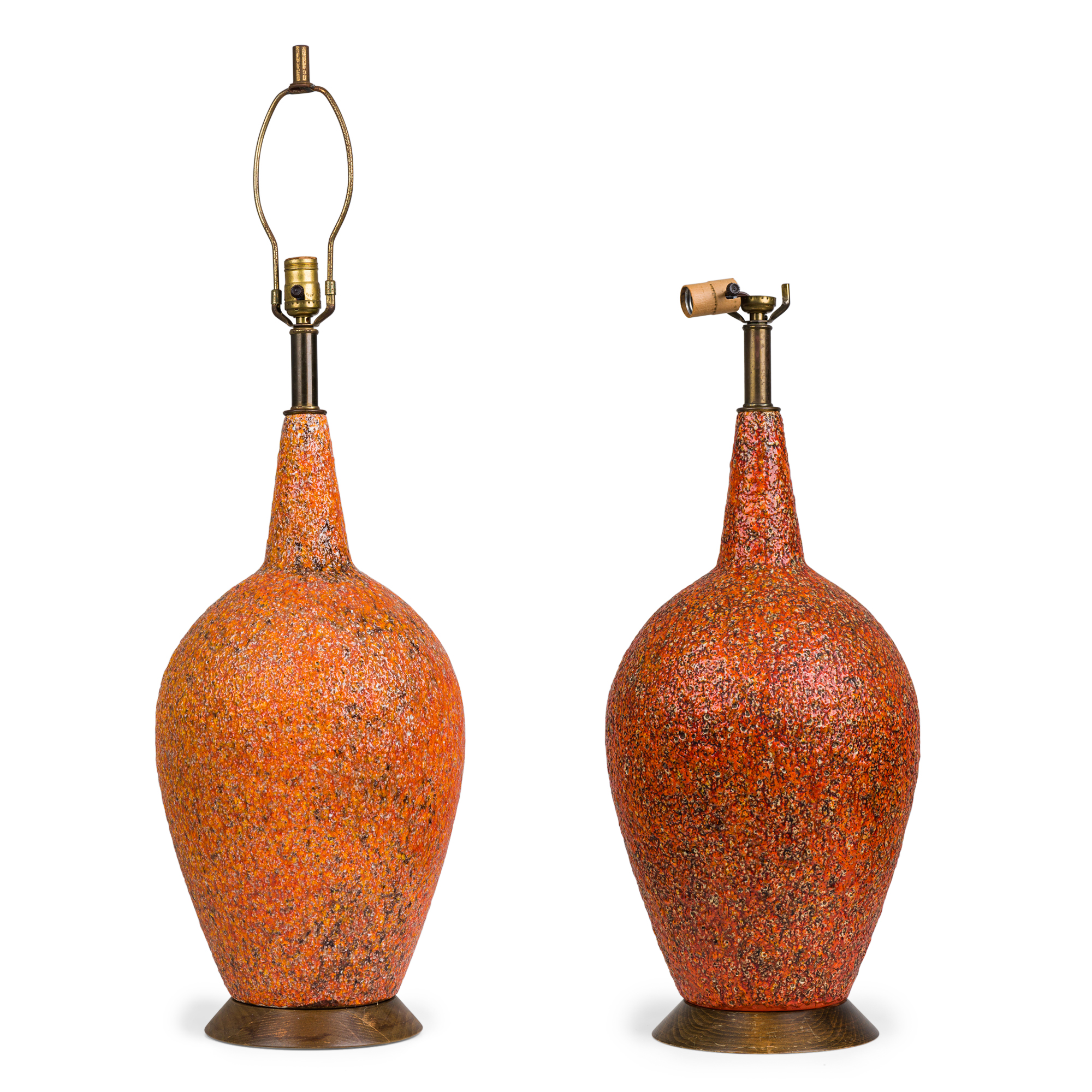 PAIR of Mid-Century American ceramic table lamps in tapered ovoid form, fired in a textured orange glossy lava glaze, narrowing toward the top, the darker glazed lamp in need of a new light socket, the lighter one with a functioning brass light switch socket, both resting on molded wood, tapered circular bases. (PRICED AS PAIR) (Similar piece: DUL0018),.