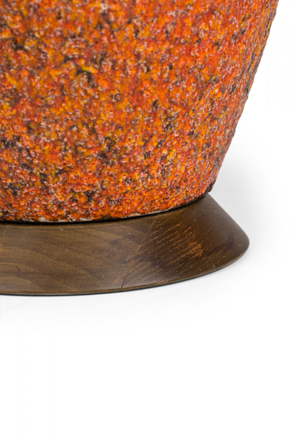 PAIR of Mid-Century American ceramic table lamps in tapered ovoid form, fired in a textured orange glossy lava glaze, narrowing toward the top, the darker glazed lamp in need of a new light socket, the lighter one with a functioning brass light switch socket, both resting on molded wood, tapered circular bases. (PRICED AS PAIR) (Similar piece: DUL0018),