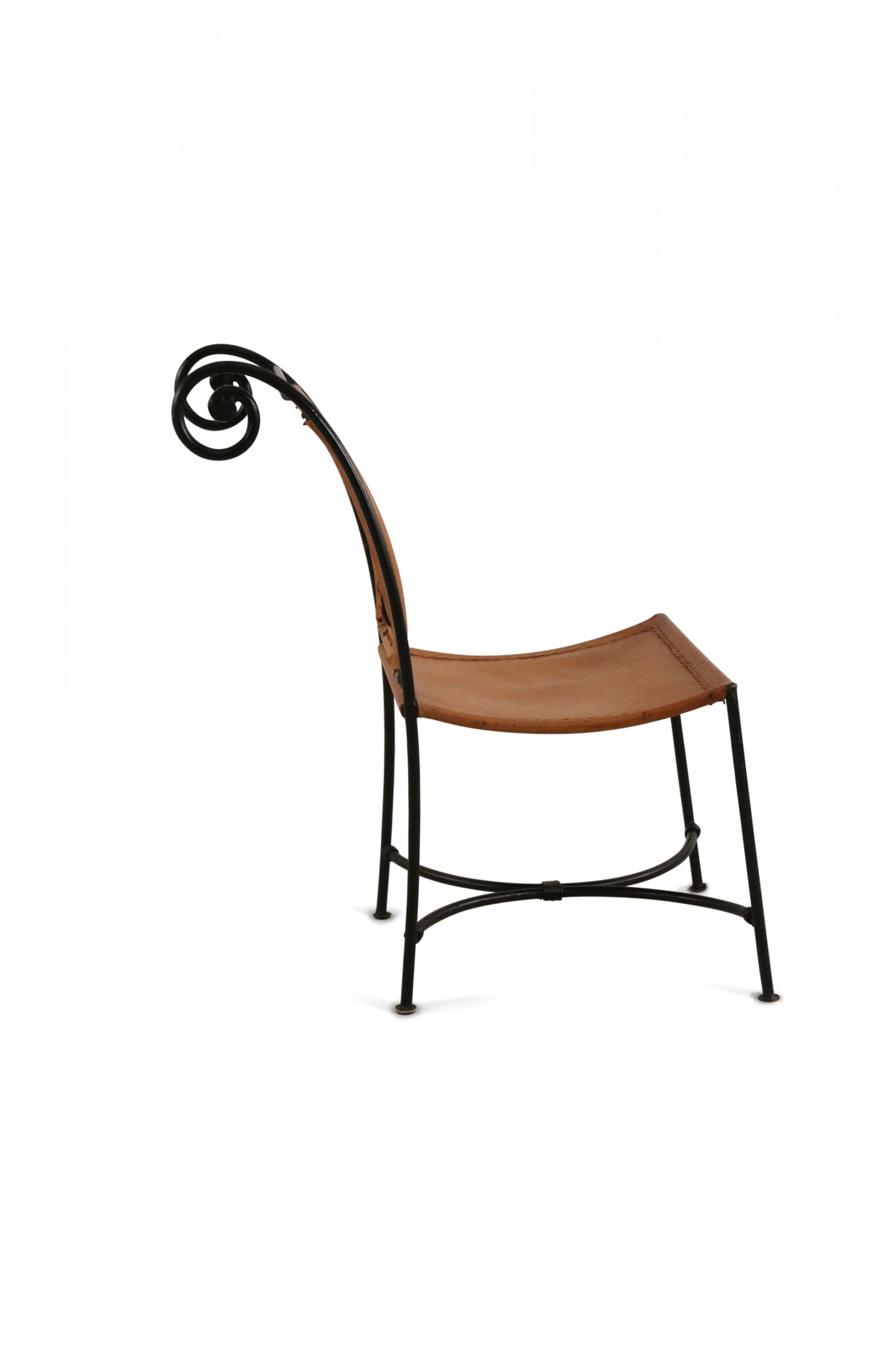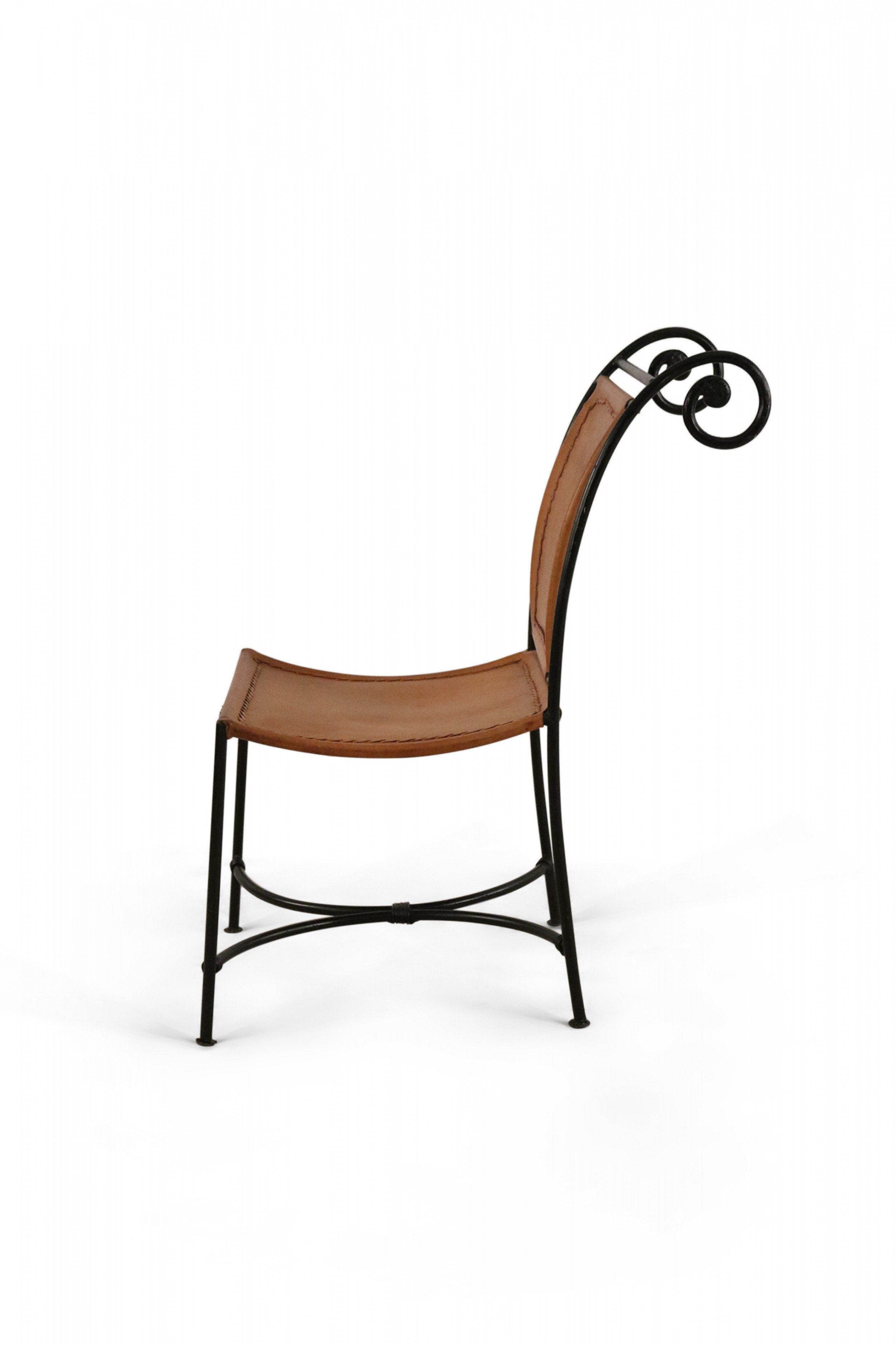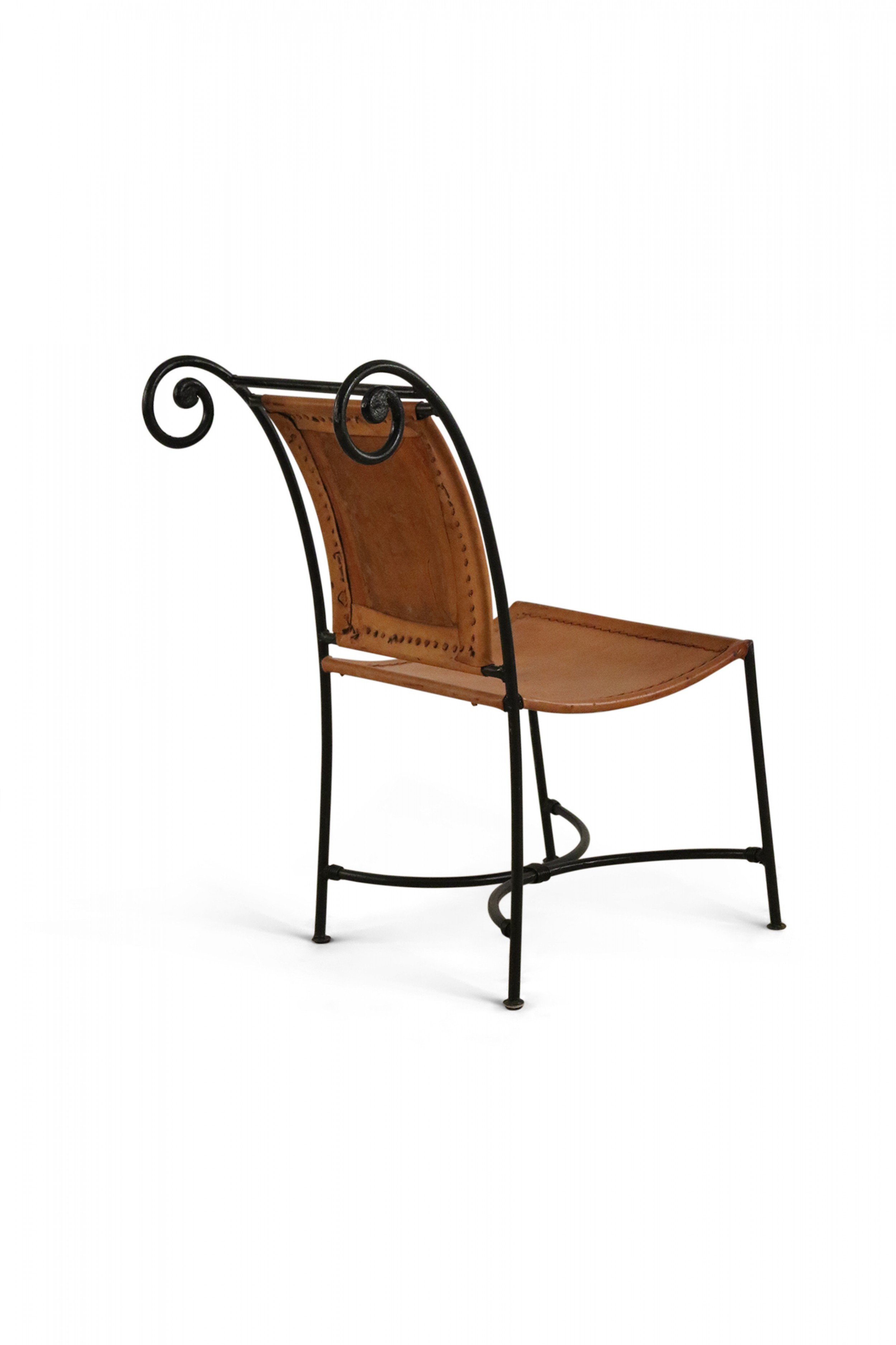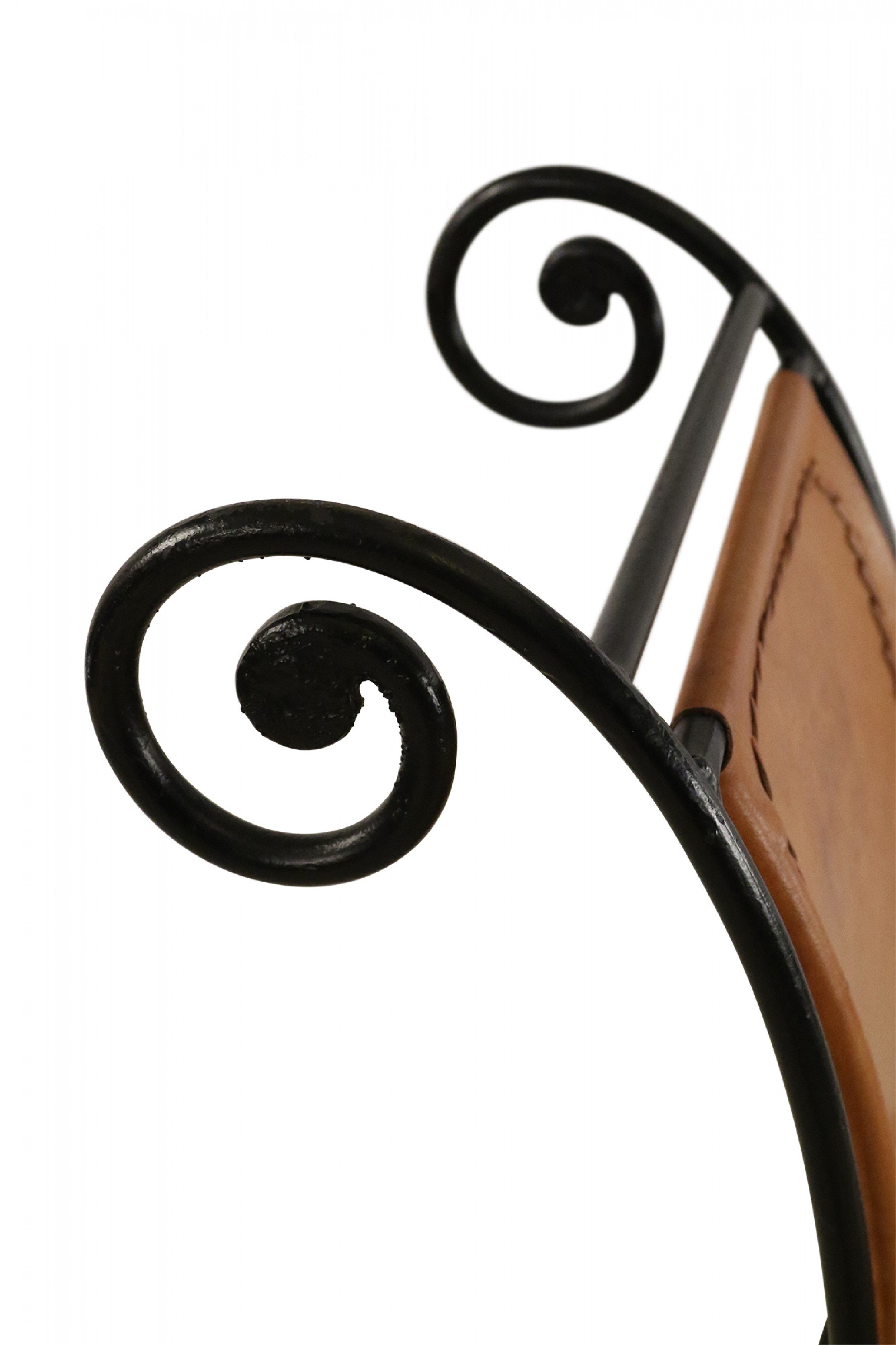 PAIR of Mid-Century side chairs with wrought iron frame with spiral back detail and brown leather seat upholstery. (PRICED AS PAIR)