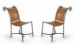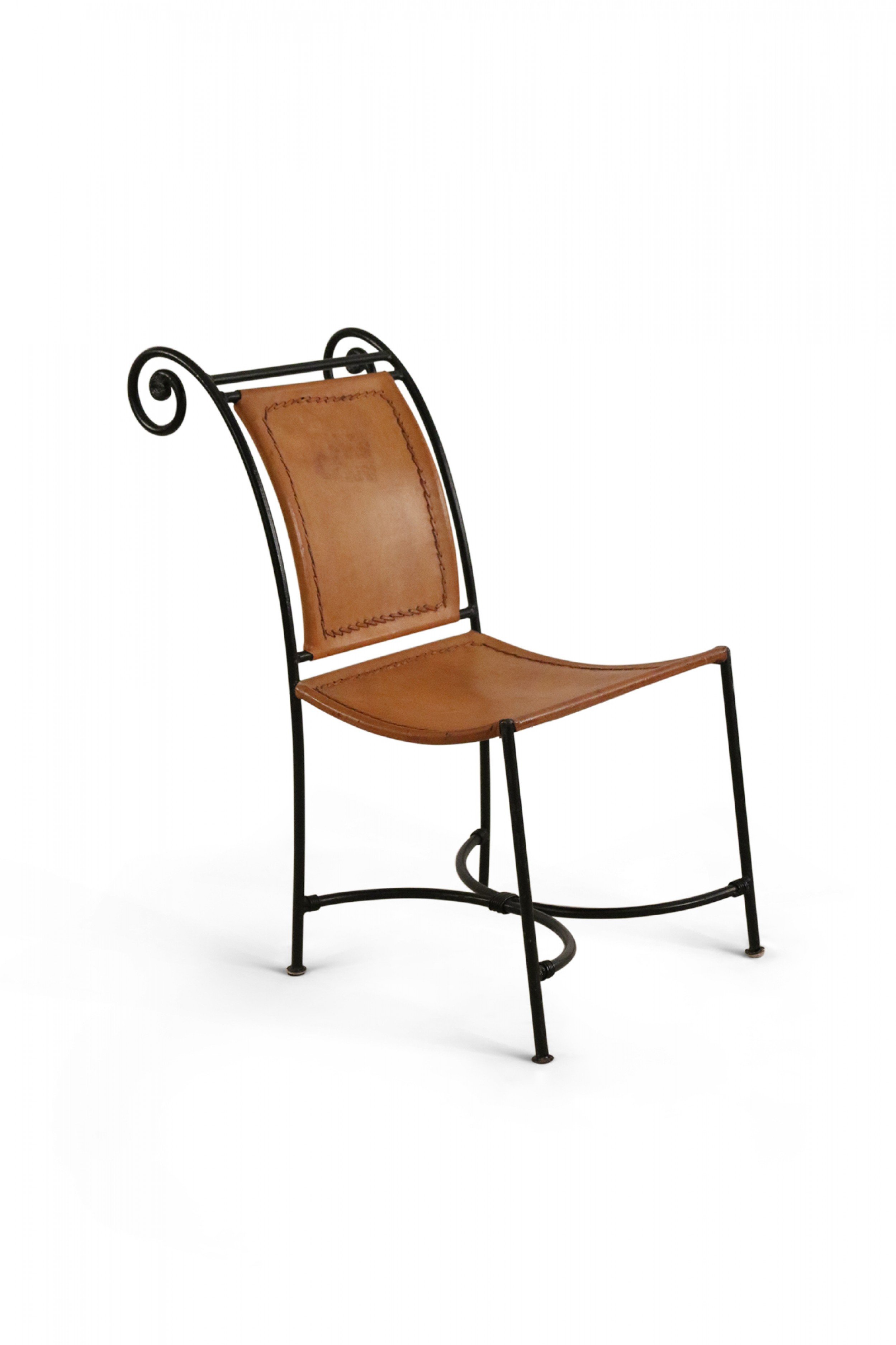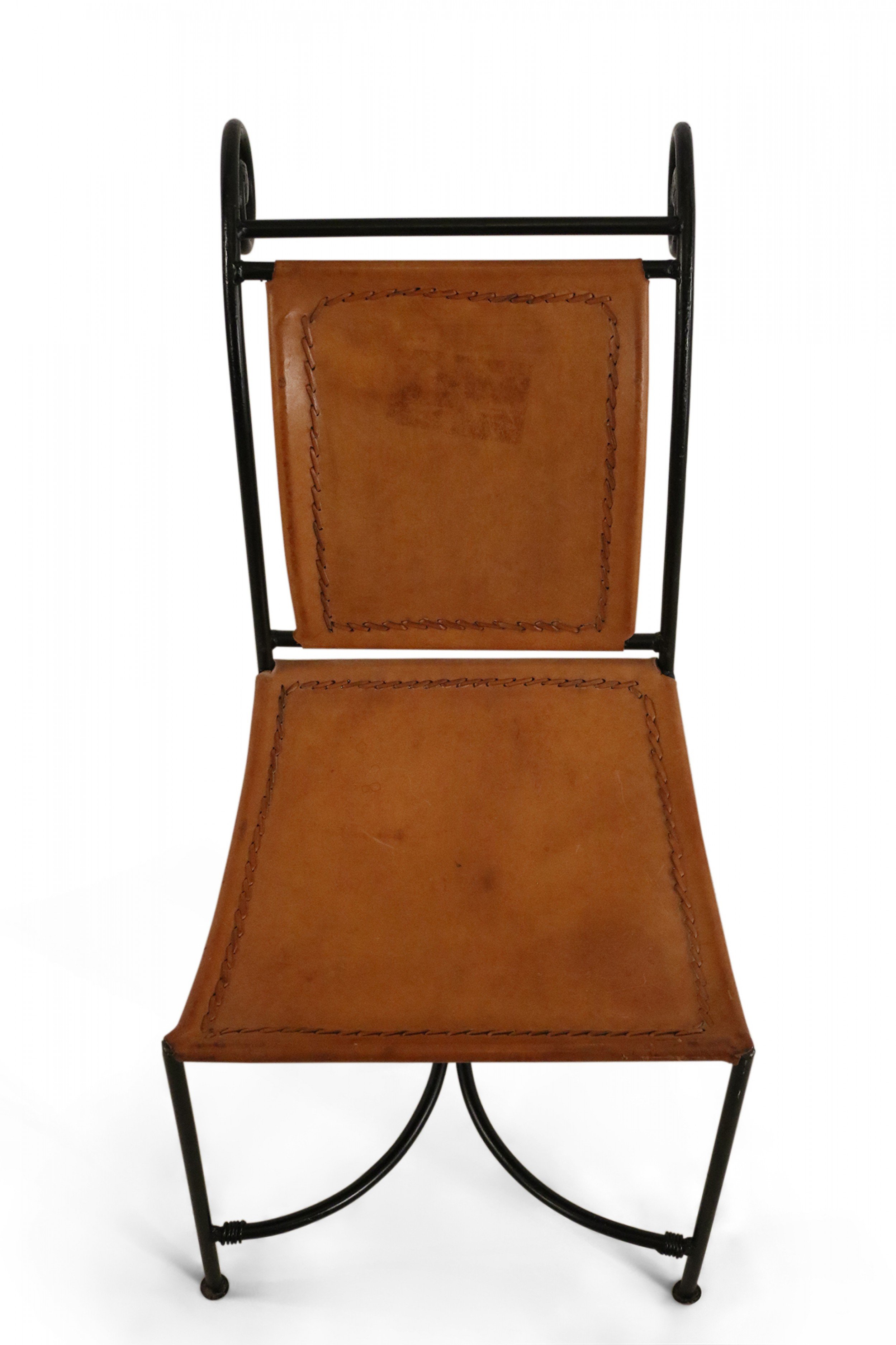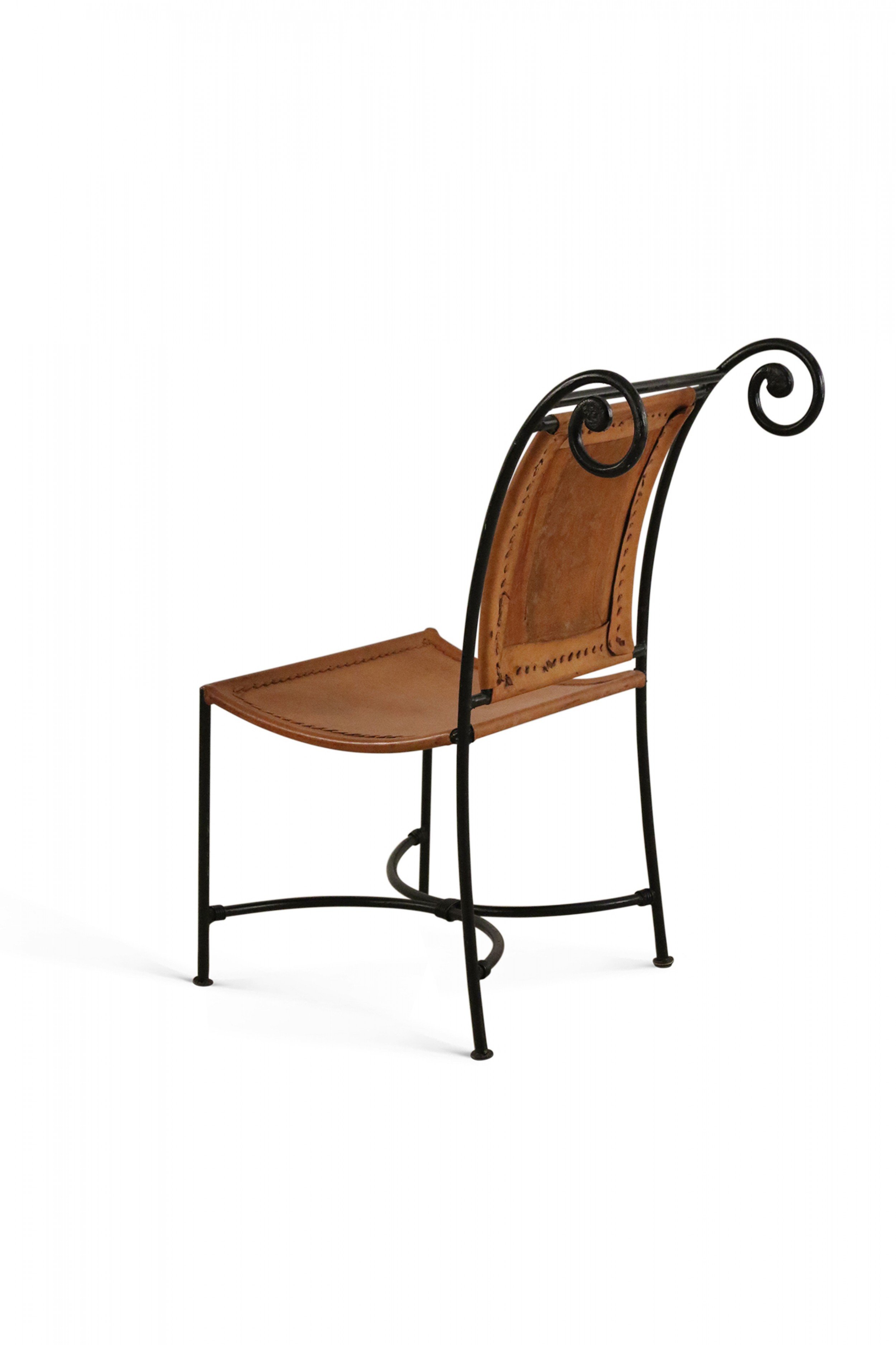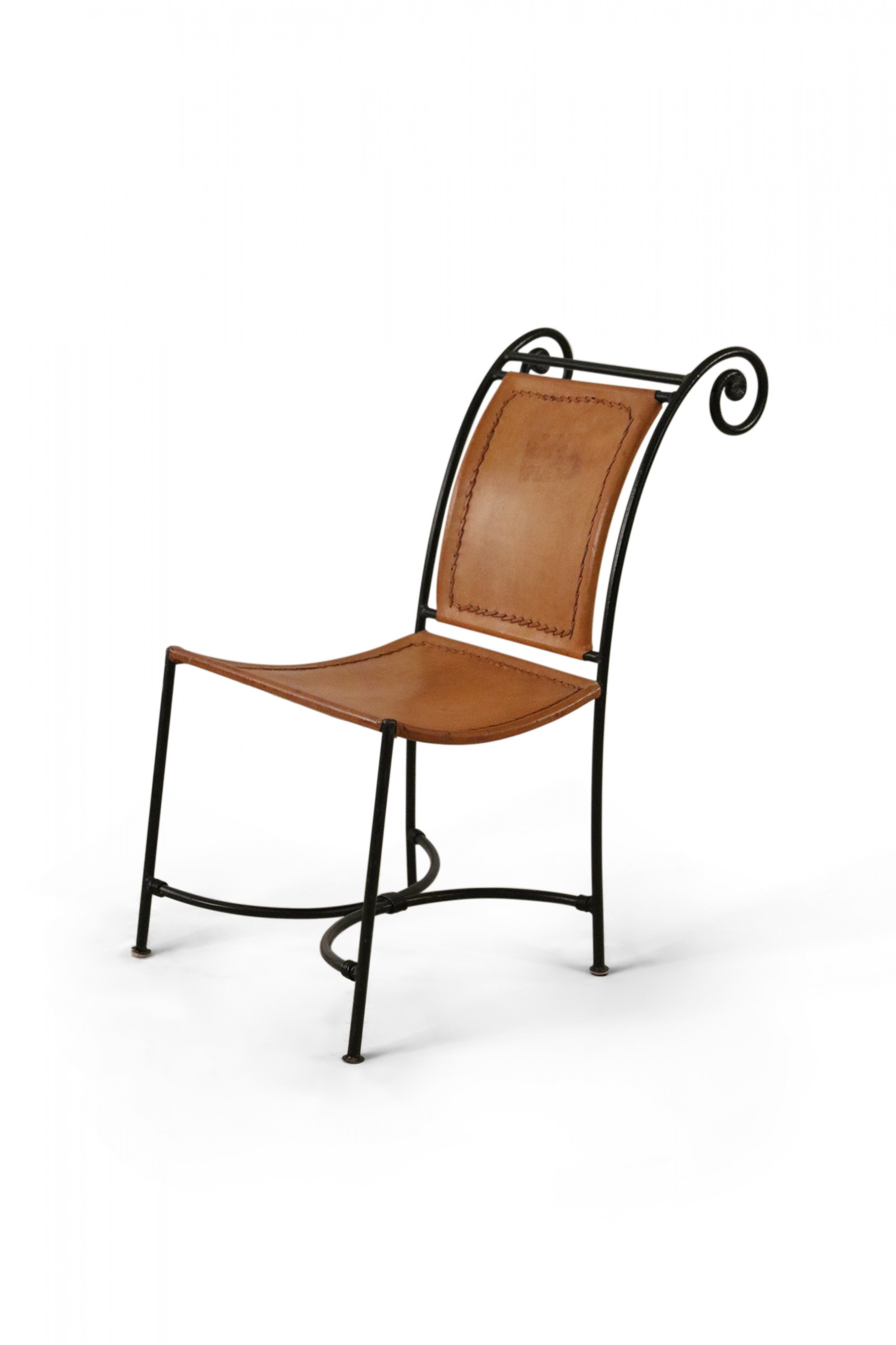 PAIR of Mid-Century side chairs with wrought iron frame with spiral back detail and brown leather seat upholstery. (PRICED AS PAIR)