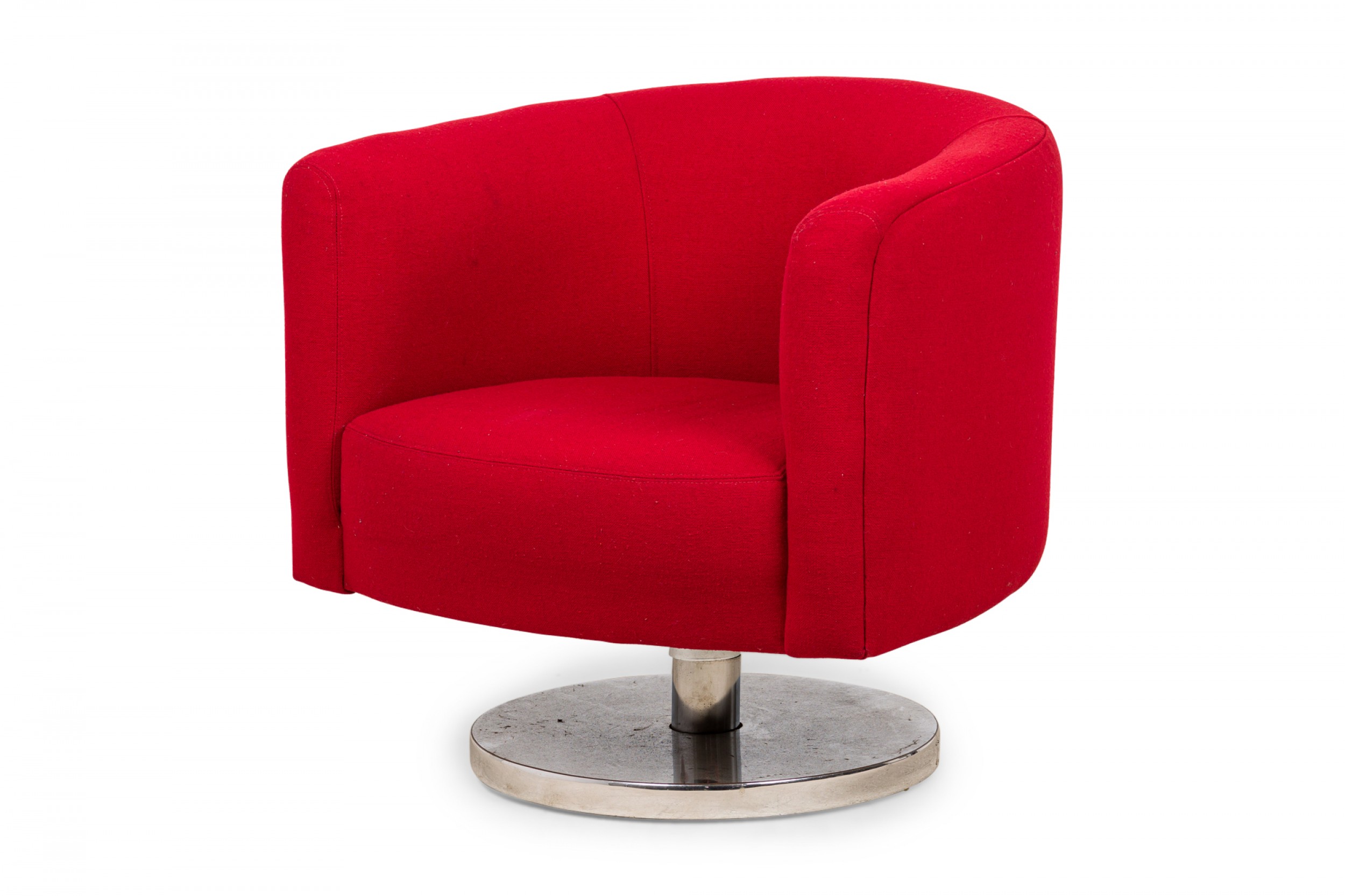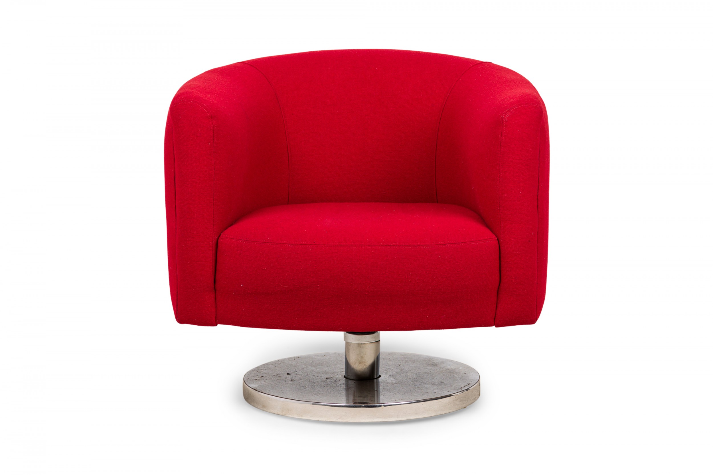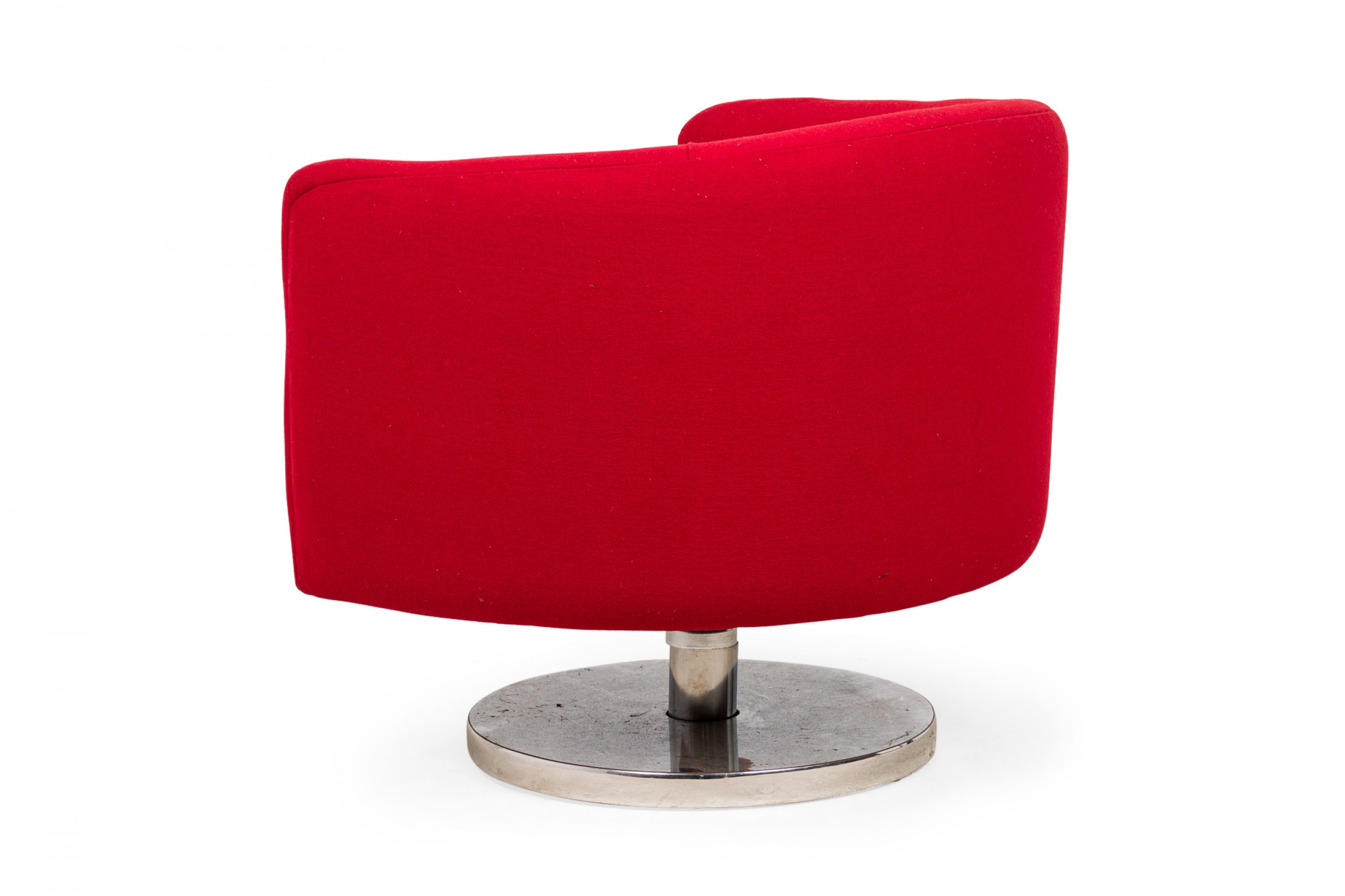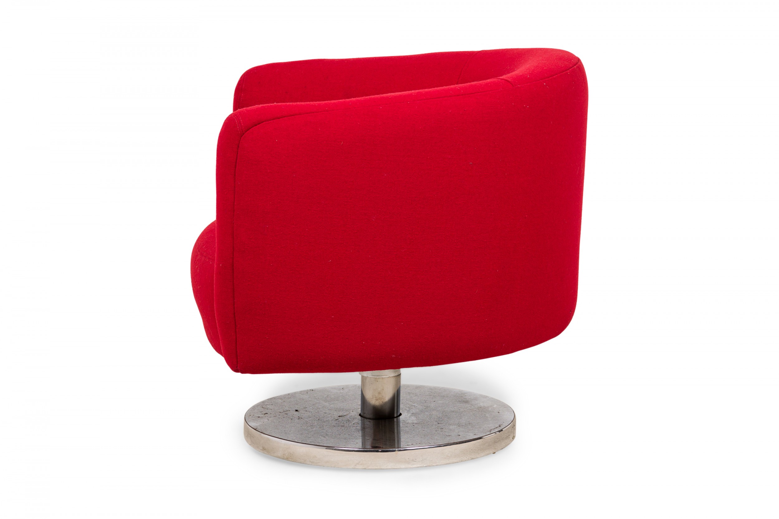 PAIR of American Mid-Century tub form swiveling lounge / armchairs upholstered in bright red fabric and resting on circular chrome swivel bases. (MILO BAUGHMAN)(PRICED AS PAIR)
