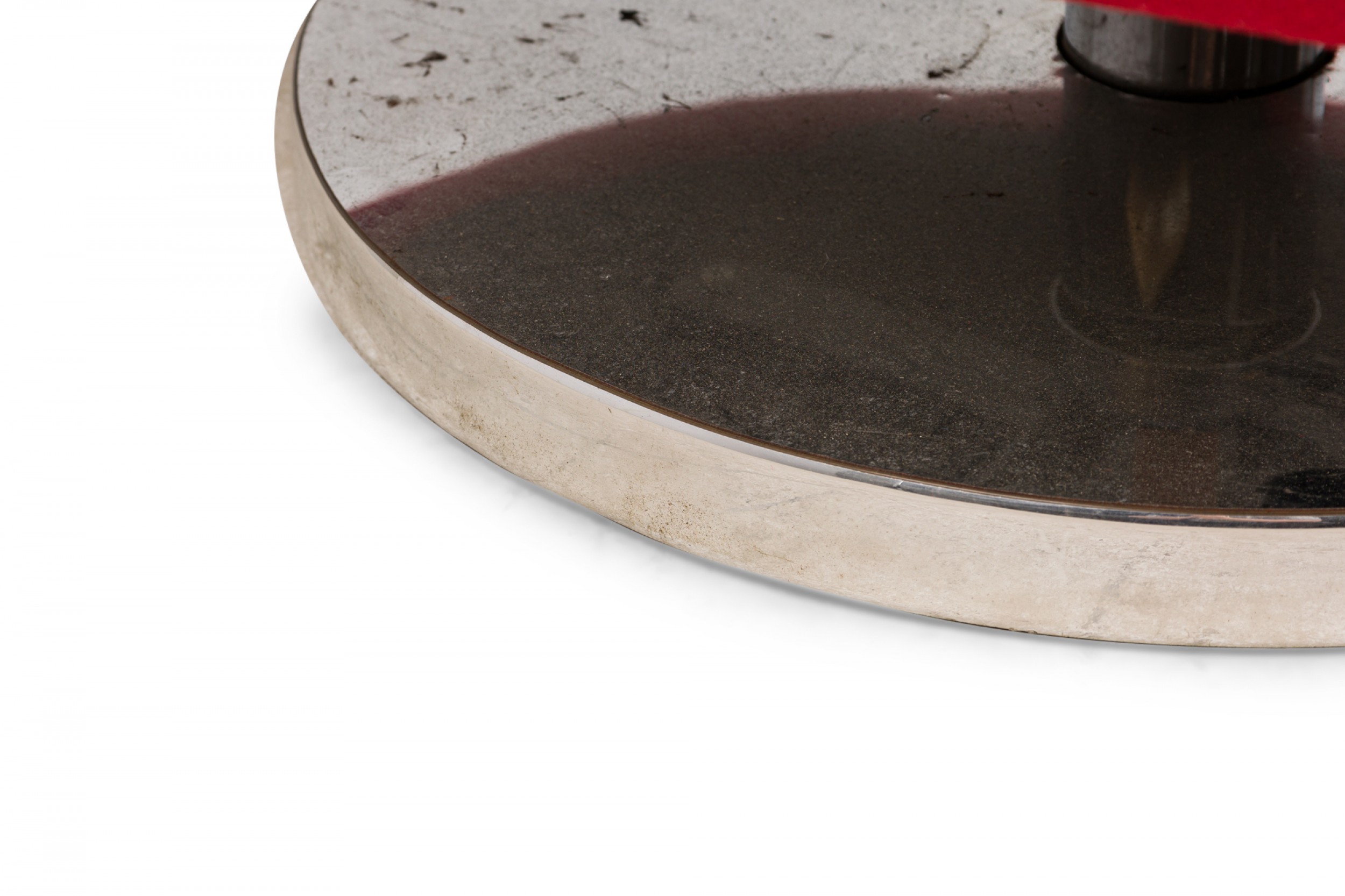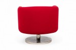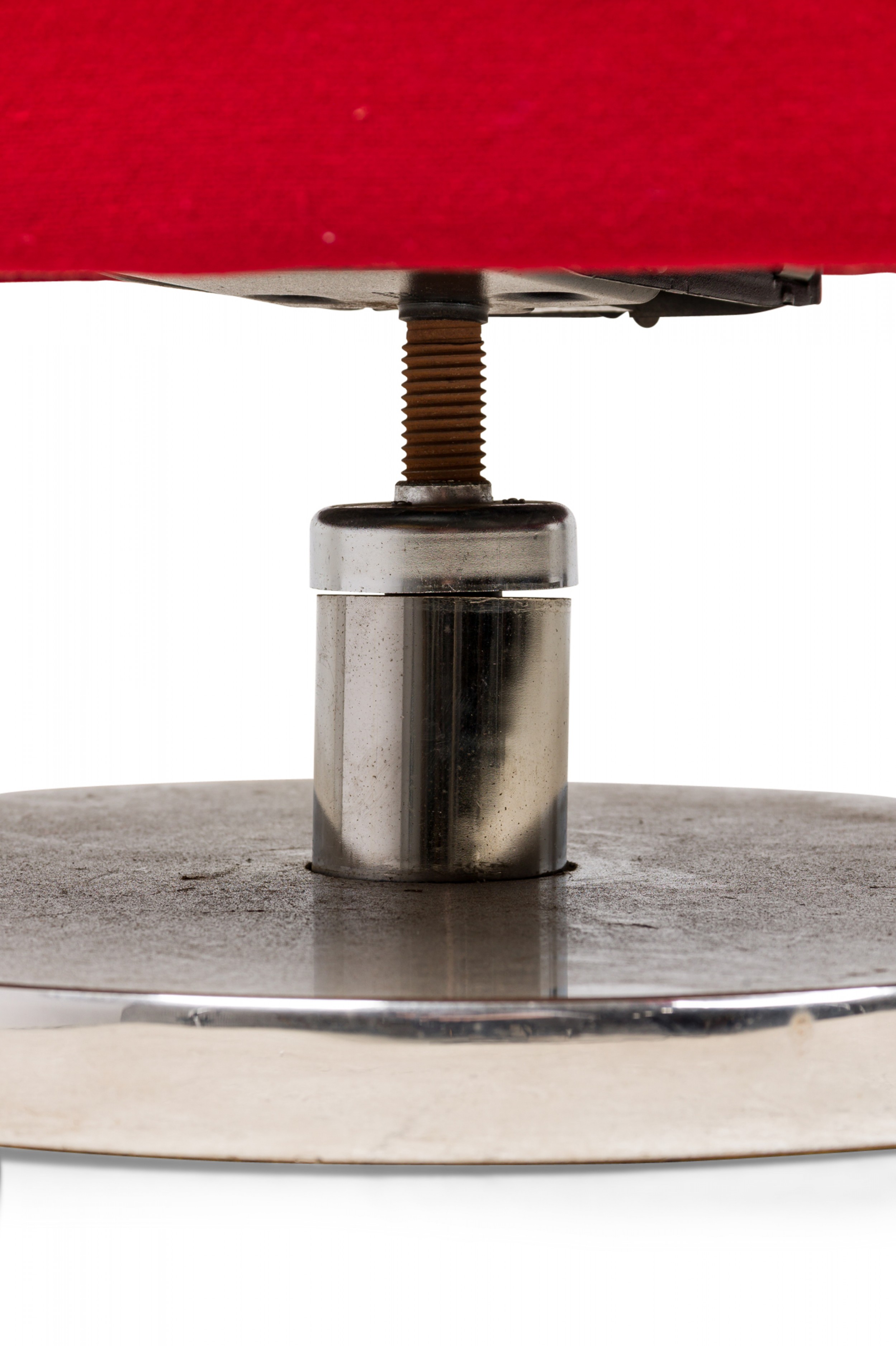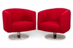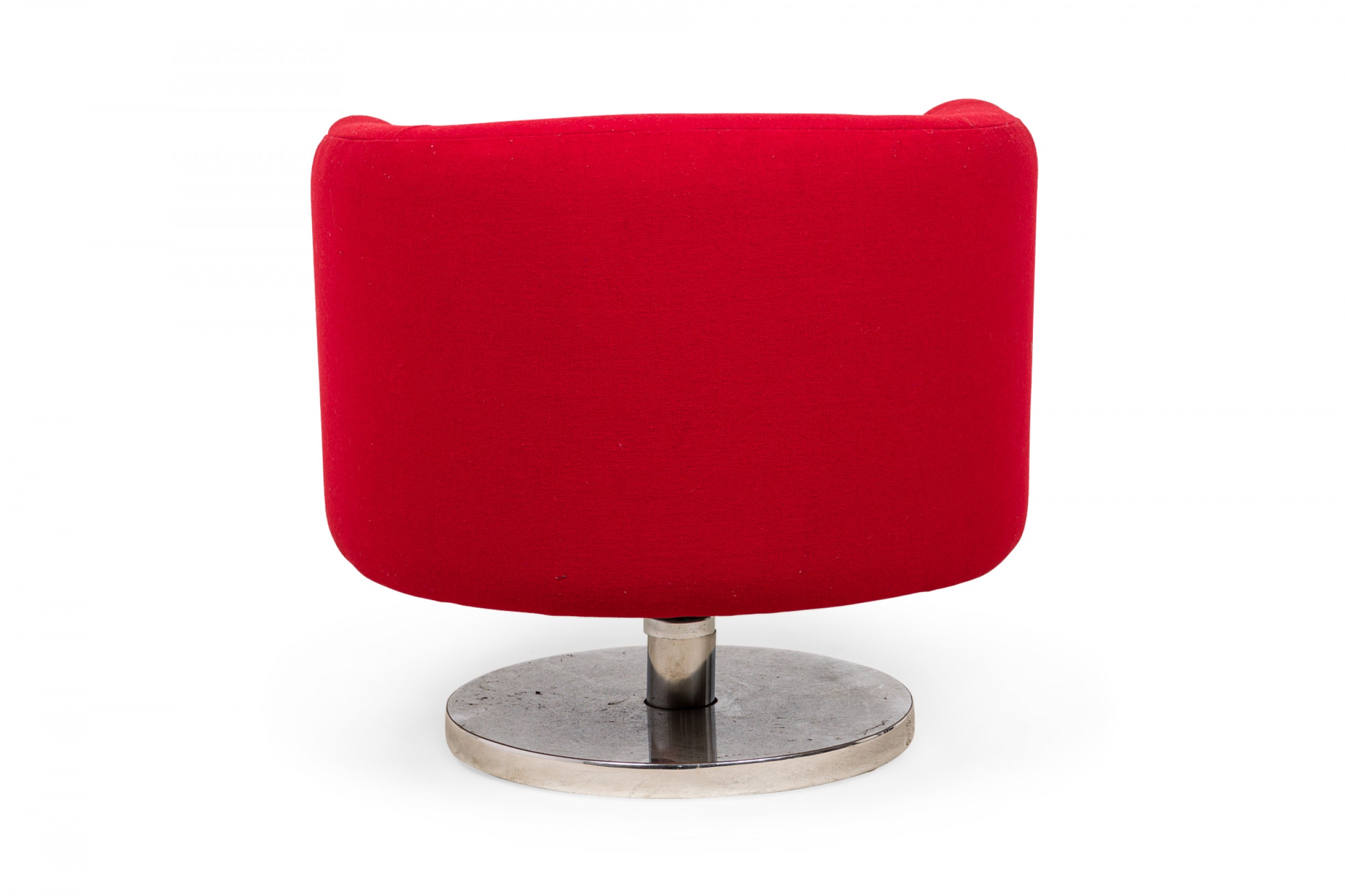 PAIR of American Mid-Century tub form swiveling lounge / armchairs upholstered in bright red fabric and resting on circular chrome swivel bases. (MILO BAUGHMAN)(PRICED AS PAIR)