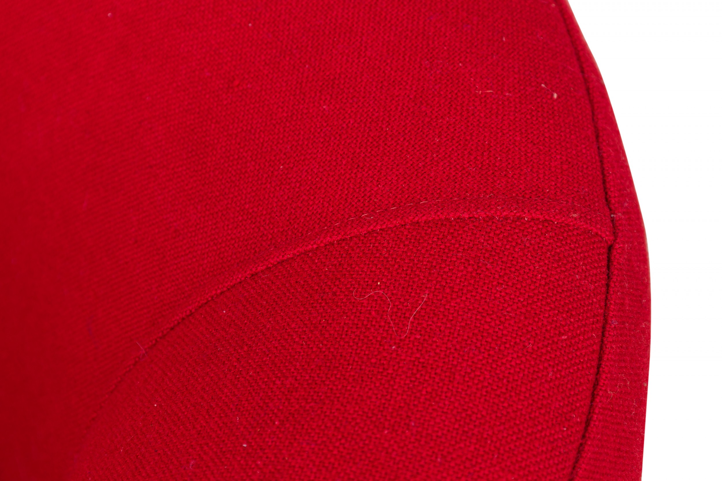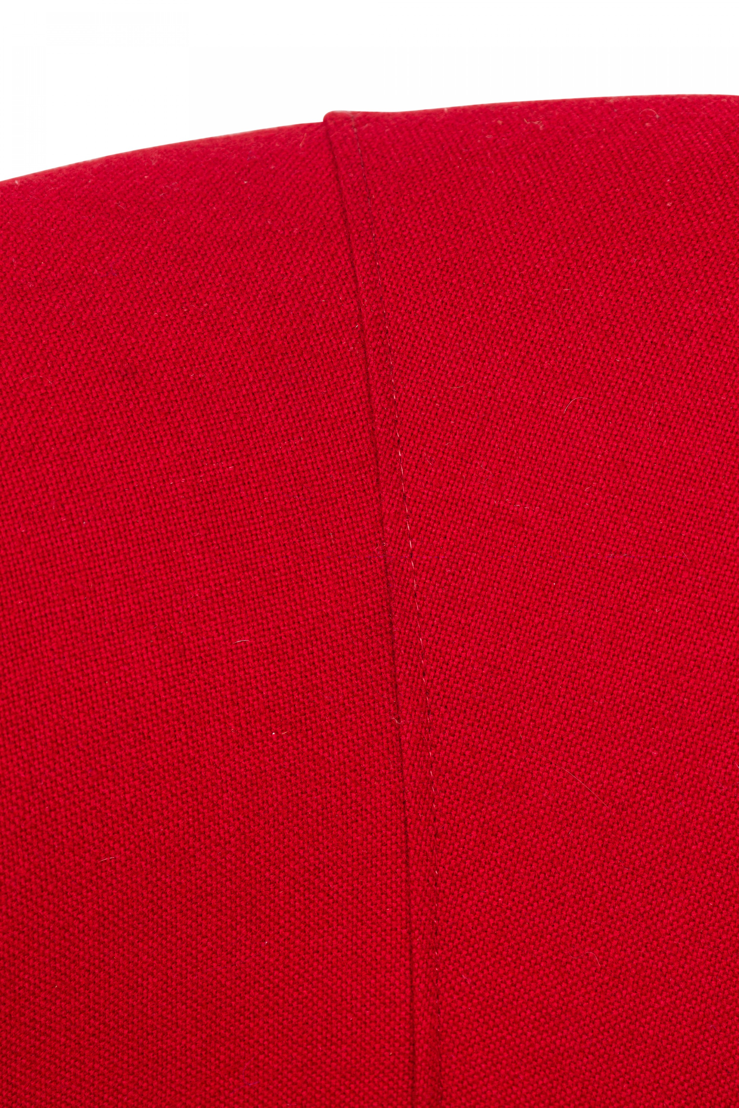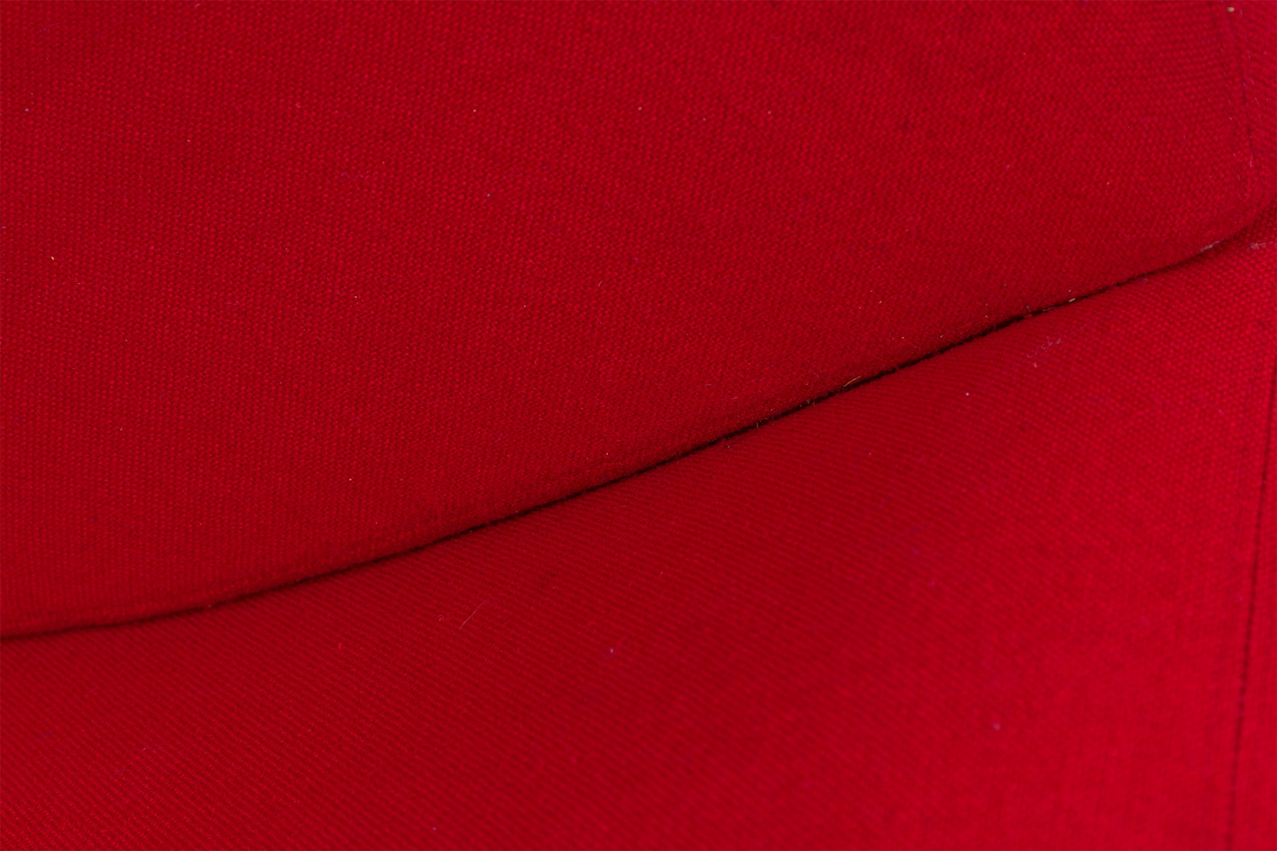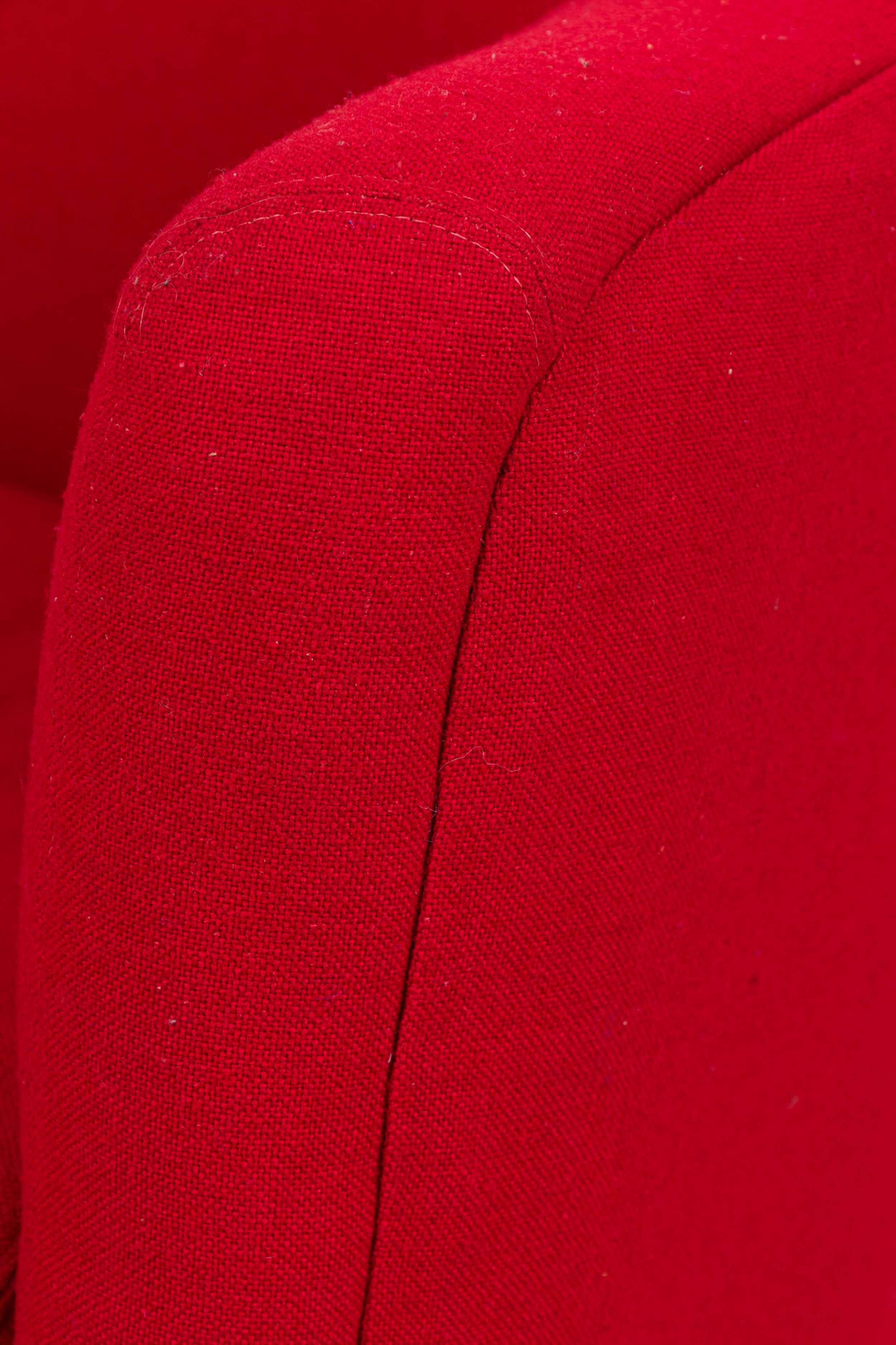 PAIR of American Mid-Century tub form swiveling lounge / armchairs upholstered in bright red fabric and resting on circular chrome swivel bases. (MILO BAUGHMAN)(PRICED AS PAIR)