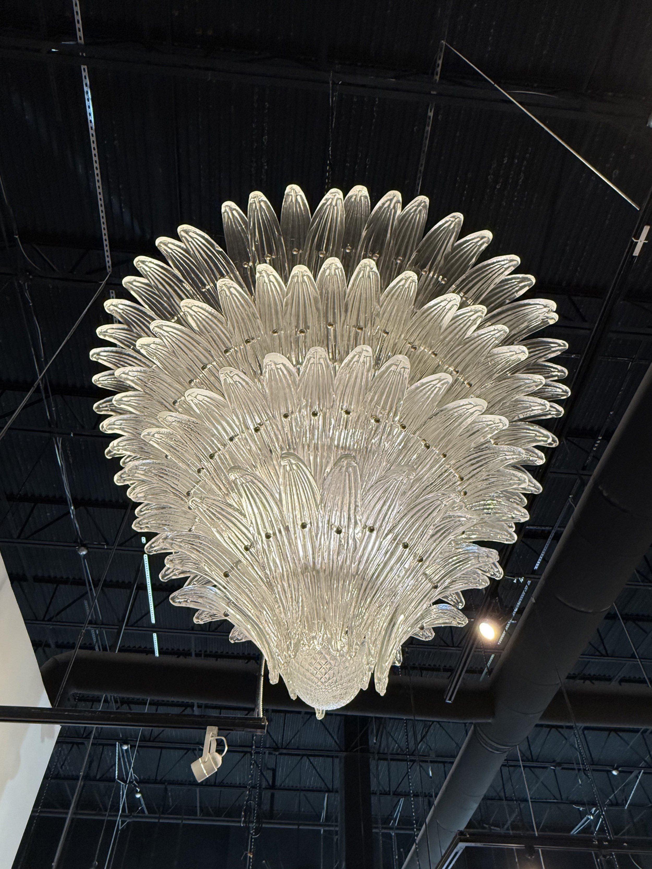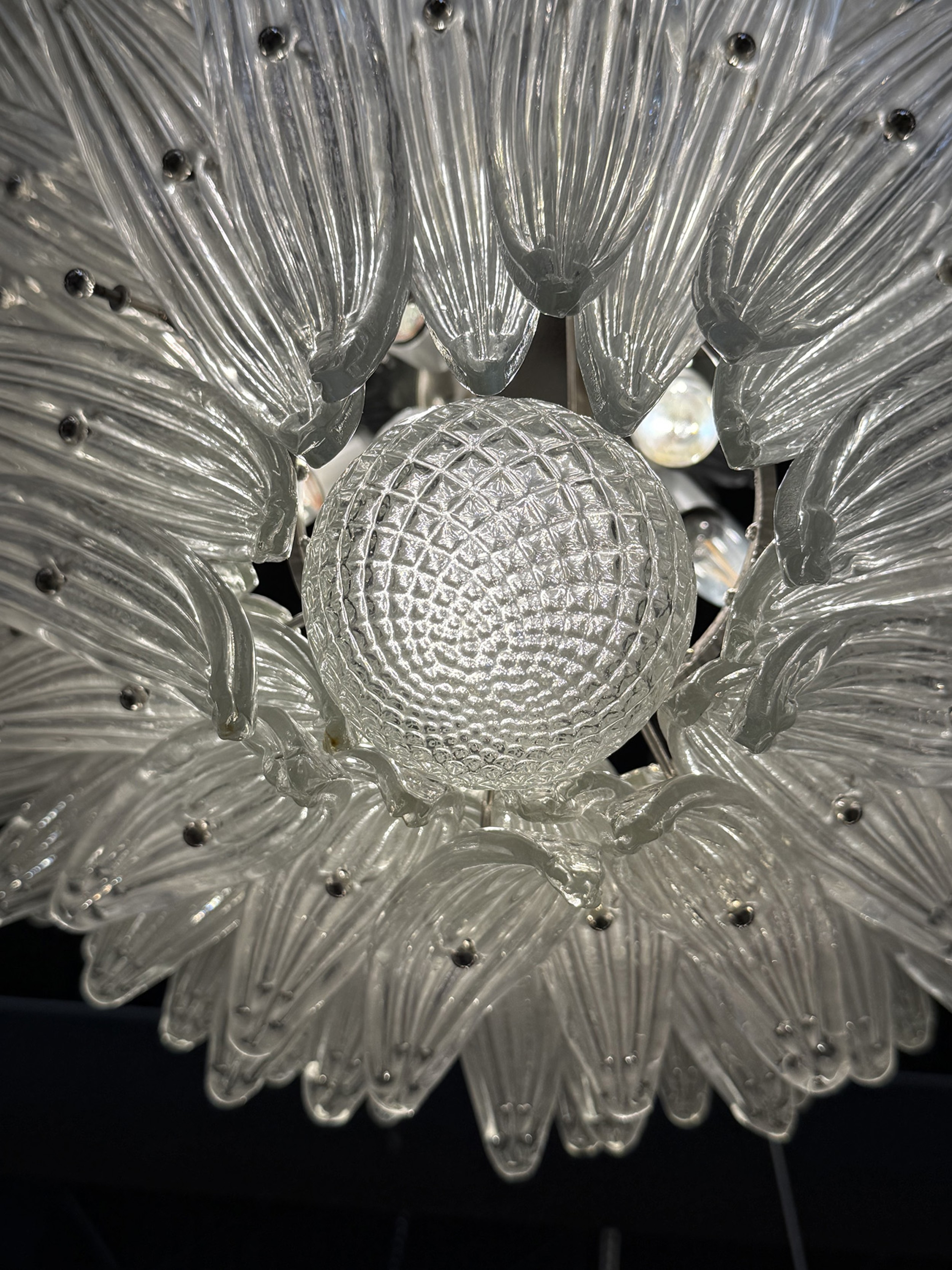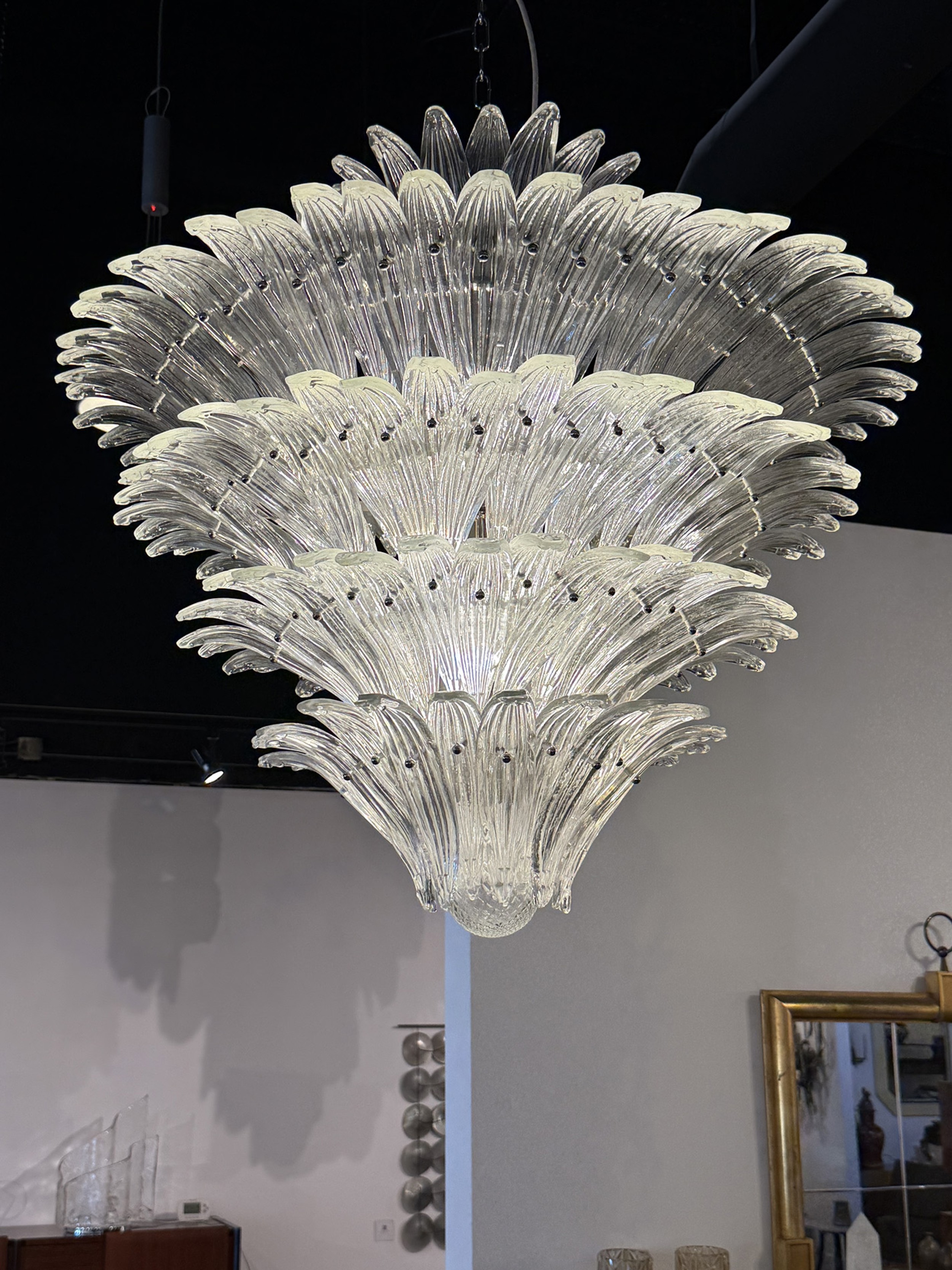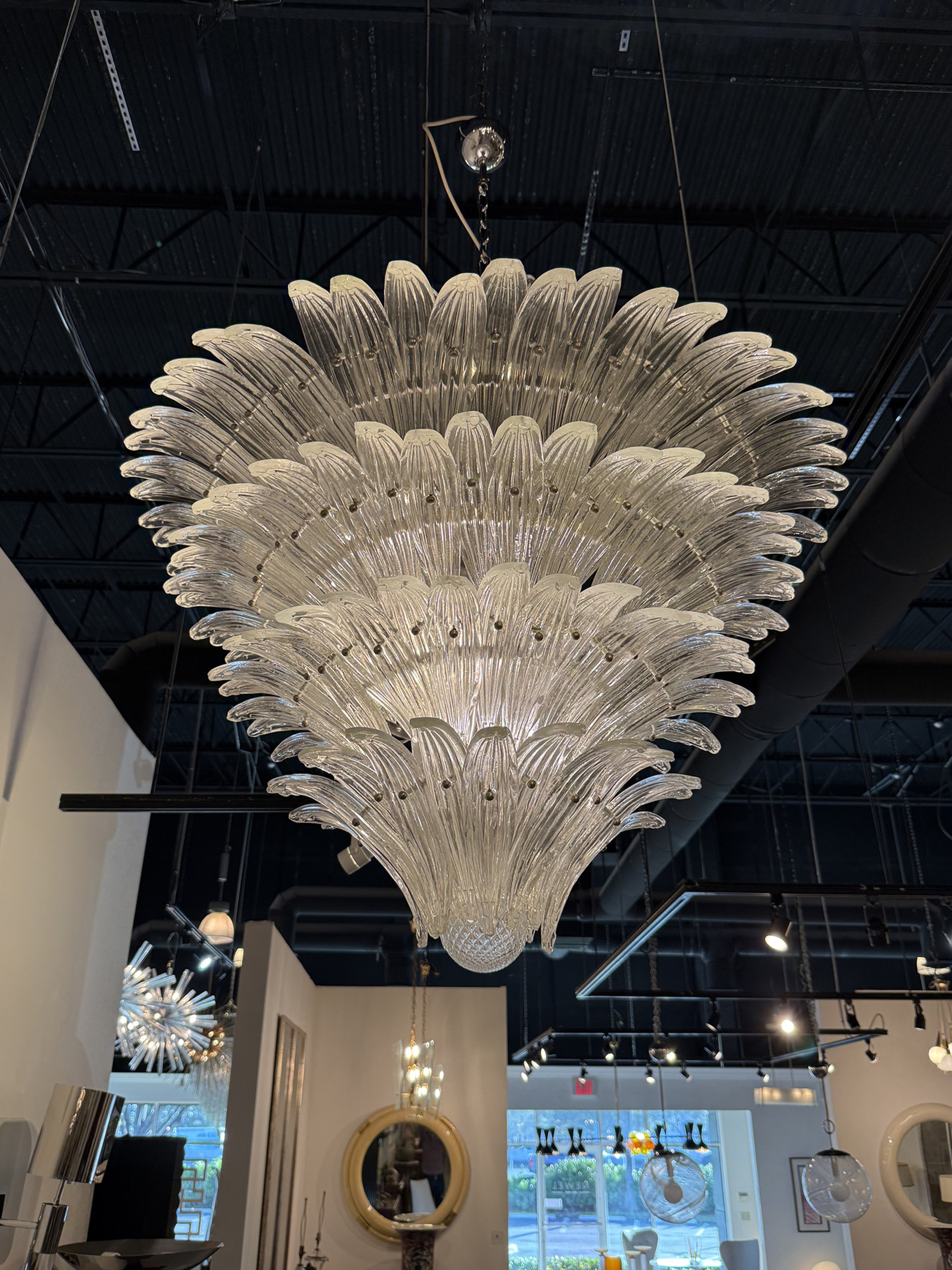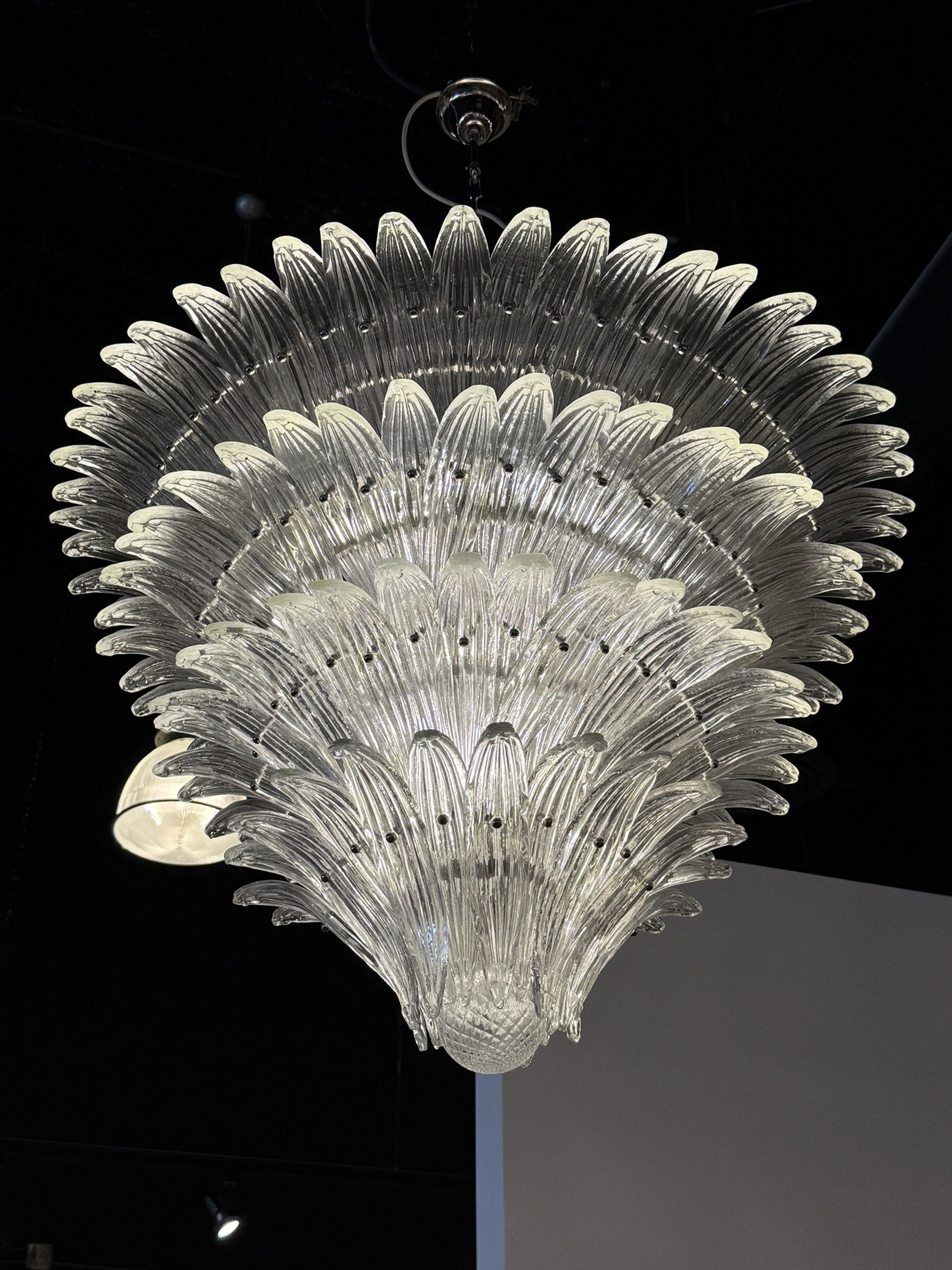 PAIR of large Italian Murano 1960's clear molded glass chandeliers with a 4-tier flared design with leaf form panes and ending with a ball finial pendent (PRICED AS PAIR)
