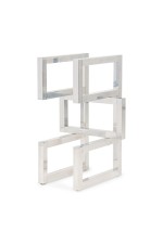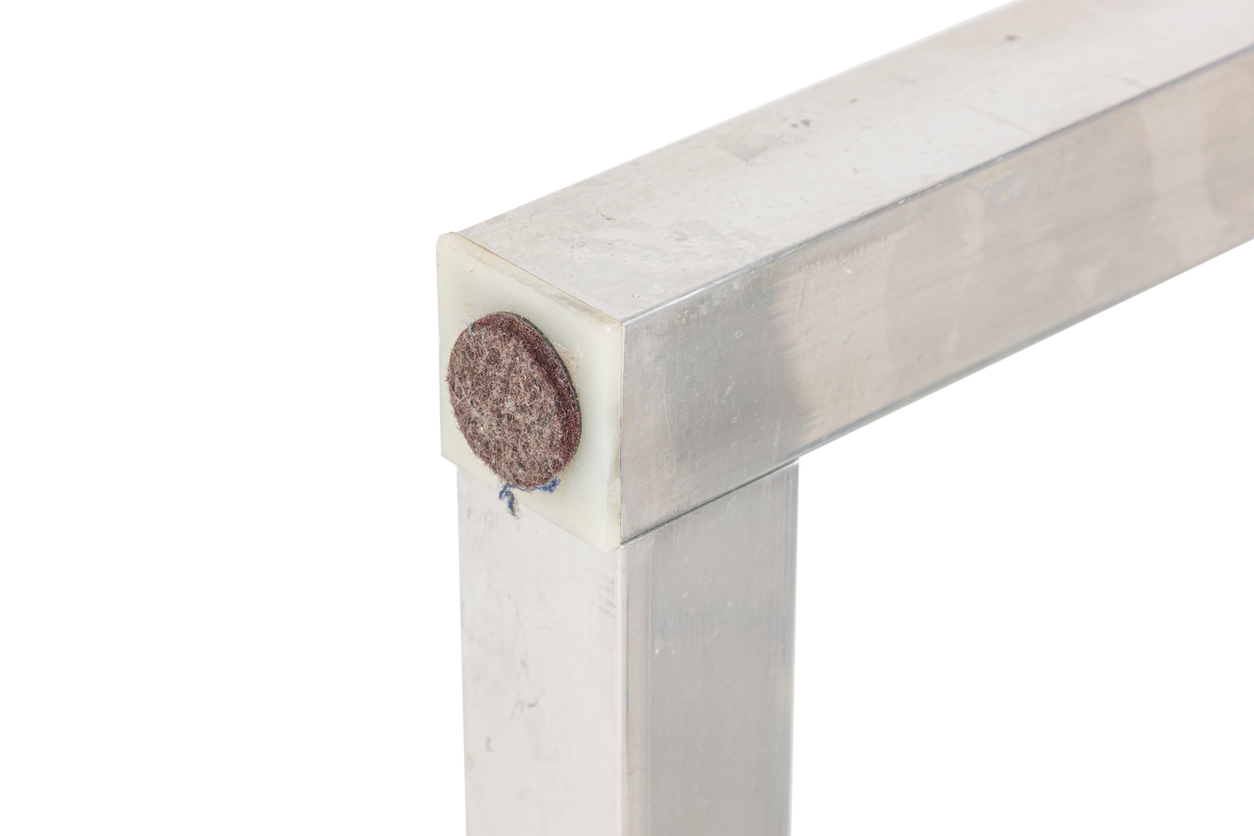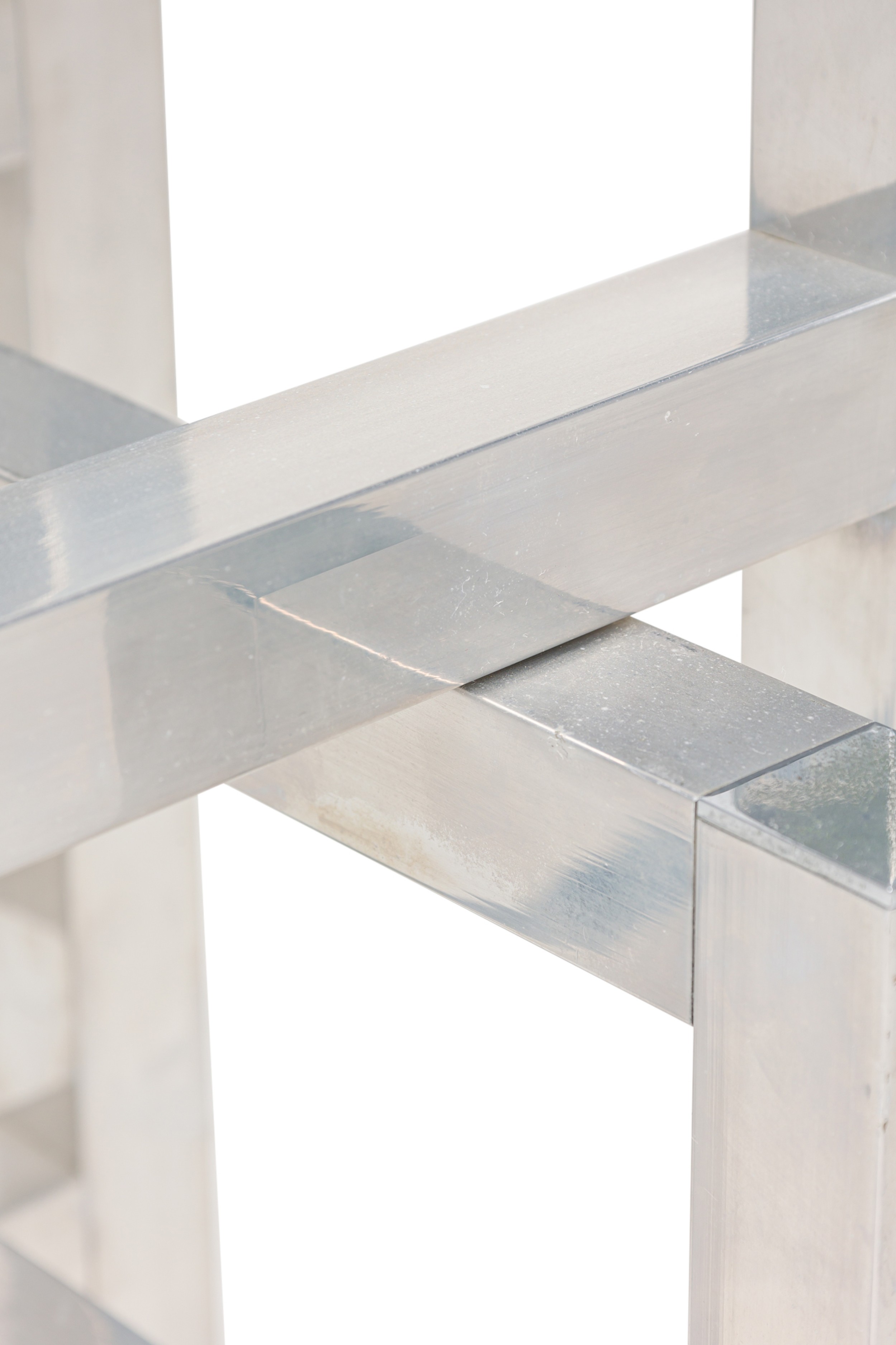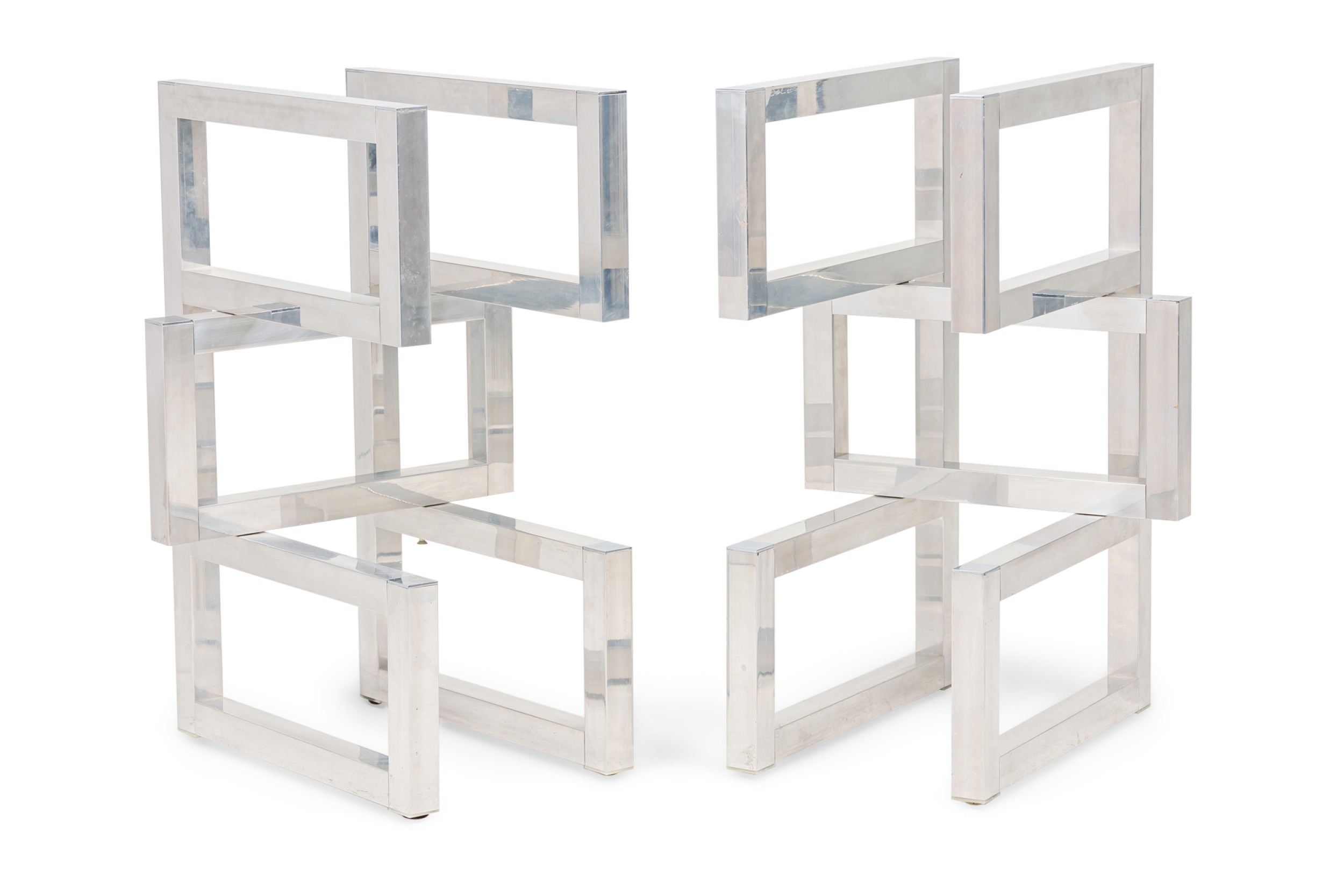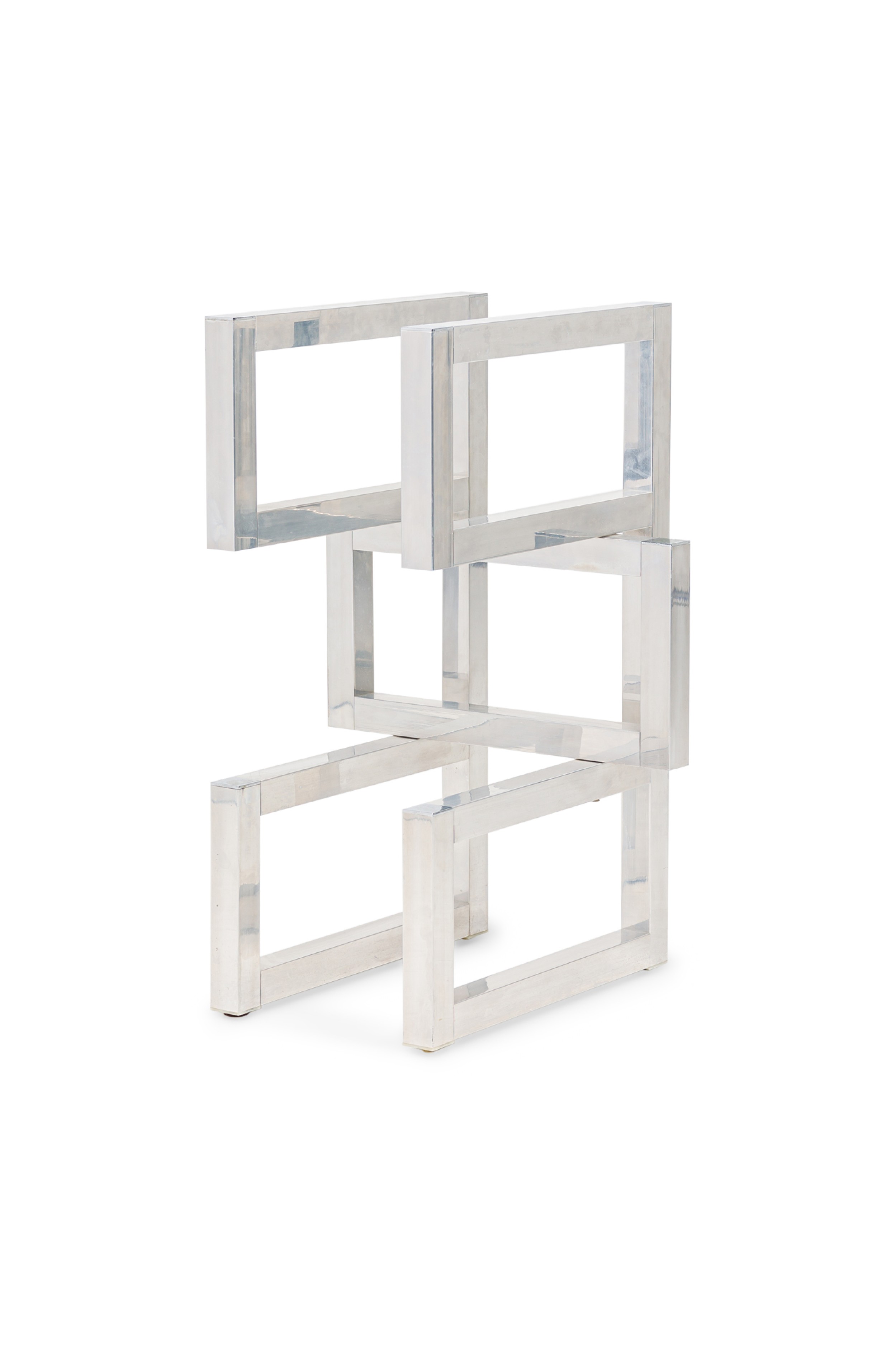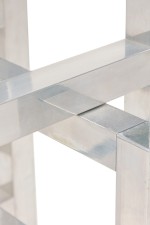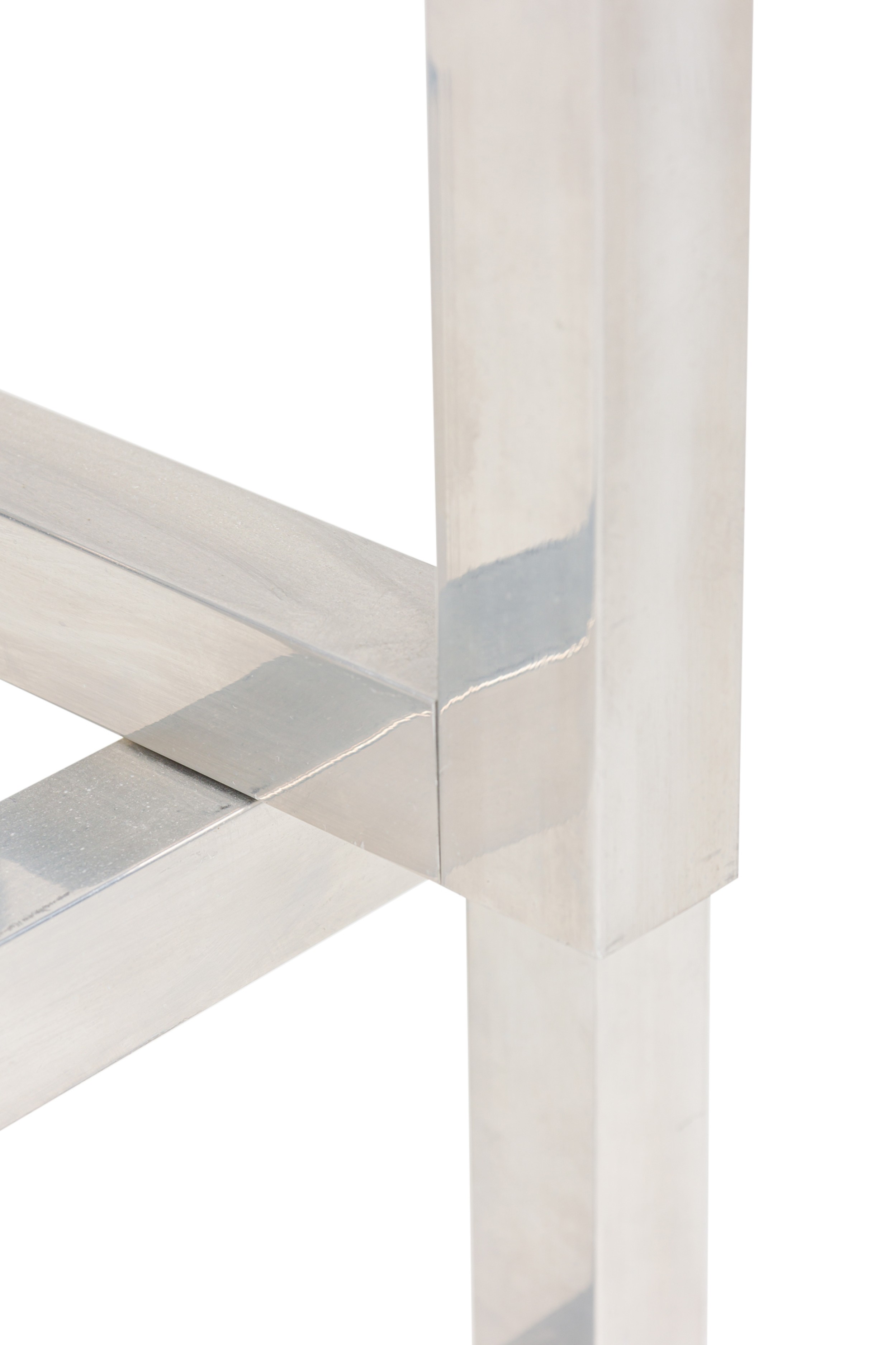 ***MISSING GLASS TOP*** Mid-Century American Modern chrome reticulated console table having a pair of bases in trapezoidal form. (PAUL MAYEN)
