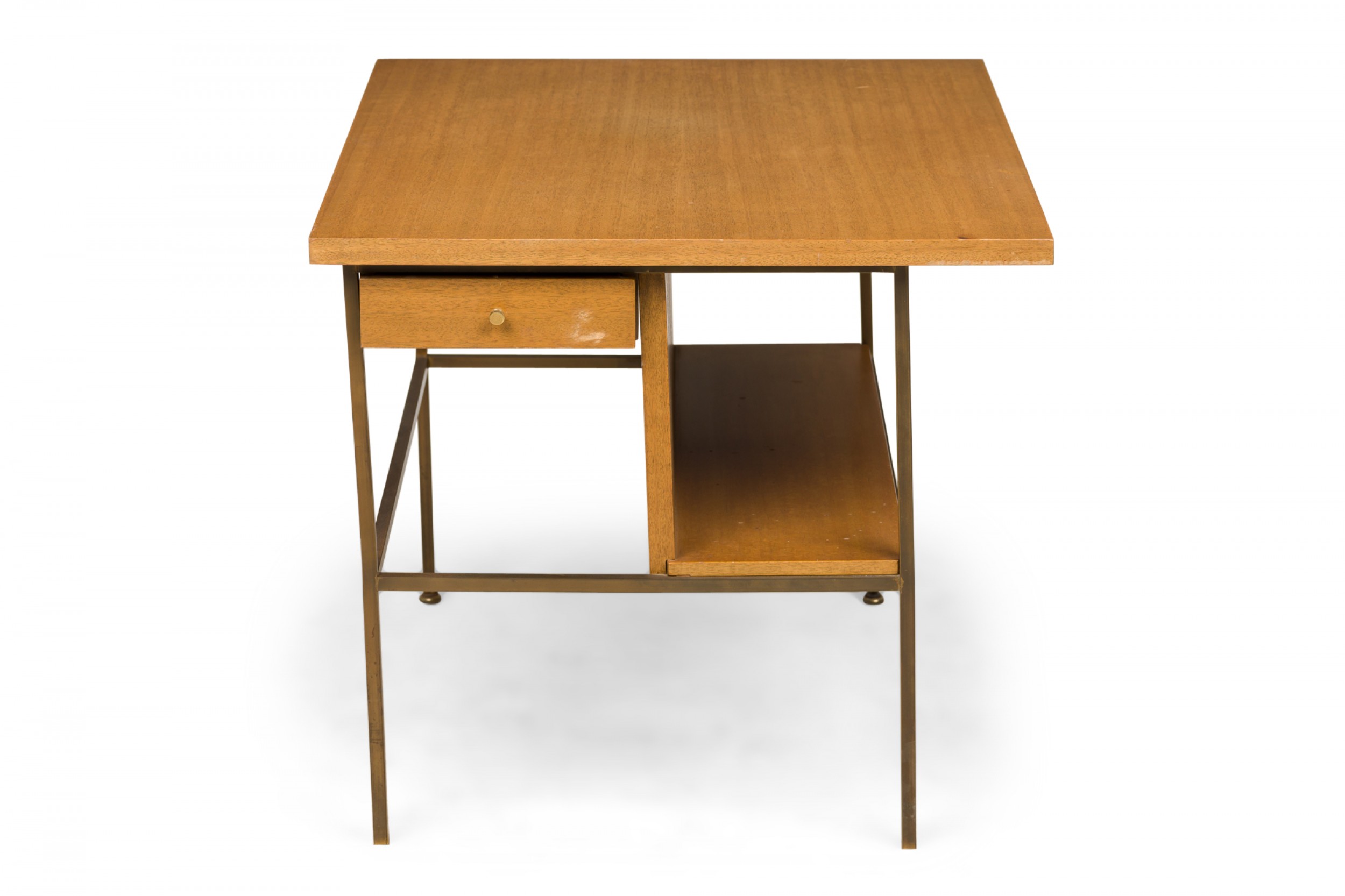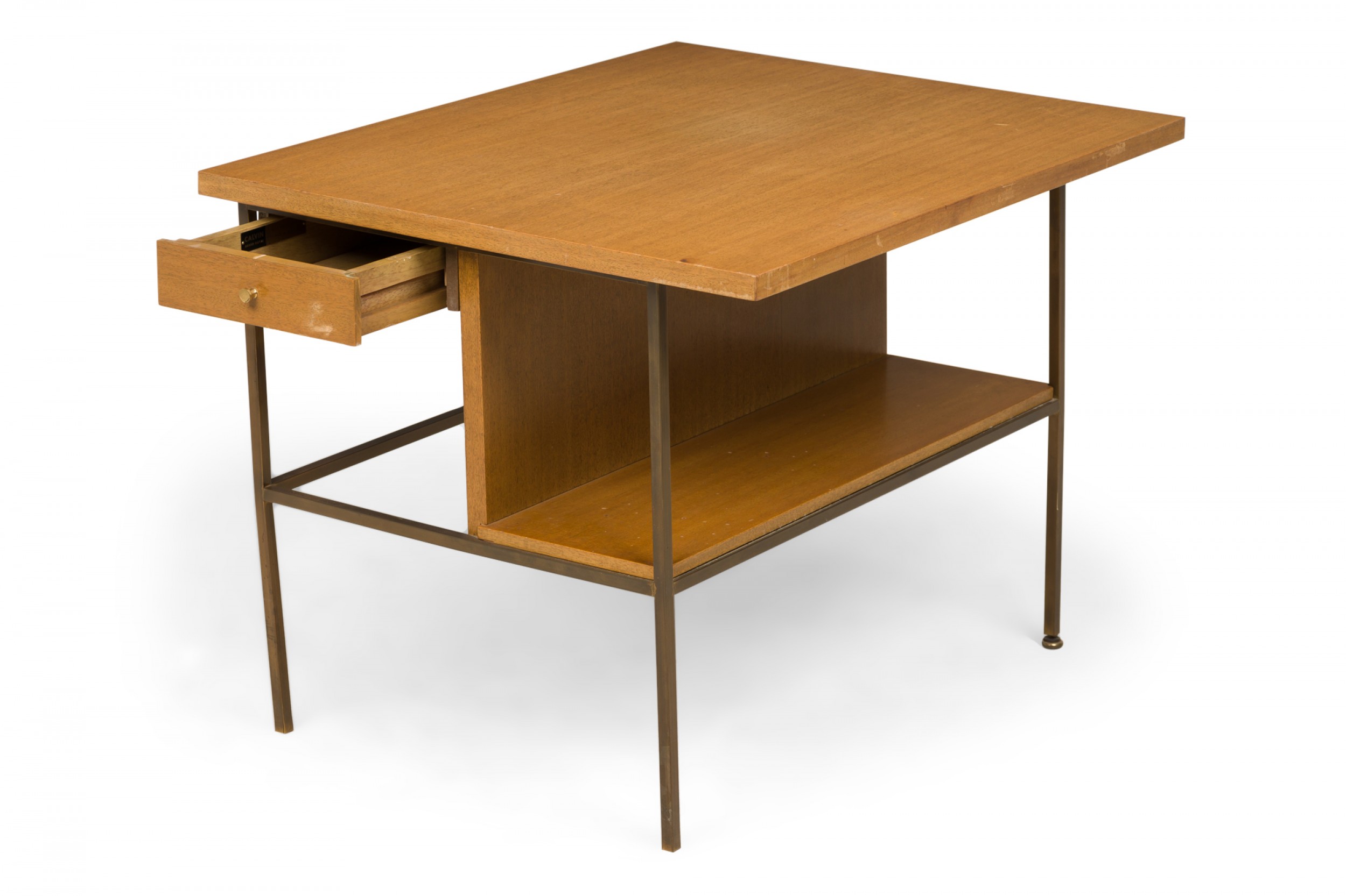 American Mid-Century end / side table with an off-center blonde wood top supported by a brass frame with a small drawer with brass pull to one side, offset by a wooden bracket shelf on the opposite side. (PAUL MCCOBB FOR CALVIN FURNITURE COMPANY, IRWIN COLLECTION)