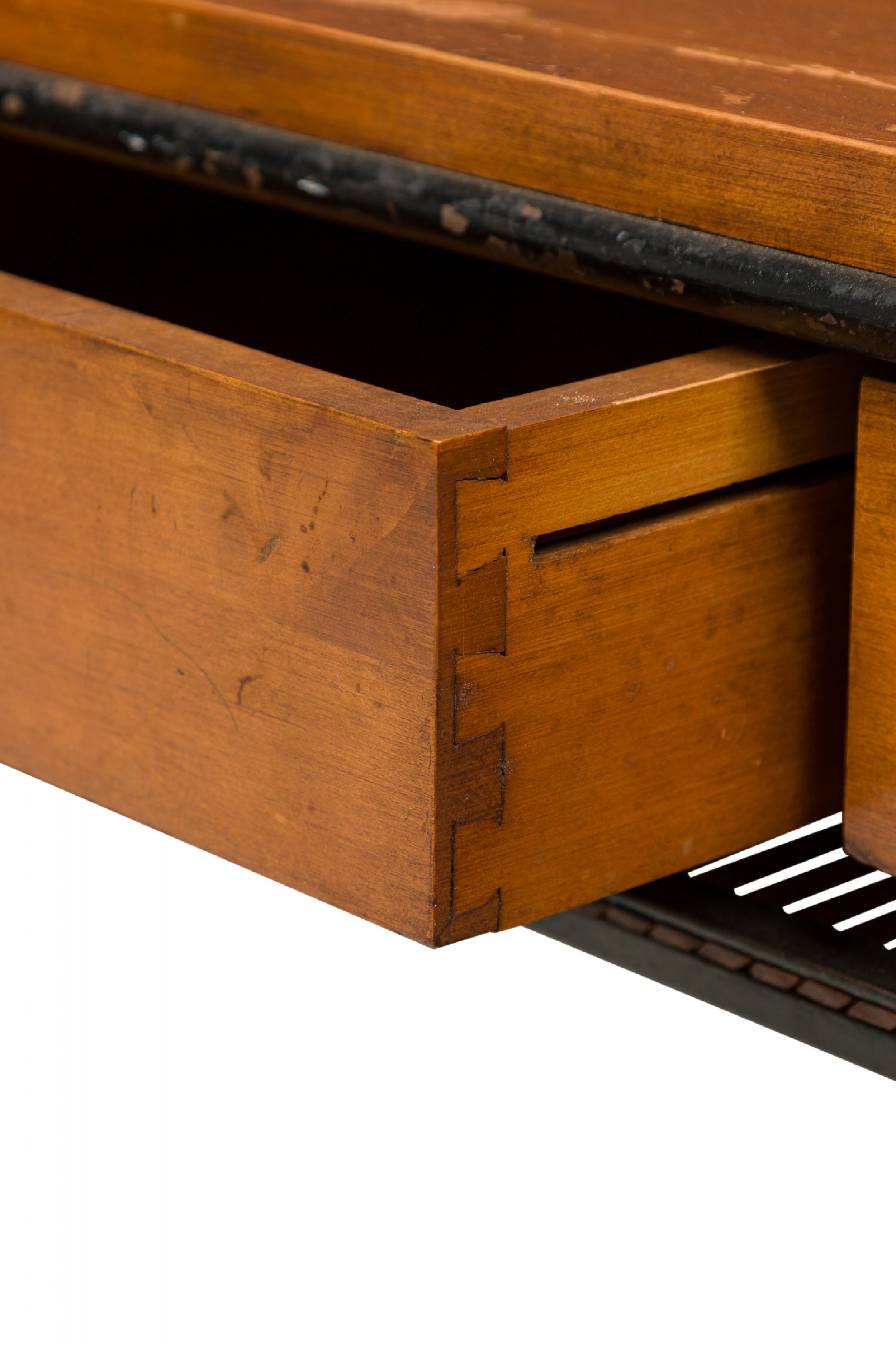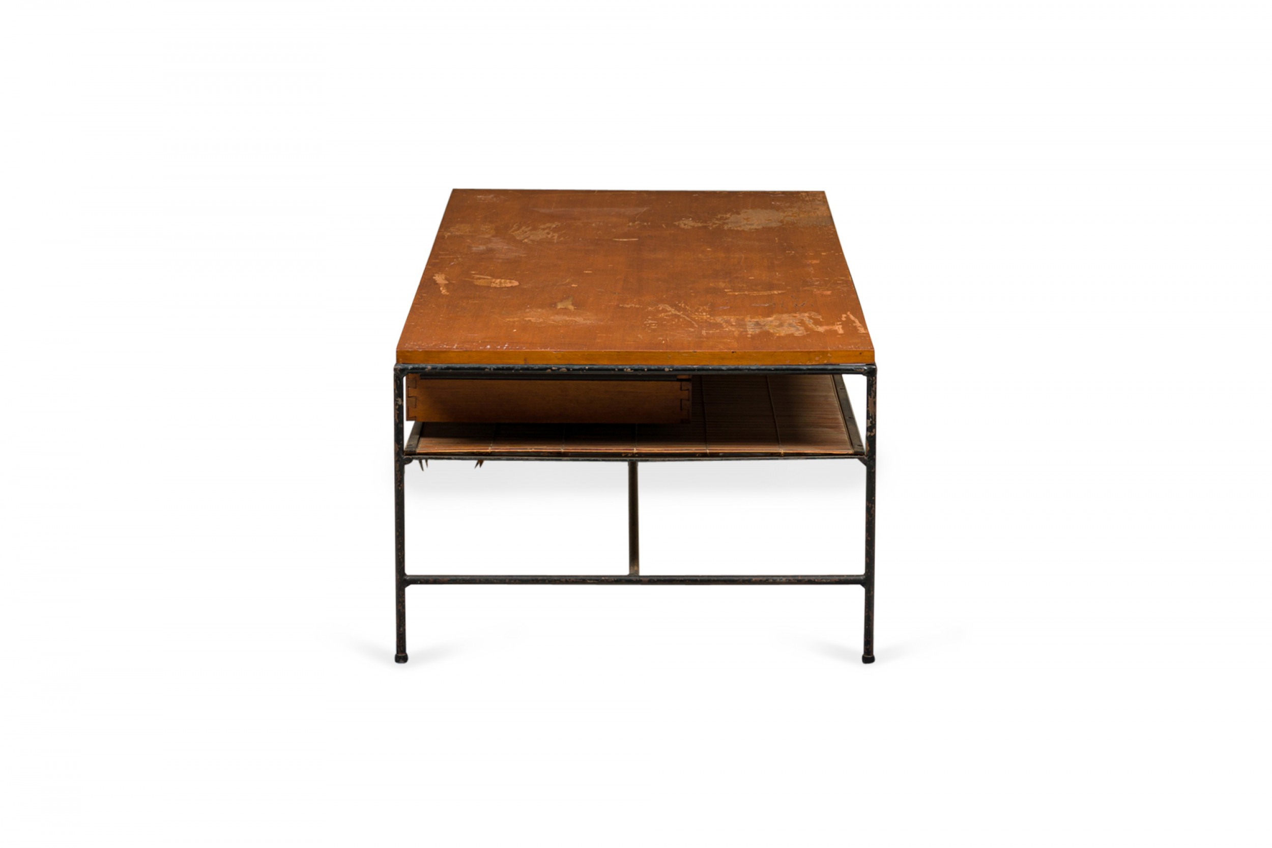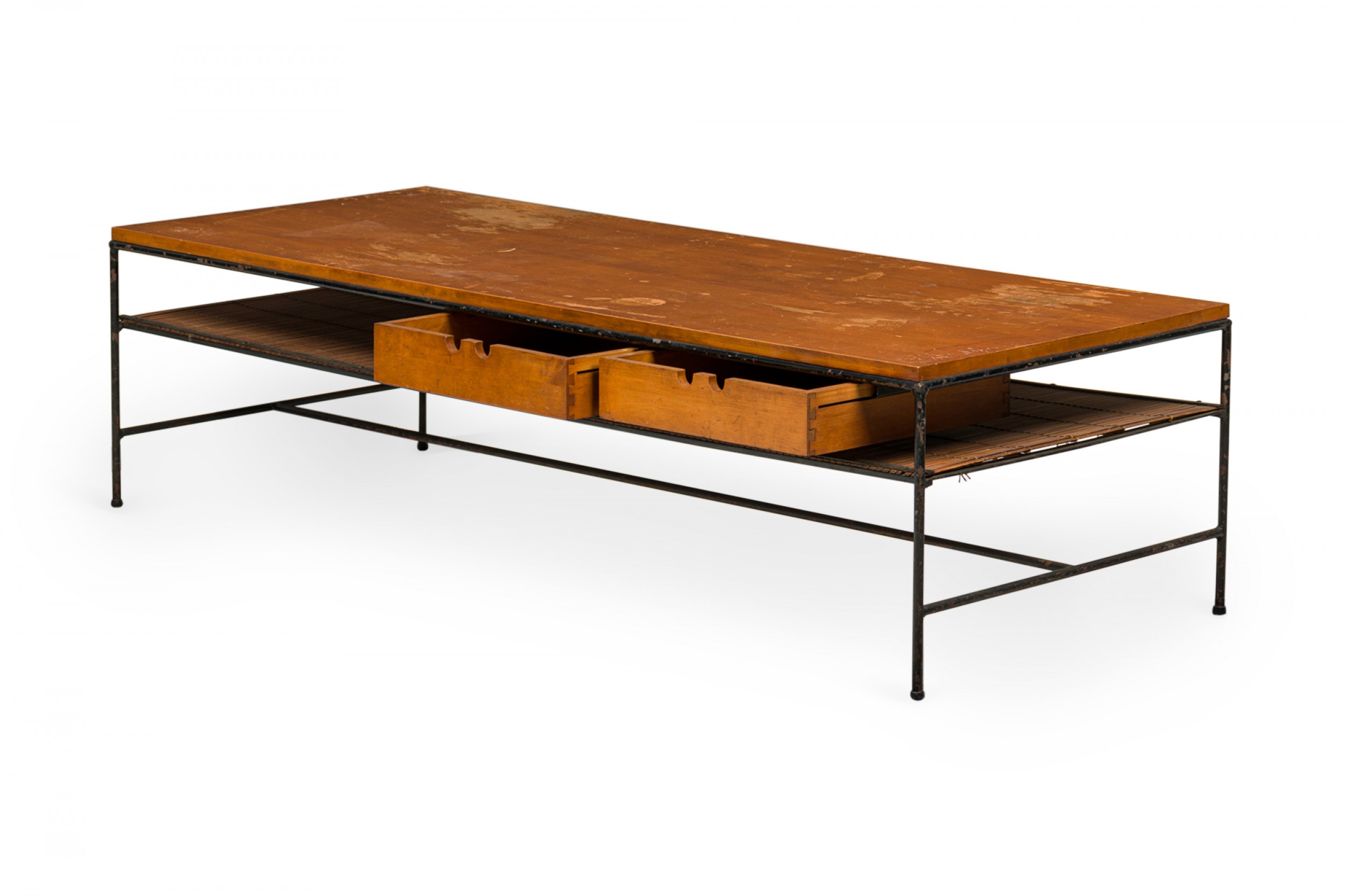 American Mid-Century 'Planner' coffee / cocktail table with a rectangular wooden top with two drawers and a shallow shelf below, supported by a black iron frame with a stretcher base. (PAUL MCCOBB FOR WINCHENDON FURNITURE COMPANY)(Similar table: DUF0769)