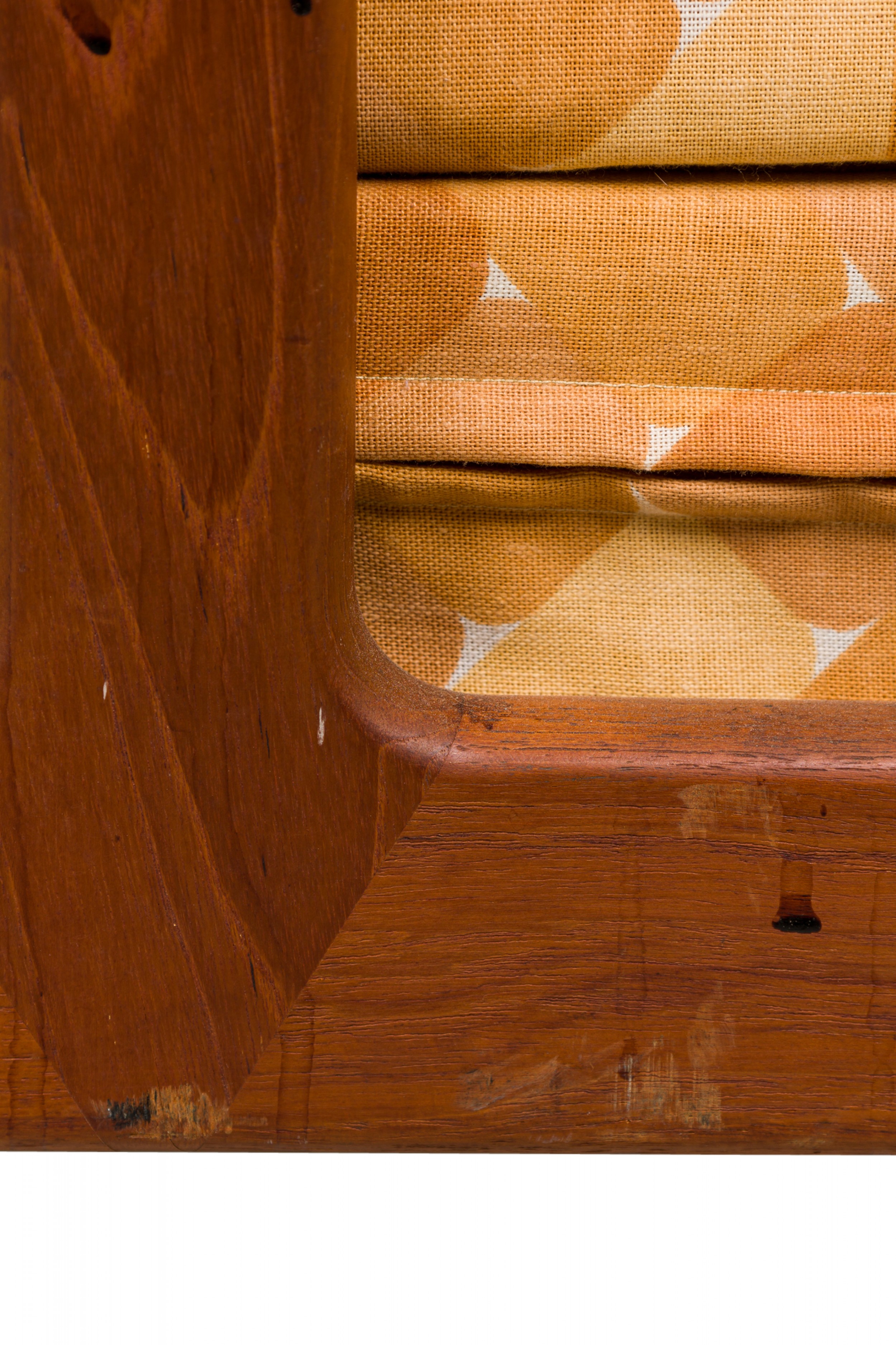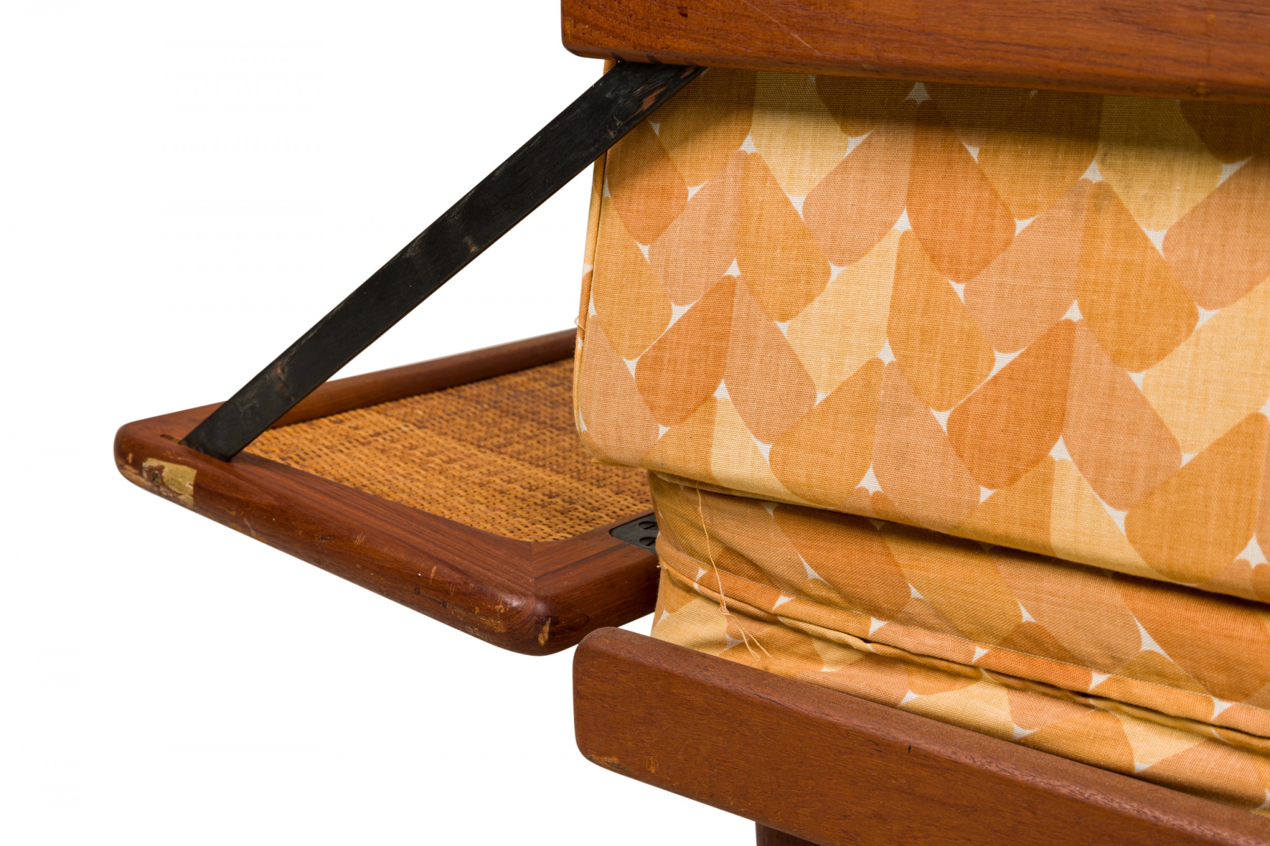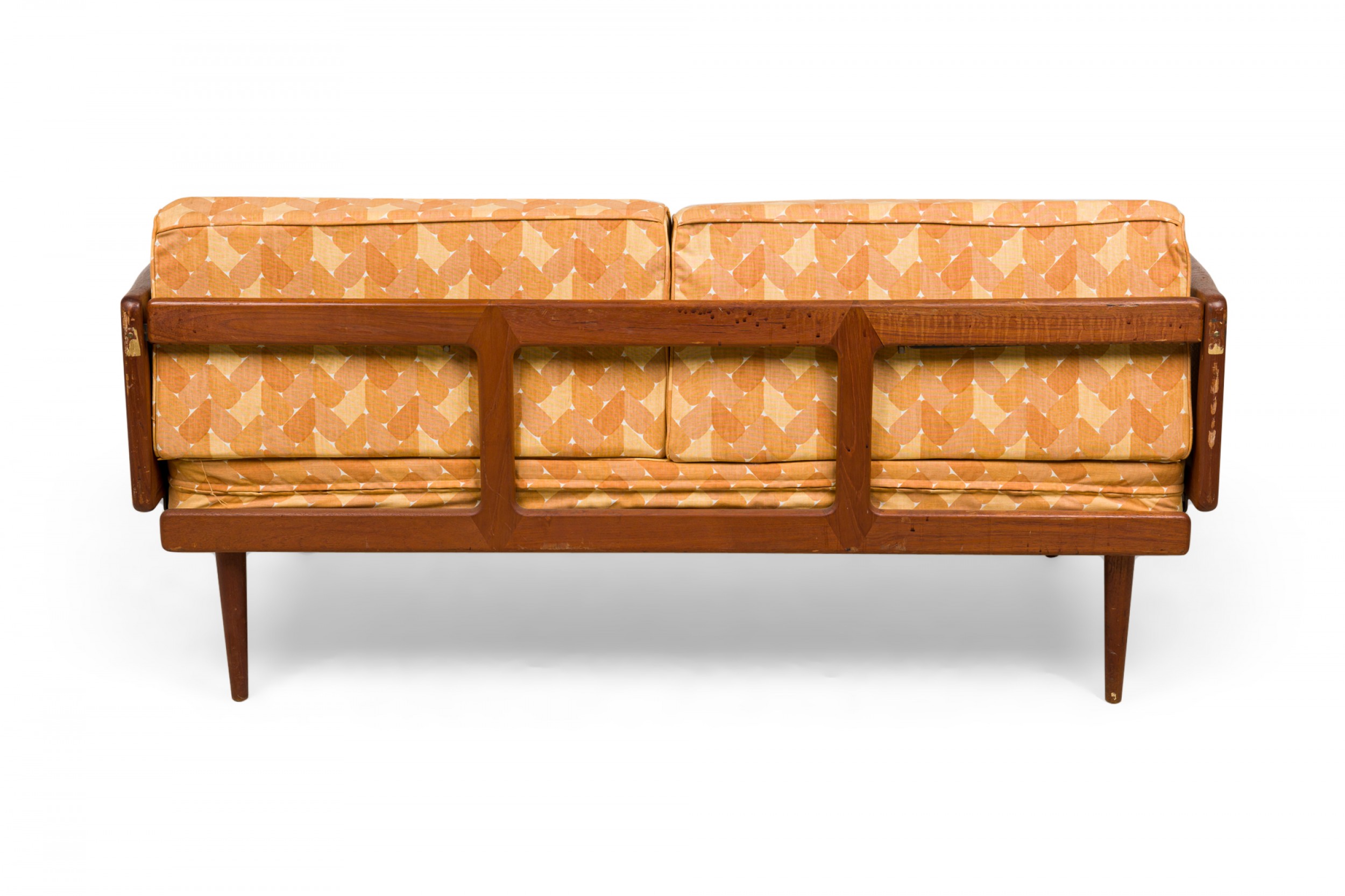Danish Mid-Century expandable sleeper settee with a teak wood frame with caned sides, a solid seat cushion and two wedge-shaped removable back cushions in light and dark gold patterned upholstery, with hinged arms that fold down to create and extended sleeping space accommodated by moving the back cushions. (PETER HVIDT)