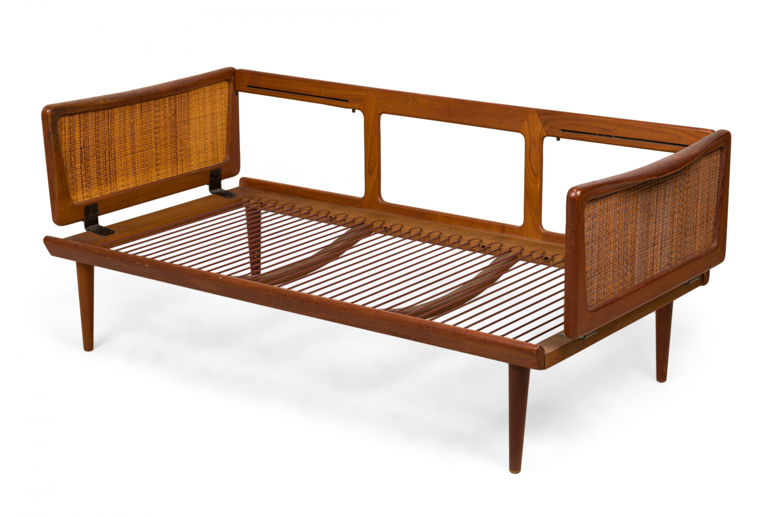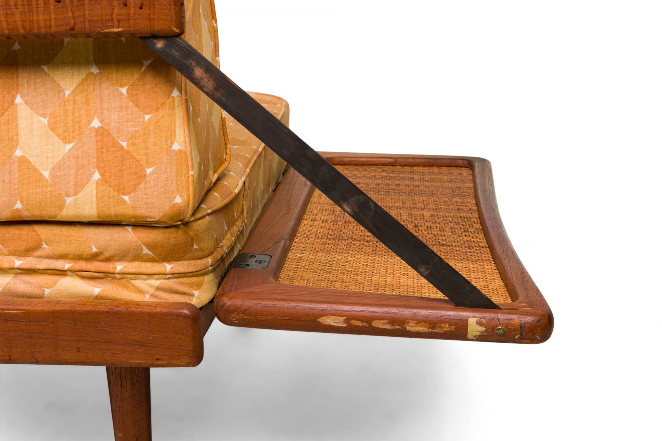 Danish Mid-Century expandable sleeper settee with a teak wood frame with caned sides, a solid seat cushion and two wedge-shaped removable back cushions in light and dark gold patterned upholstery, with hinged arms that fold down to create and extended sleeping space accommodated by moving the back cushions. (PETER HVIDT).