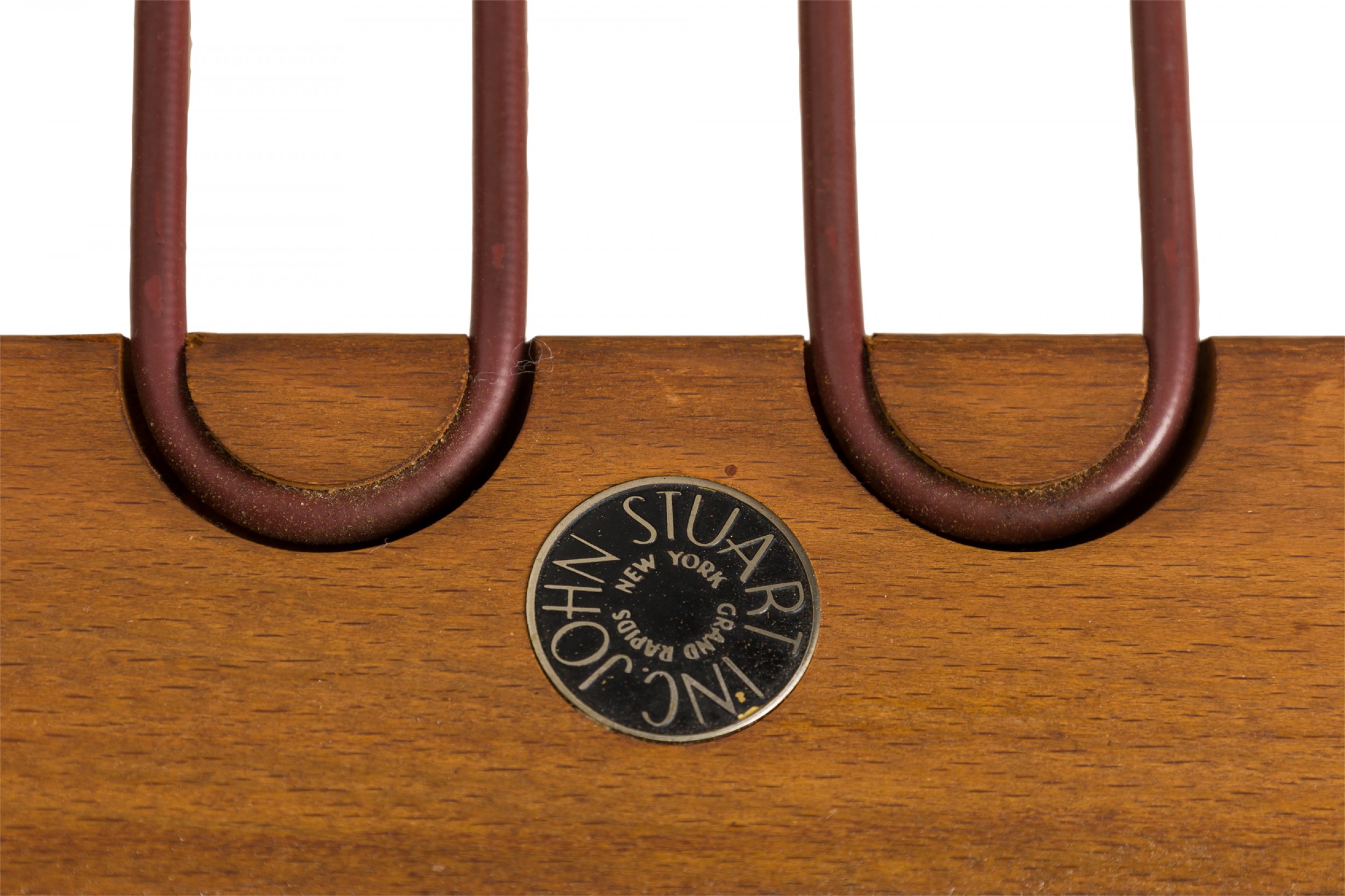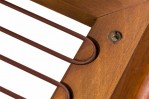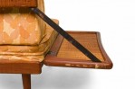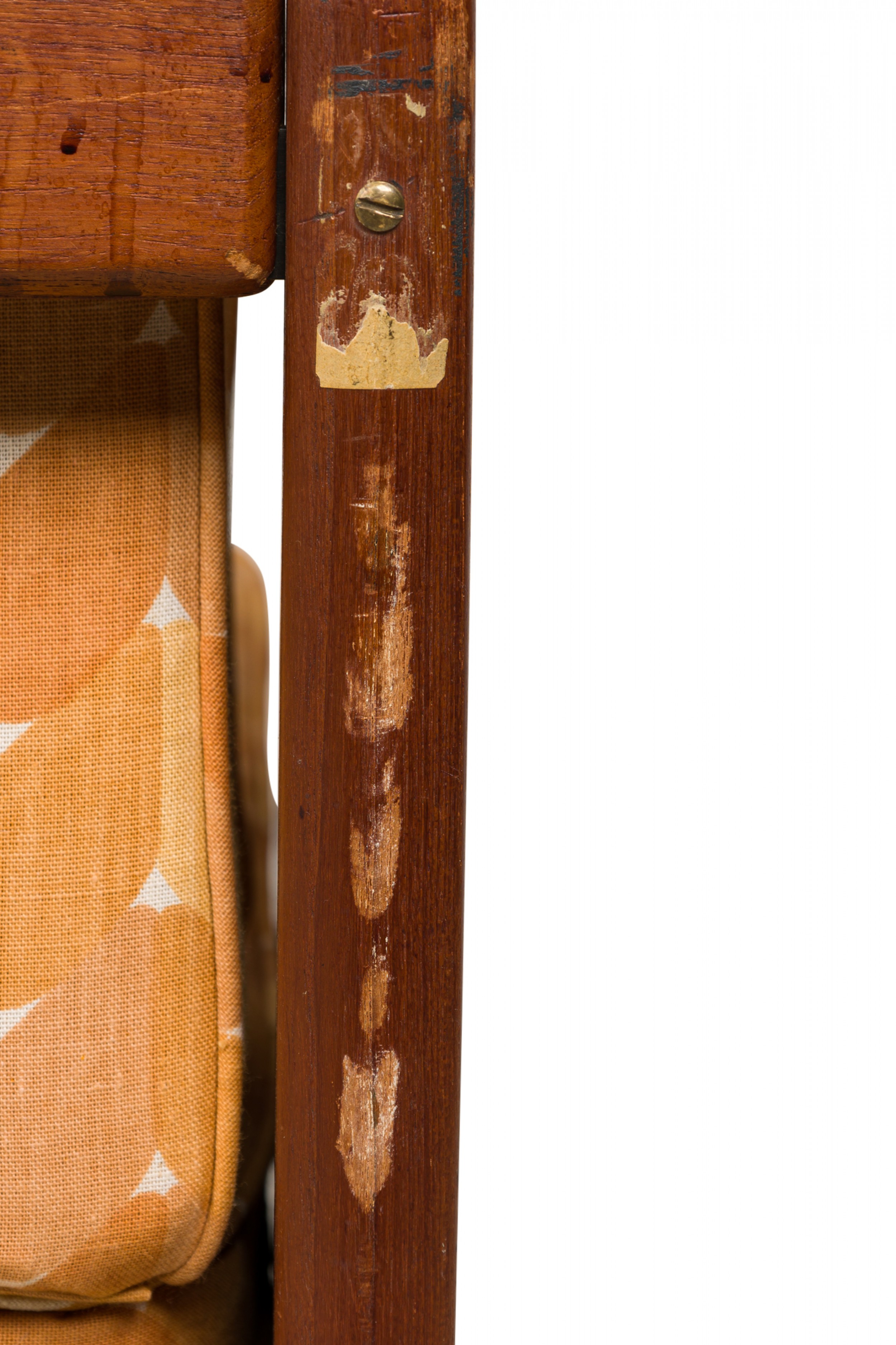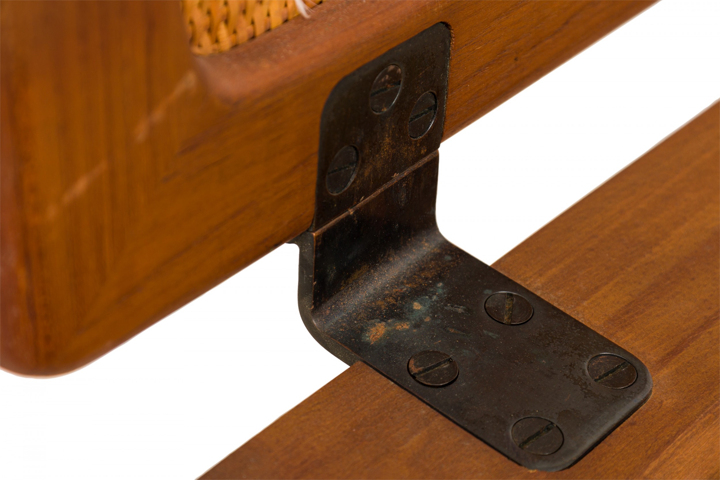 Style: Mid-Century Materials & Techniques: Caning, fabric, teak, upholstered, wood Category: Seating Condition: Damage to metal arms attached to extendable arms. Arms are still functional. Good; Minor losses