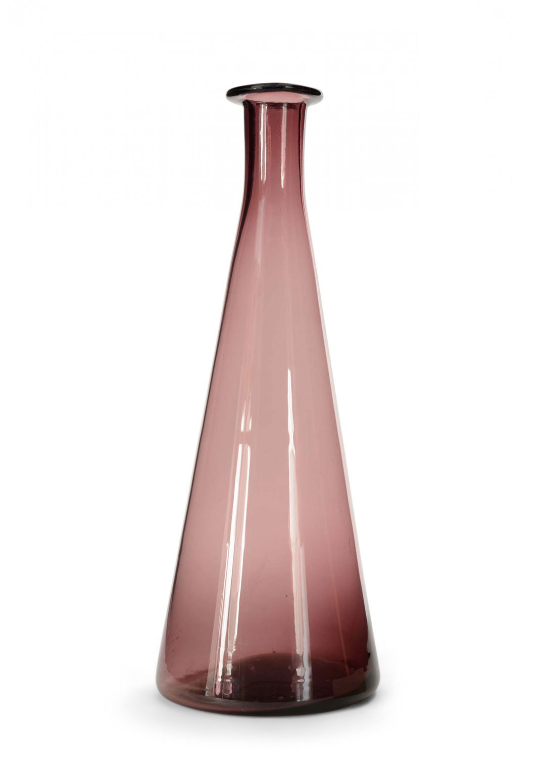 Tall tapered plum color tinted blown glass bud vase with a flat rim.