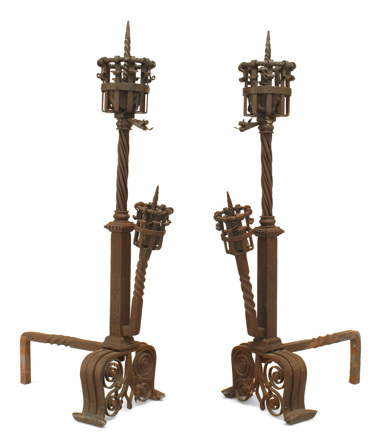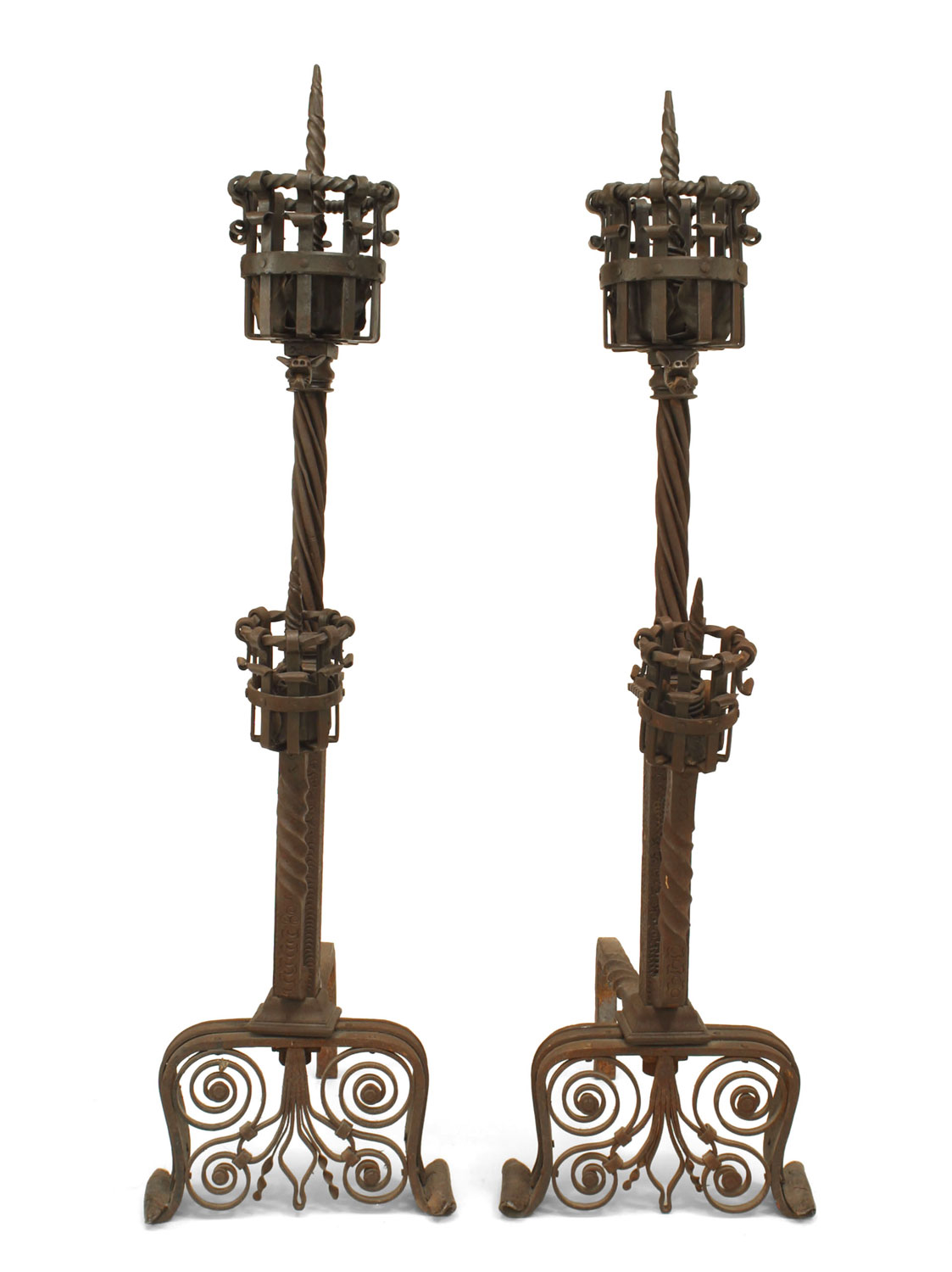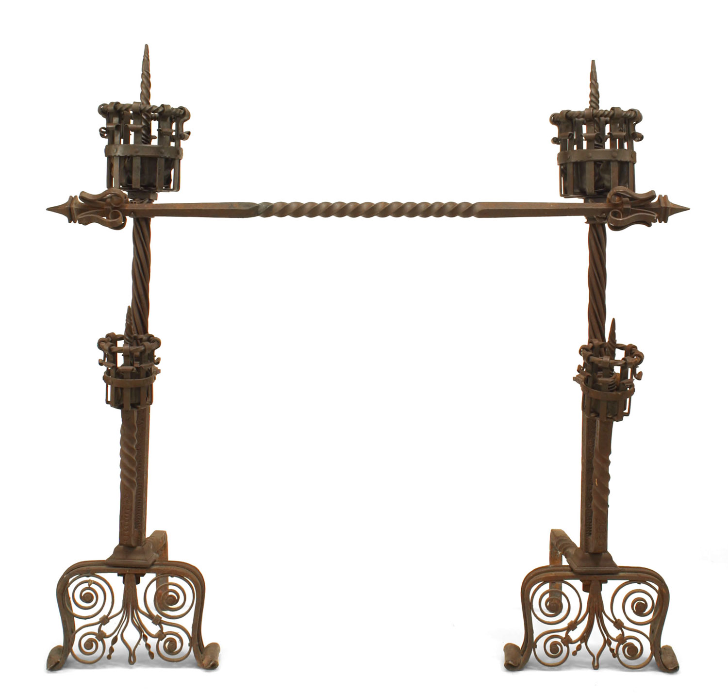 PAIR of Italian Renaissance-style wrought iron andirons with an upper and lower spike & basket design with open scroll base & griffins supporting a cross bar (Attributed to SAMUEL YELLIN) (PRICED AS PAIR)