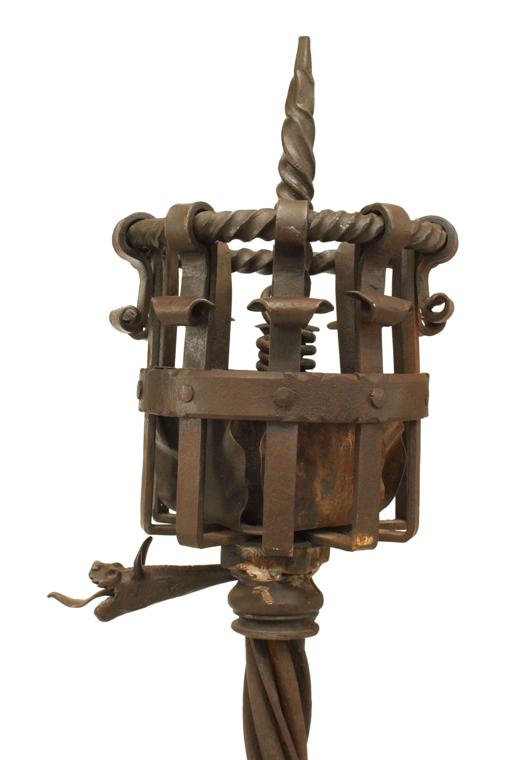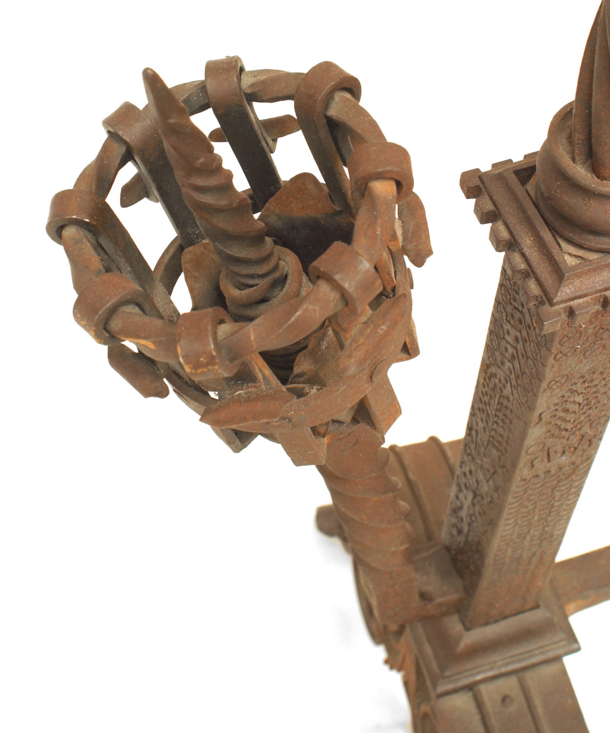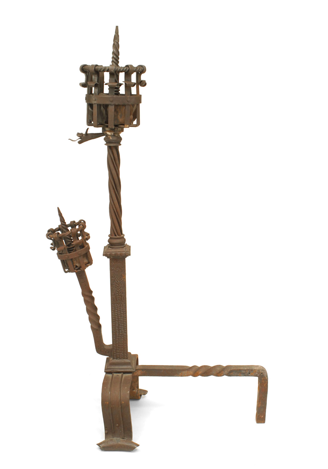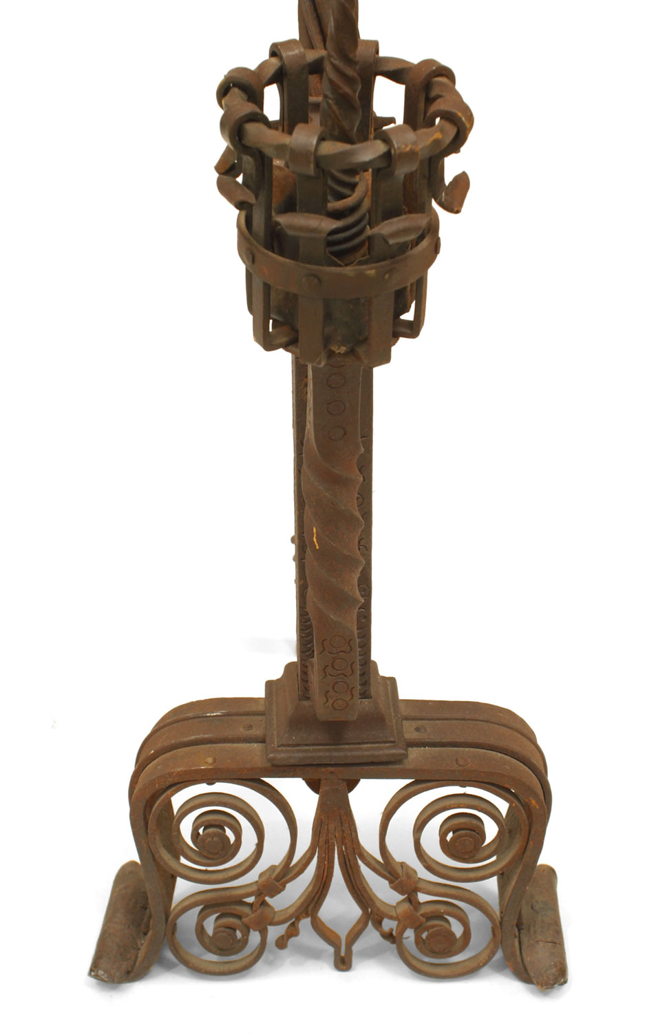 PAIR of Italian Renaissance-style wrought iron andirons with an upper and lower spike & basket design with open scroll base & griffins supporting a cross bar (Attributed to SAMUEL YELLIN) (PRICED AS PAIR)