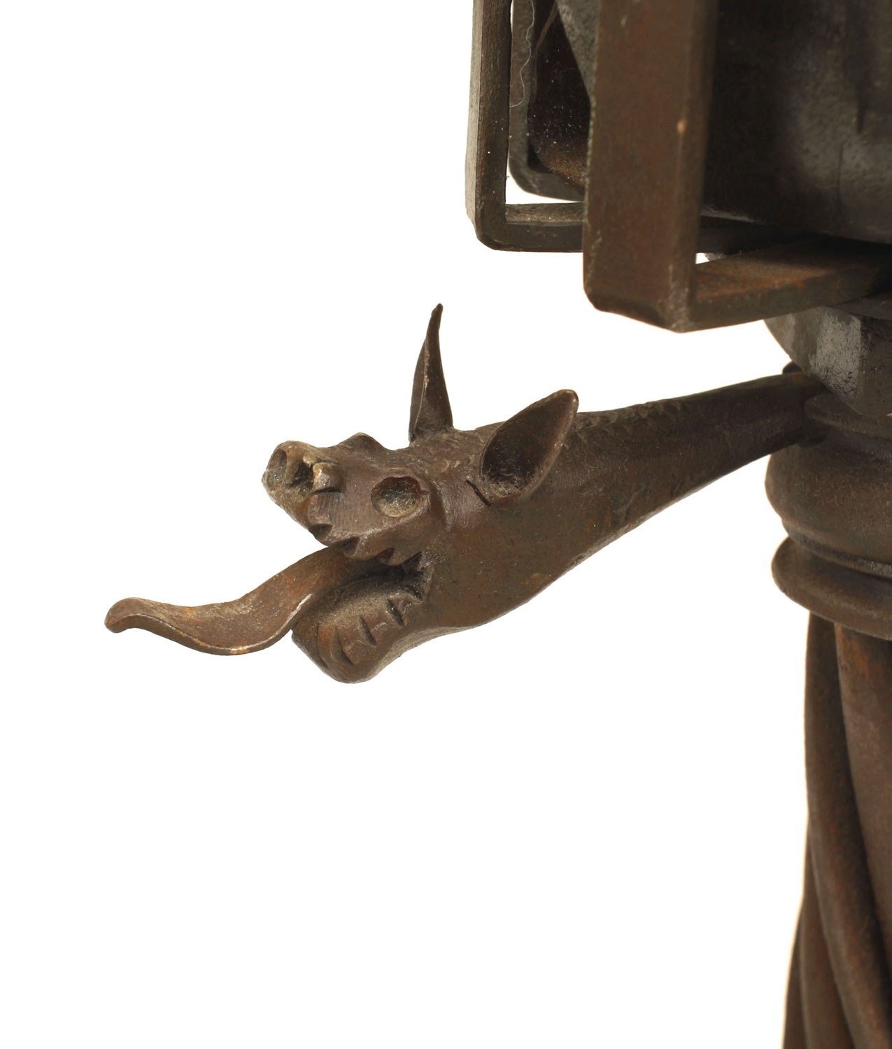 PAIR of Italian Renaissance-style wrought iron andirons with an upper and lower spike & basket design with open scroll base & griffins supporting a cross bar (Attributed to SAMUEL YELLIN) (PRICED AS PAIR).