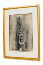 Contemporary American charcoal features study of one figure, primarily a sculptor contemplatIng on his sculptures that represent a column like figure with a design element and a human femur simultaneously in a gold frame (Signed recto: MAJOROWICZ).