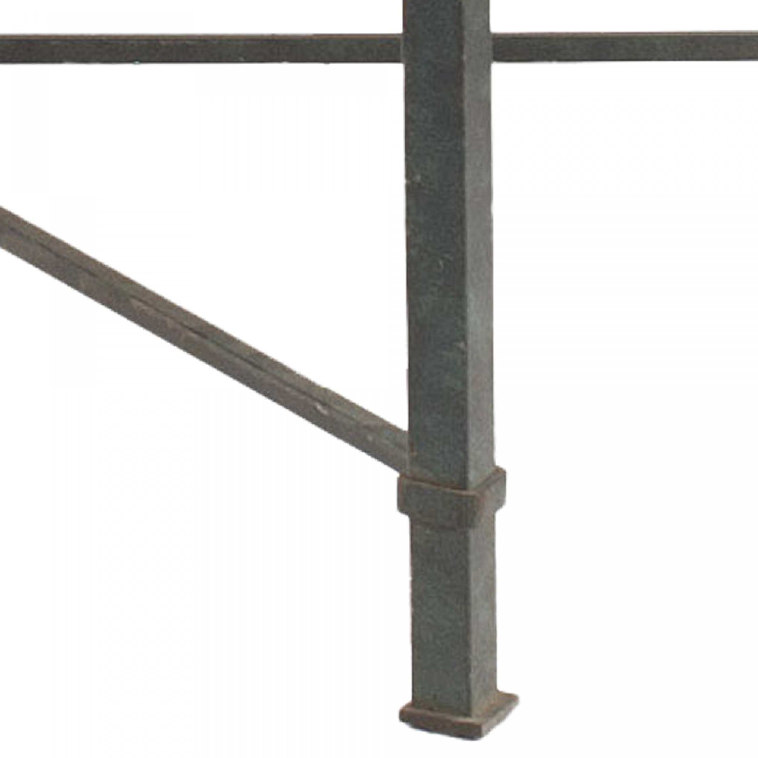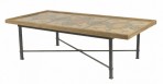 Italian Roman Neoclassic rectangular coffee table with a mid-18th century panel decorated with a Pompeiian-style faux marble inlaid pattern within a gilt frame resting on an iron stretcher base. (Matching end tables: 061139)