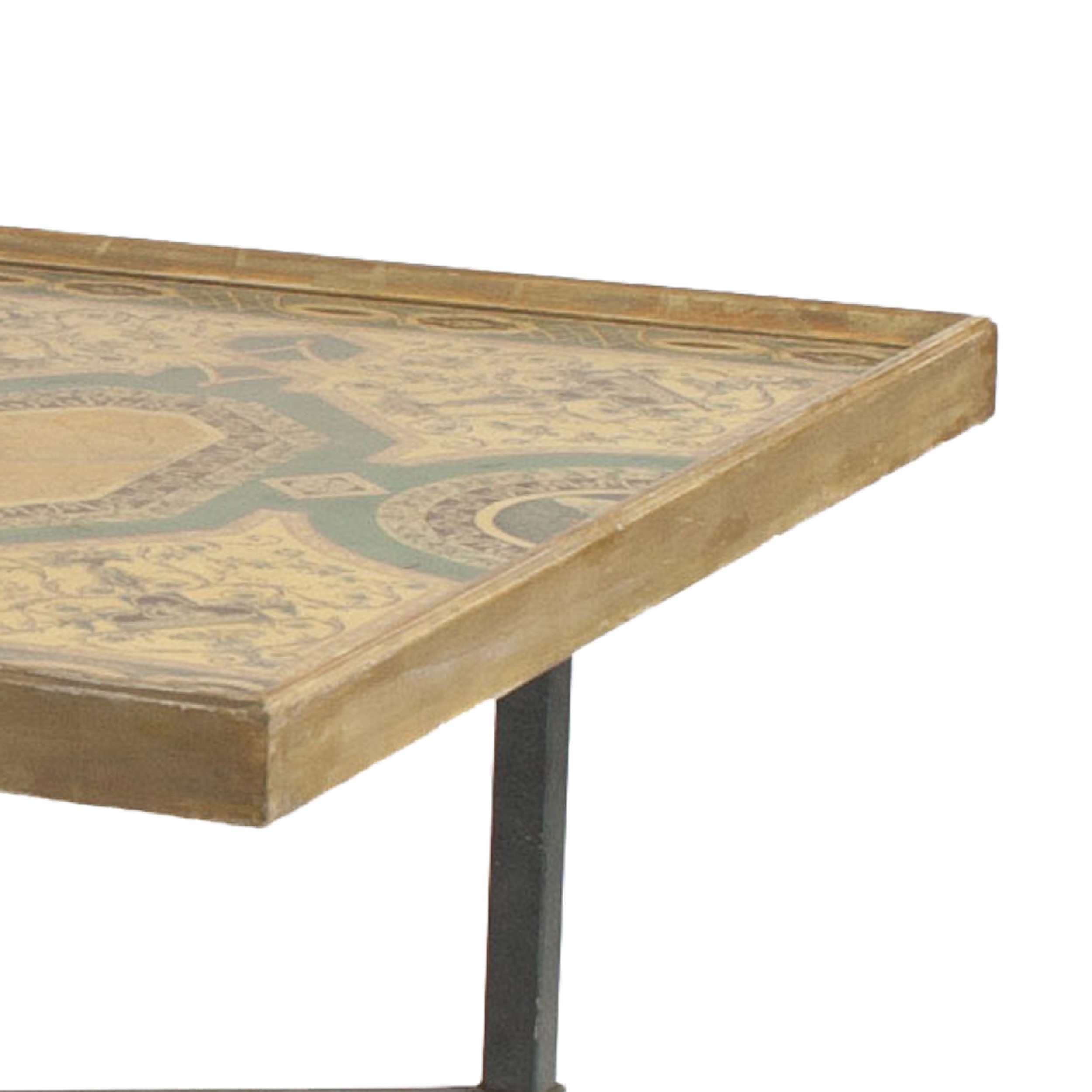 Italian Roman Neoclassic rectangular coffee table with a mid-18th century panel decorated with a Pompeiian-style faux marble inlaid pattern within a gilt frame resting on an iron stretcher base. (Matching end tables: 061139).