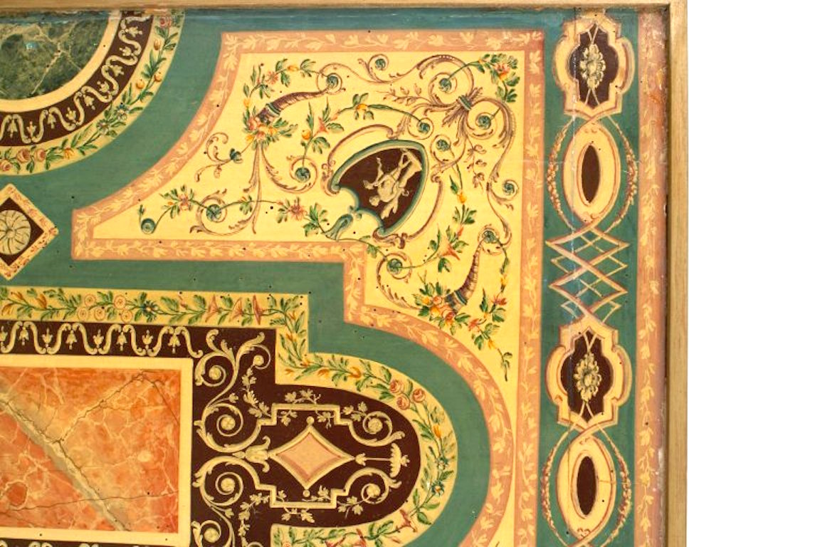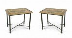 2 Italian Roman Neo-classic rectangular end tables with a mid-18th Century panel decorated in a Pompeiian style faux marble inlaid pattern in a gold frame resting on modern iron bases. (PRICED EACH) (Related coffee table: 061138).