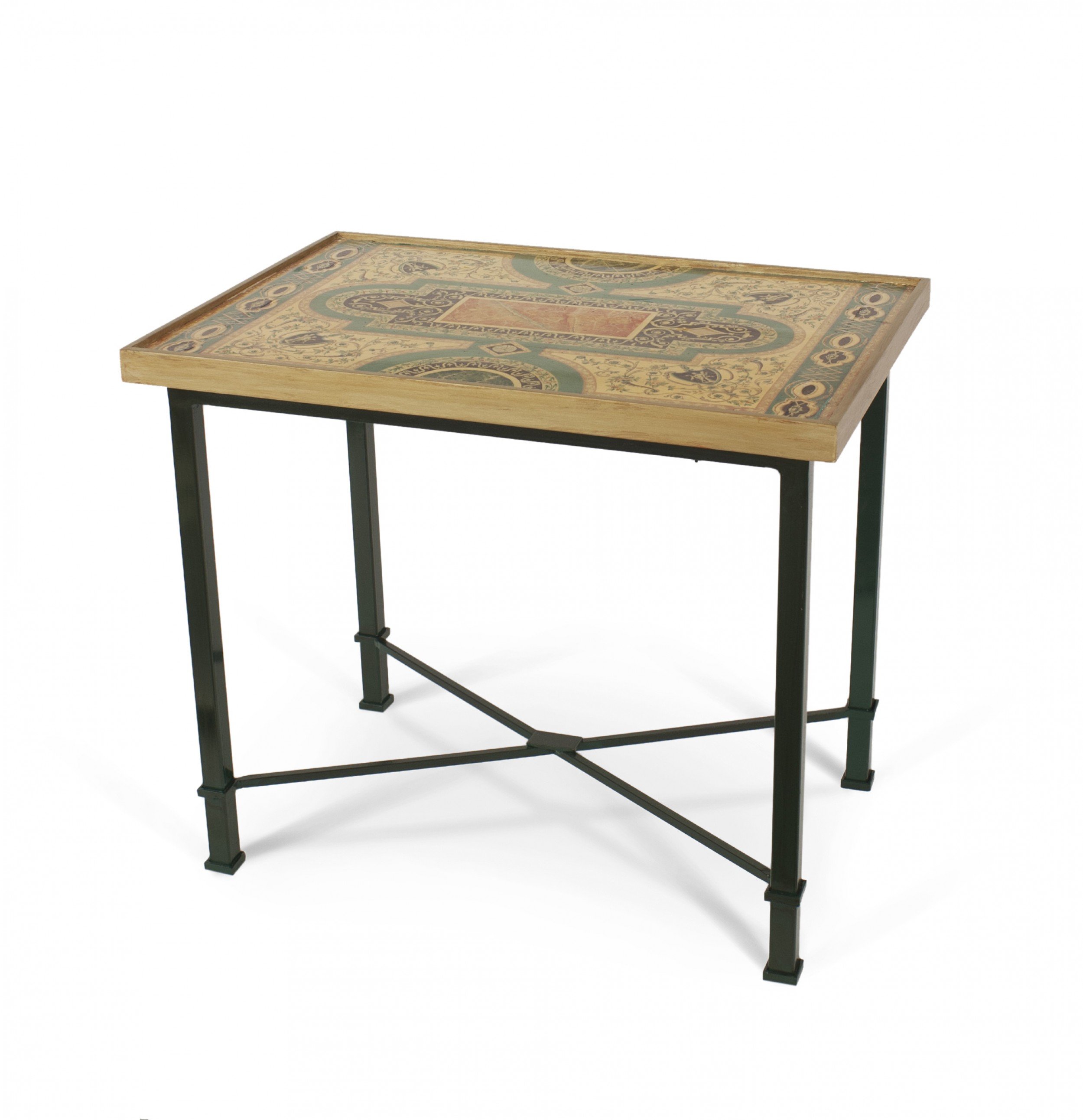 2 Italian Roman Neo-classic rectangular end tables with a mid-18th Century panel decorated in a Pompeiian style faux marble inlaid pattern in a gold frame resting on modern iron bases. (PRICED EACH) (Related coffee table: 061138)