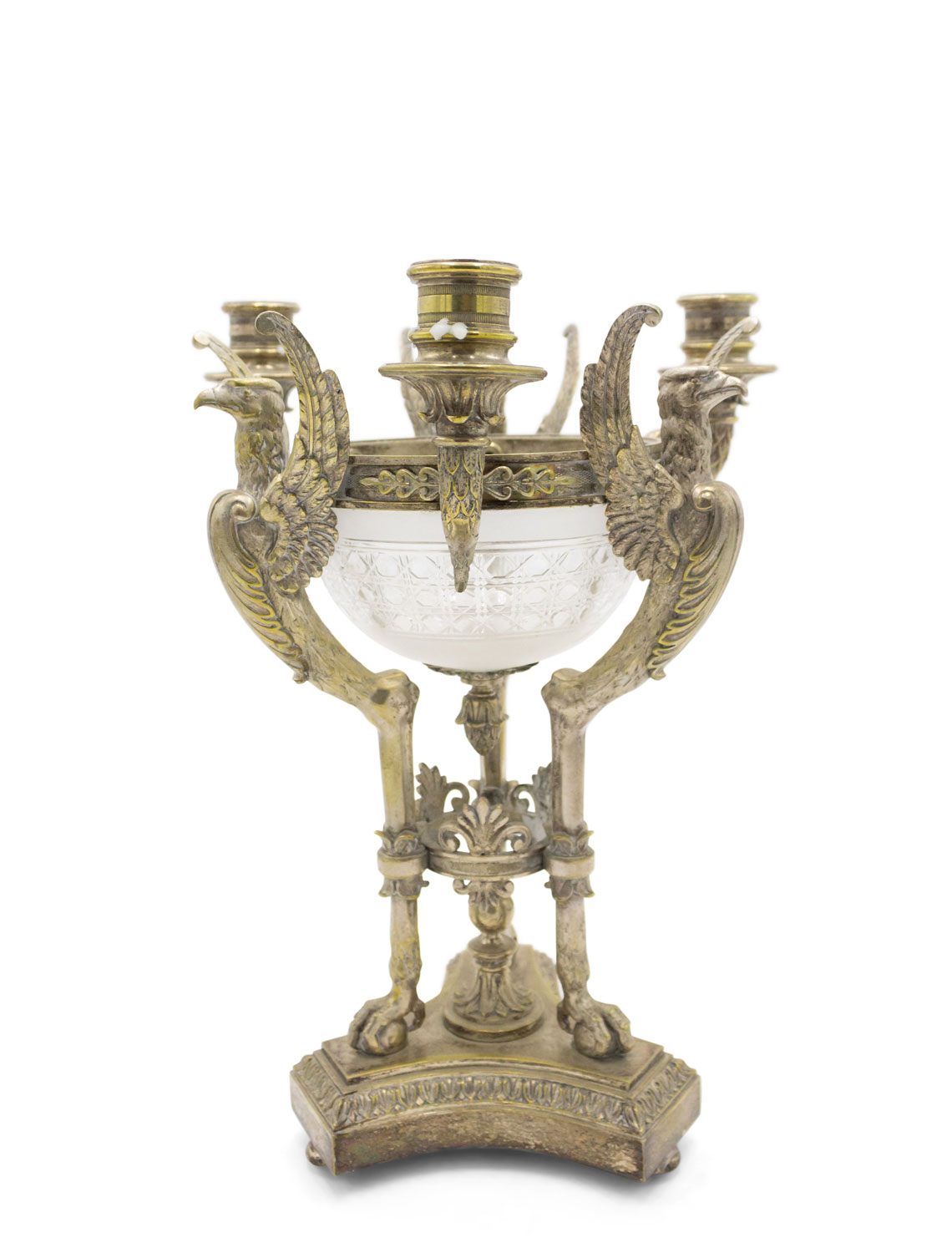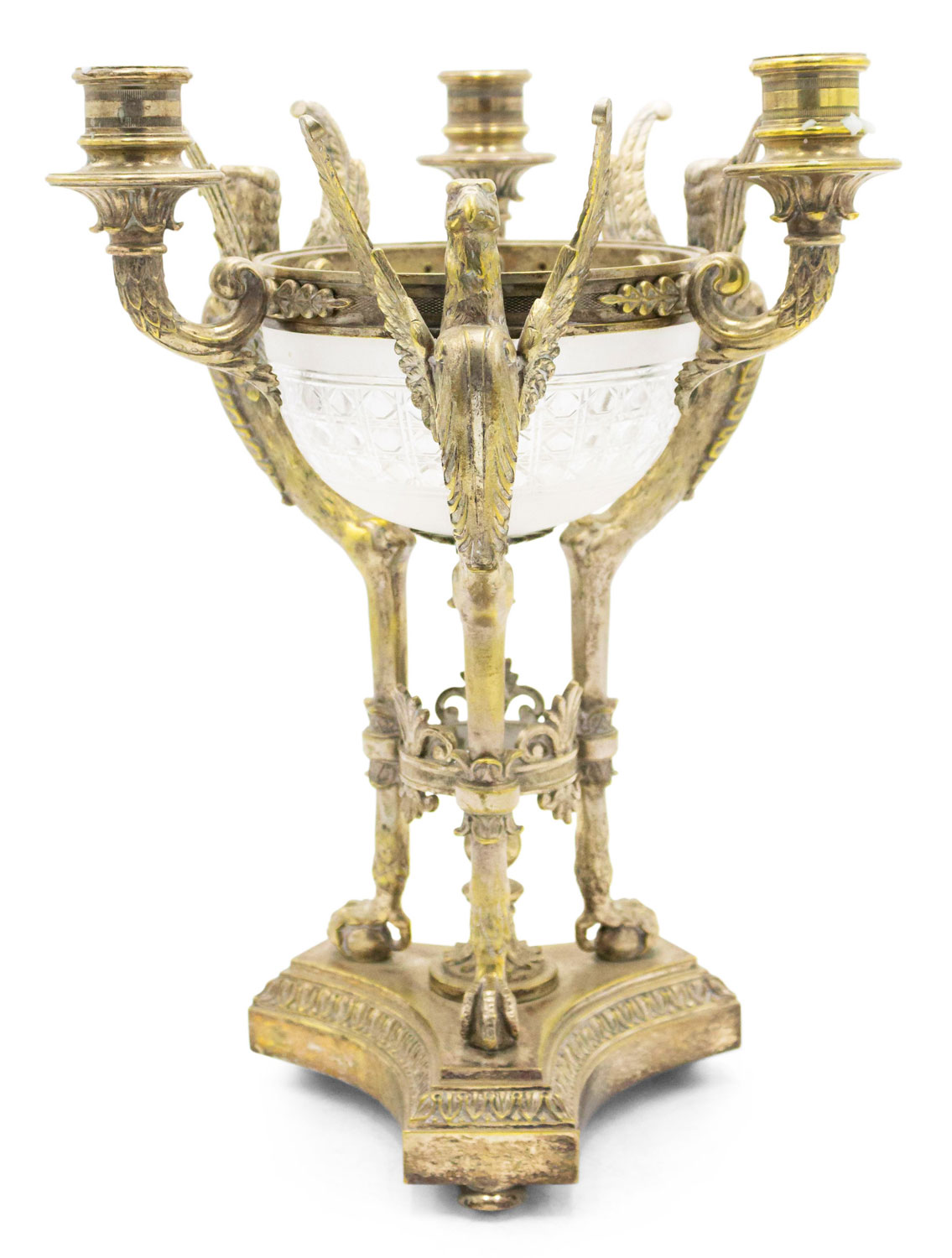 Russian Neo-classic-style (19th Century) silver plated 3 arm candelabra centerpiece with crystal bowl and eagle mascots