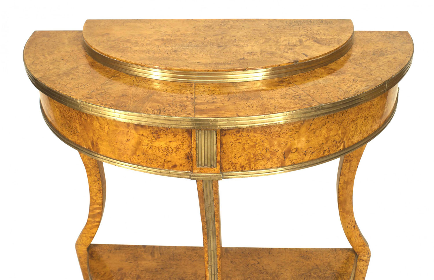 Russian Neo-classic (Circa 1800) brass mounted Karelian birch demilune console table with stepped top and 3 legs connected with a bottome shelf