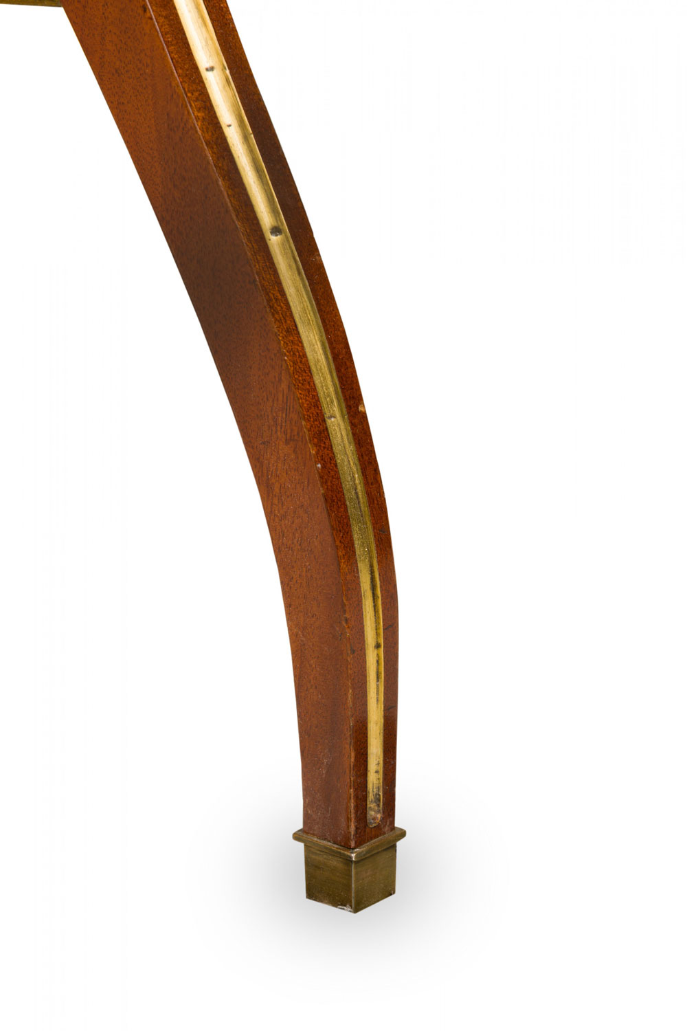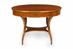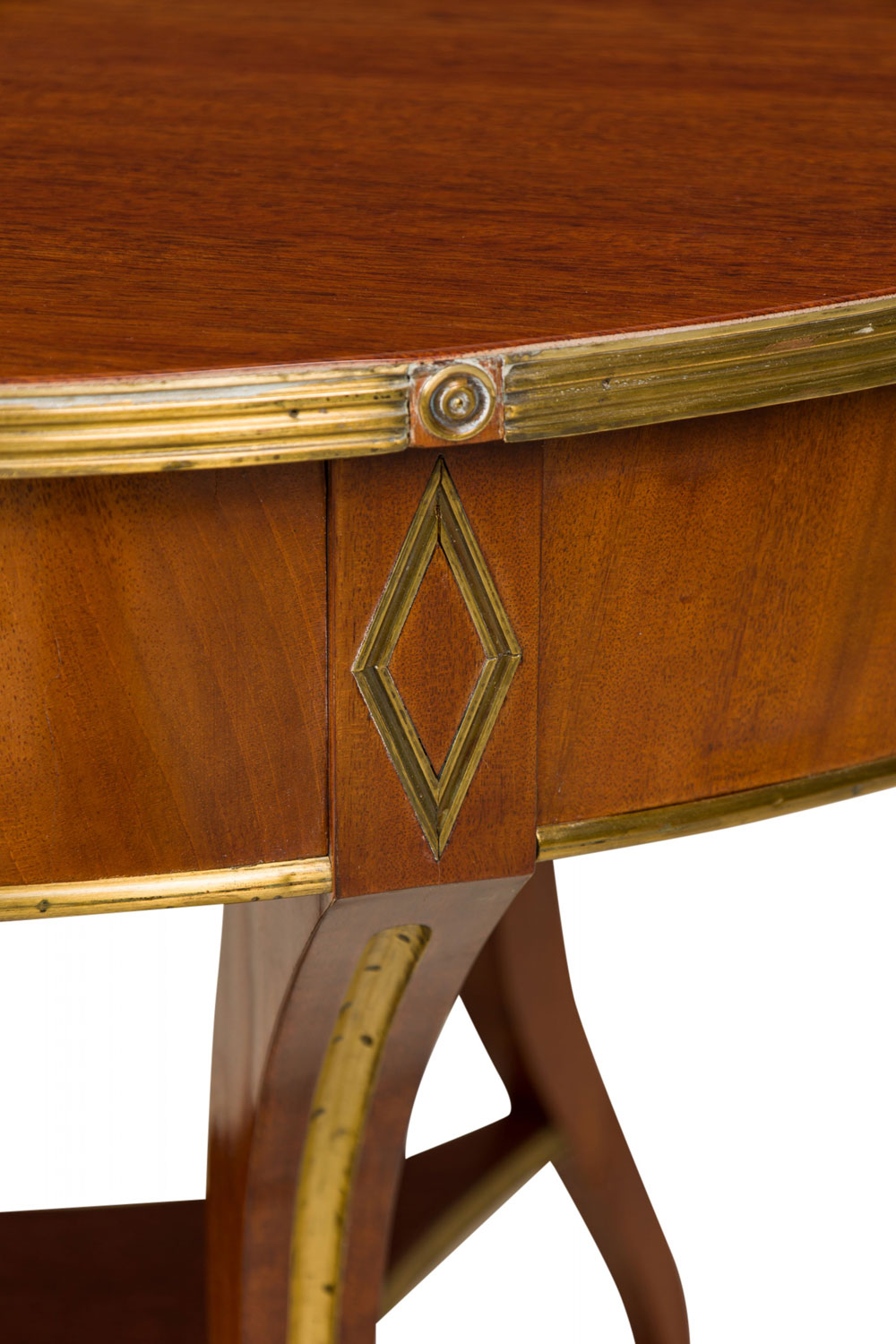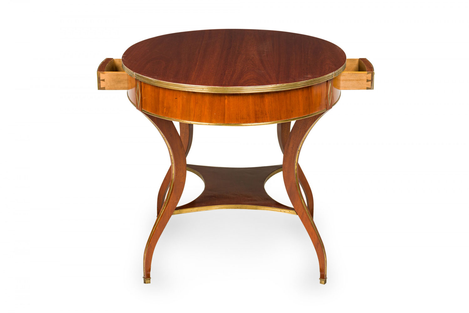 Russian Neoclassic (18/19th Century) brass mounted mahogany center table with an oval top over an apron with central drawer. Supported by 4 exaggerated "S" form legs with central stretcher..