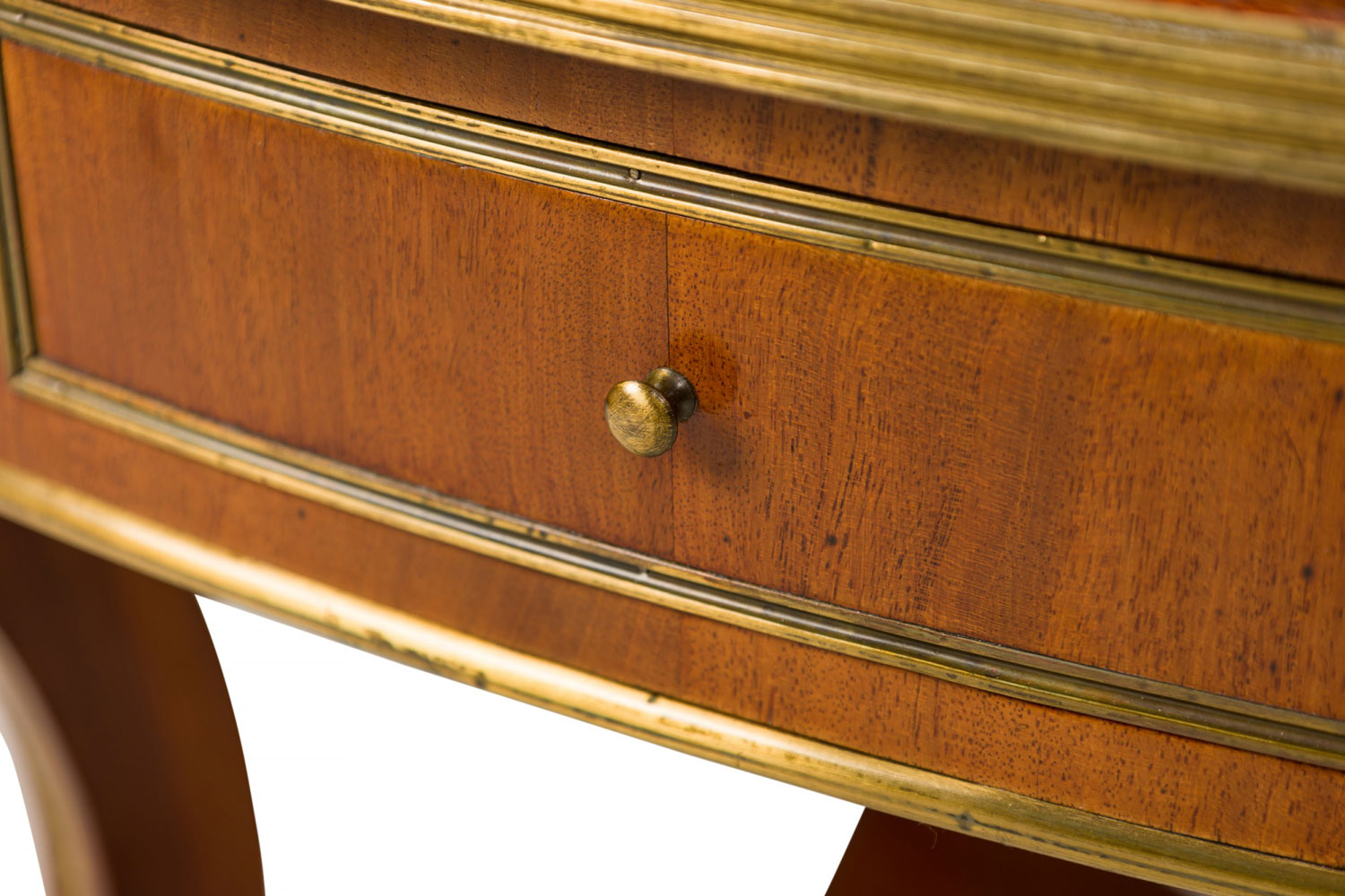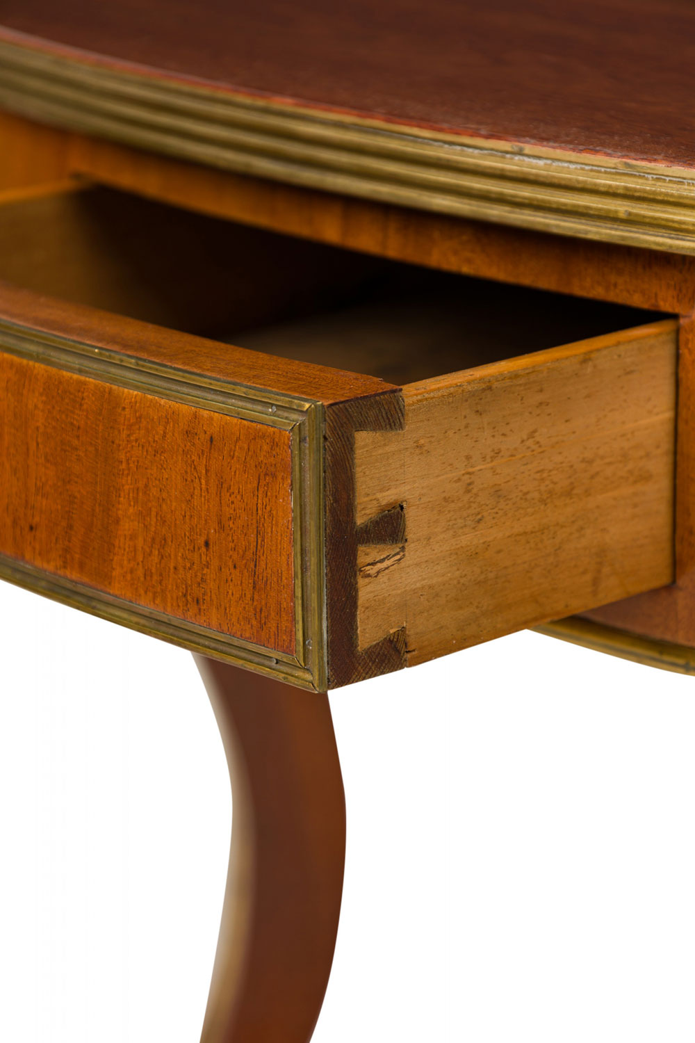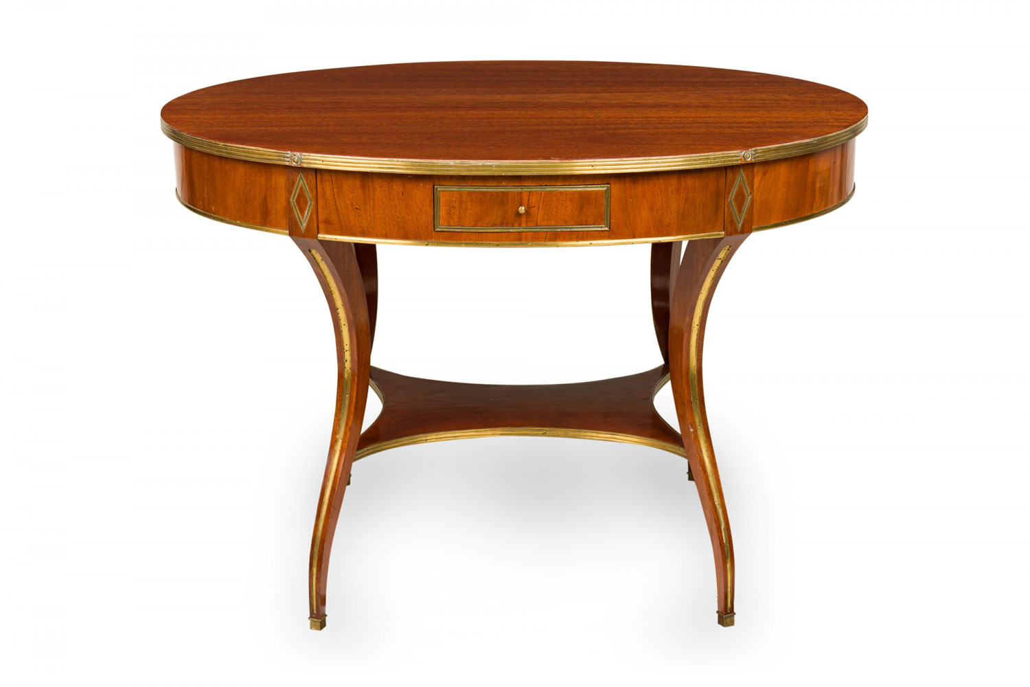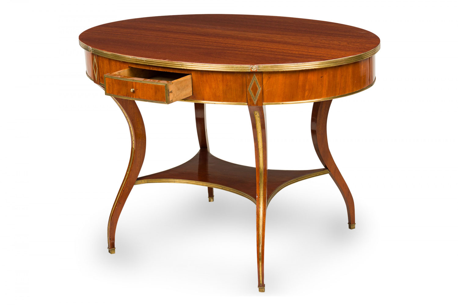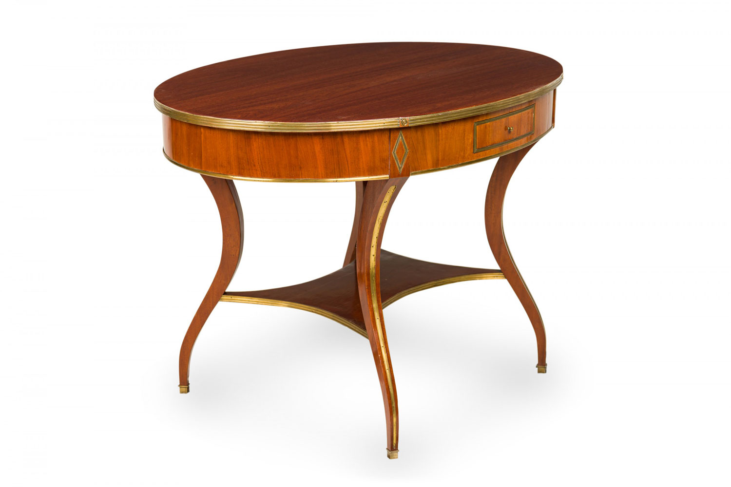 Russian Neoclassic (18/19th Century) brass mounted mahogany center table with an oval top over an apron with central drawer. Supported by 4 exaggerated "S" form legs with central stretcher.