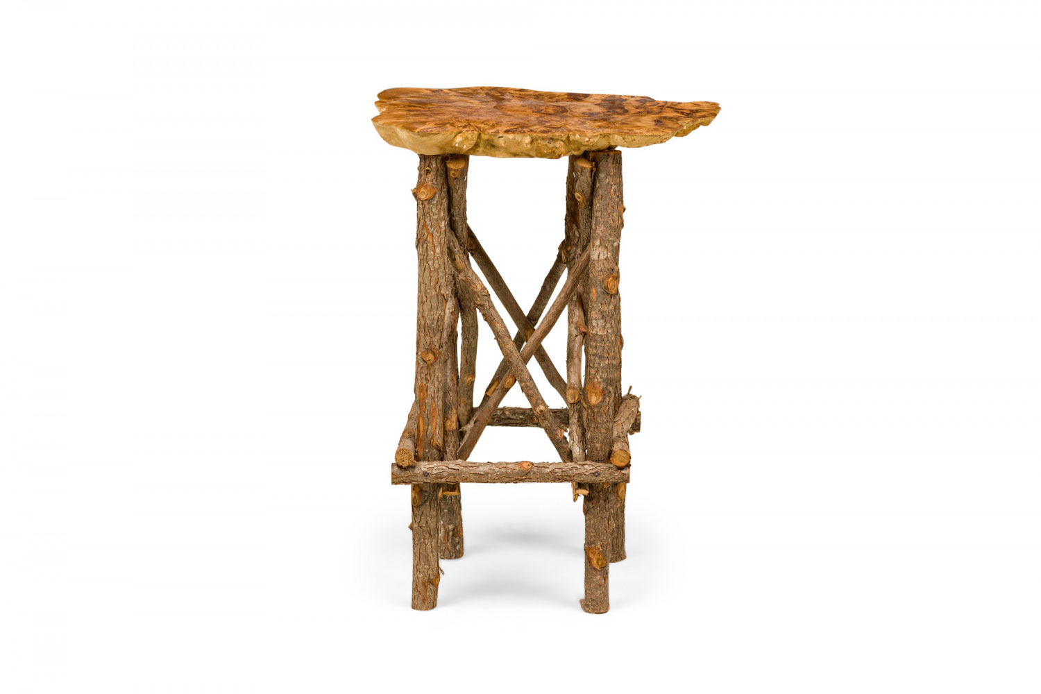 Contemporary Rustic Adirondack end / side table with a petrified wood top with organically scalloped edges supported on a branch base with x-stretchers. (Similar tables: 063374, 063375).