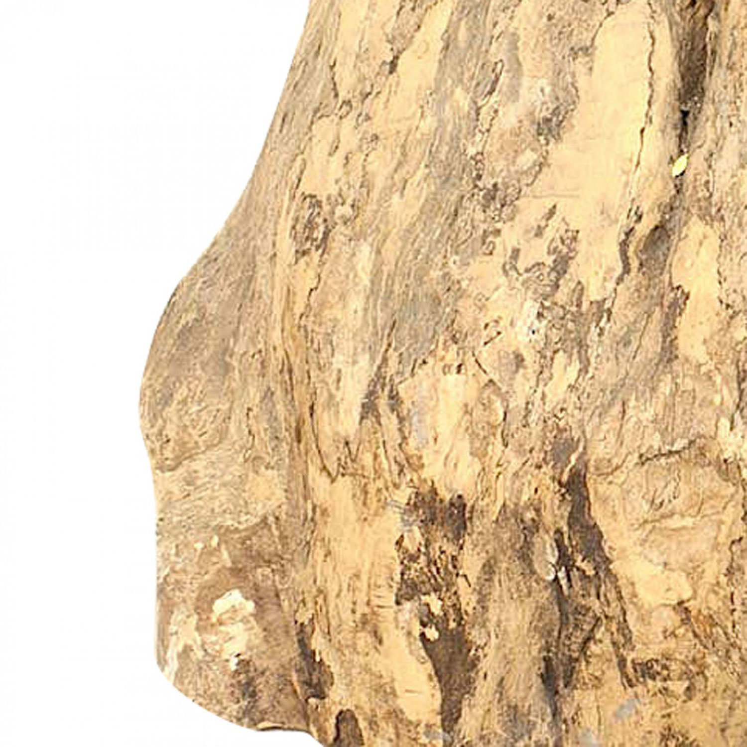 Rustic Adirondack-Style large tree trunk base dining table supporting a round glass top.