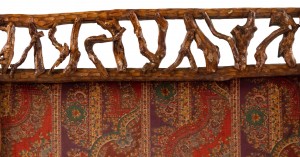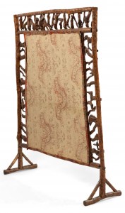 American Rustic Adirondack-style (19/20th Century) twig filigree framed fire screen stand with paisley upholstery (Attributed to Ben Davis).