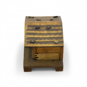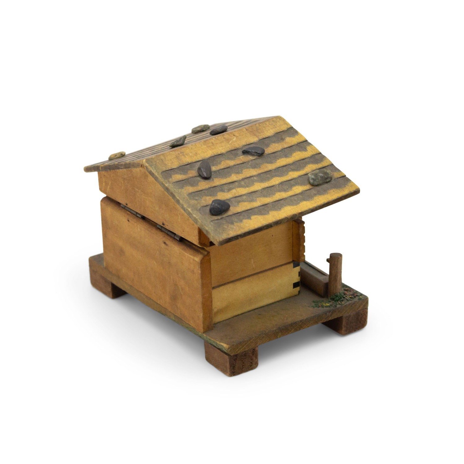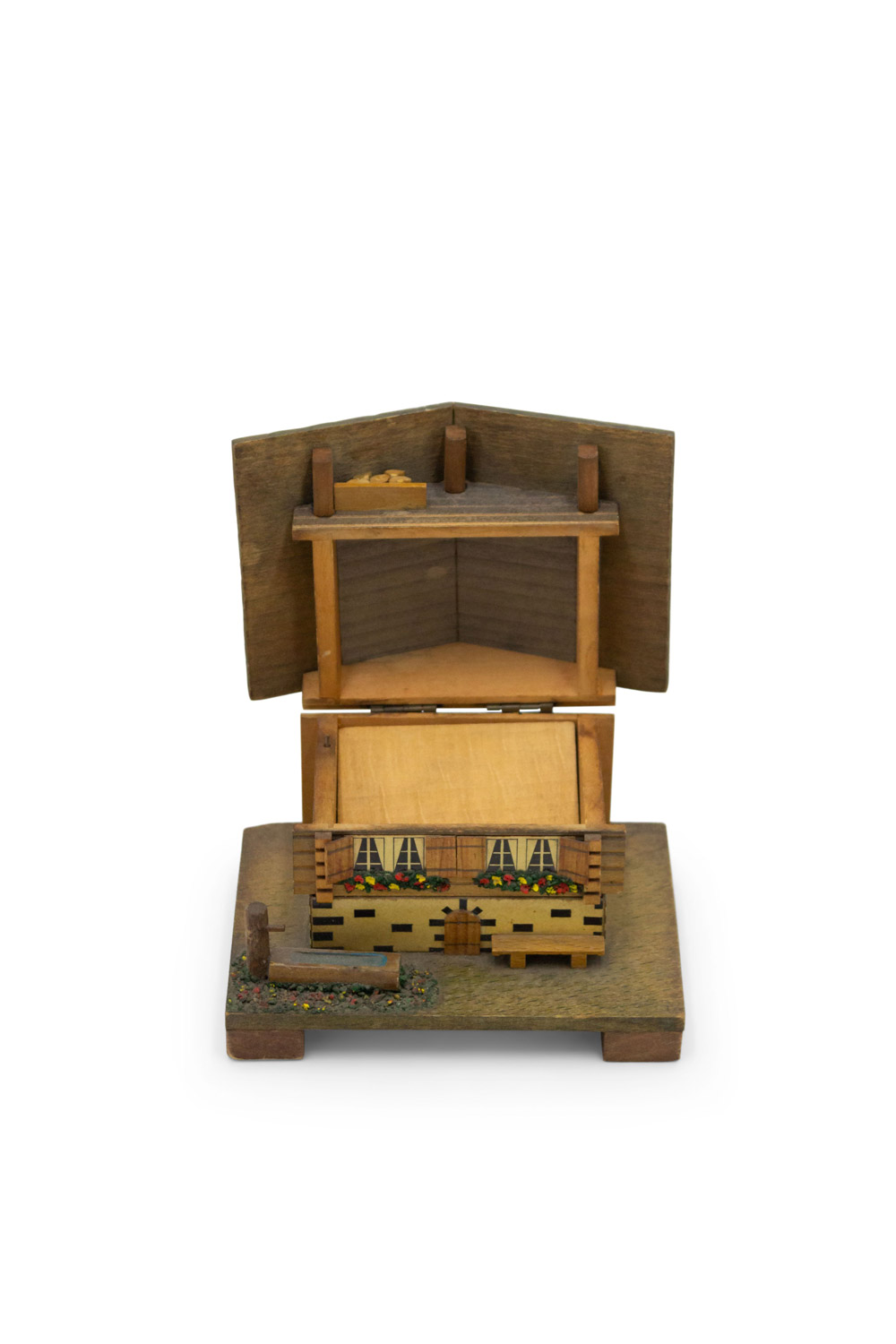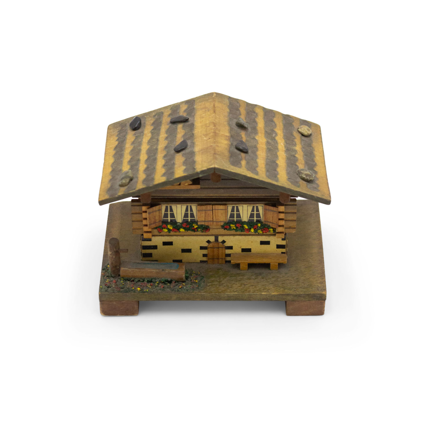Rustic Continental-style (19/20th Century) small house-shaped wood music box..
