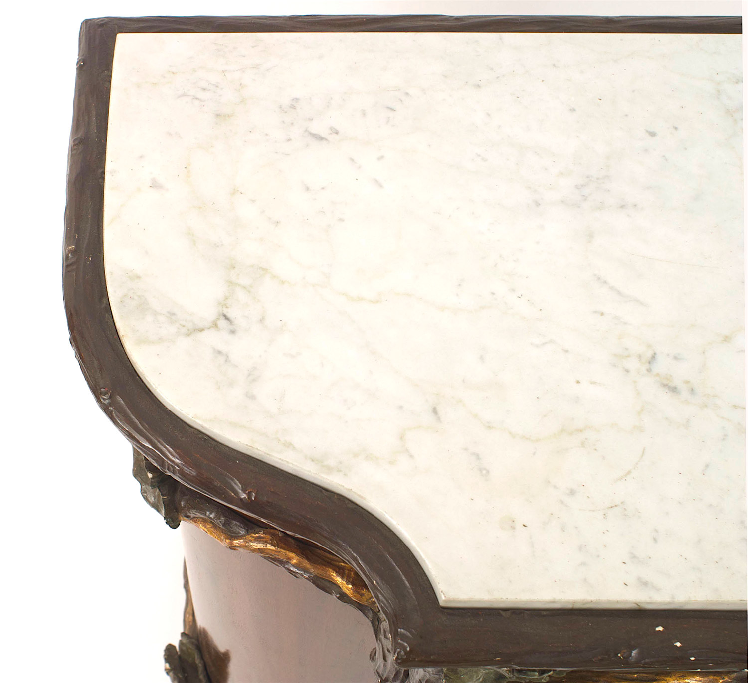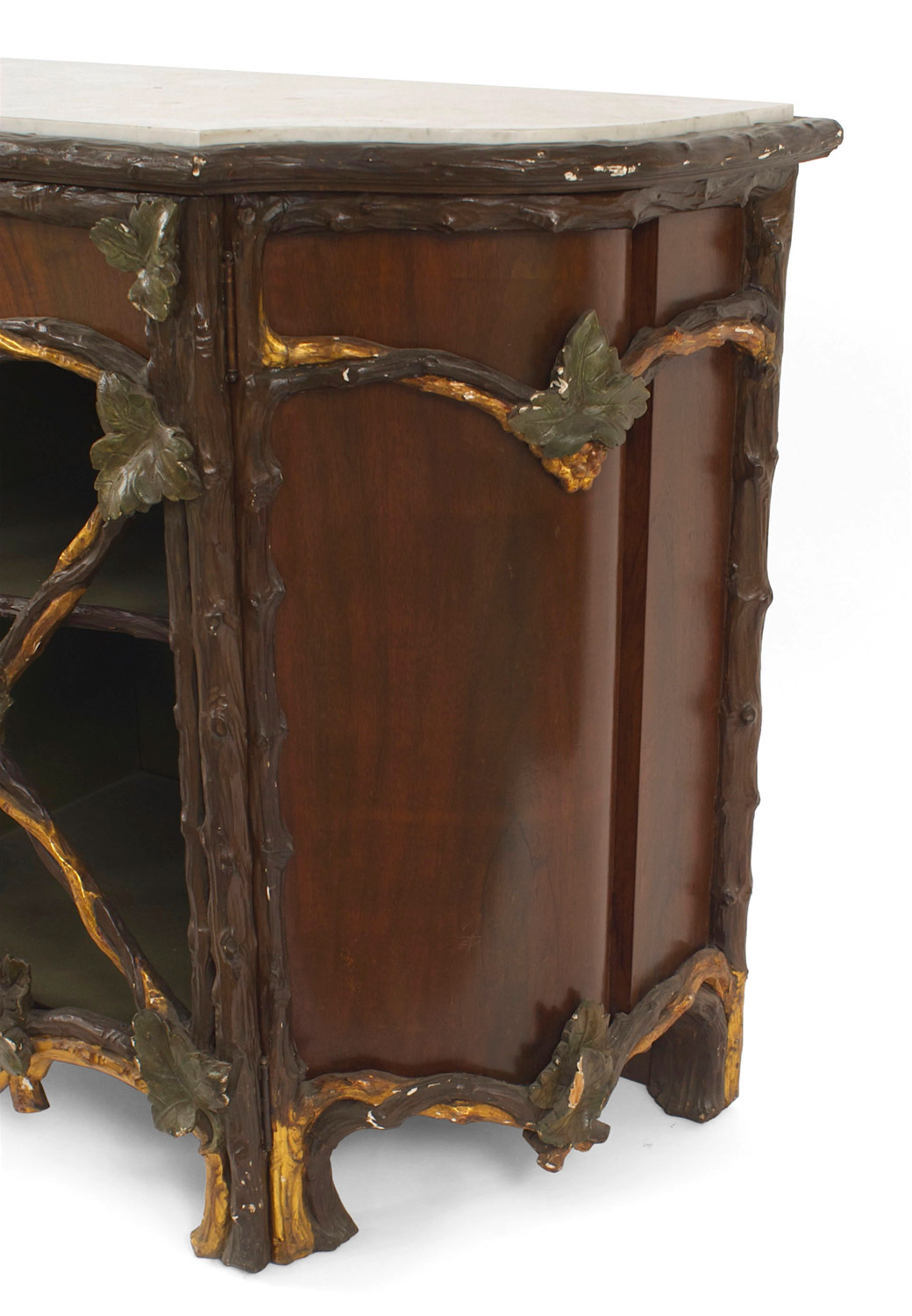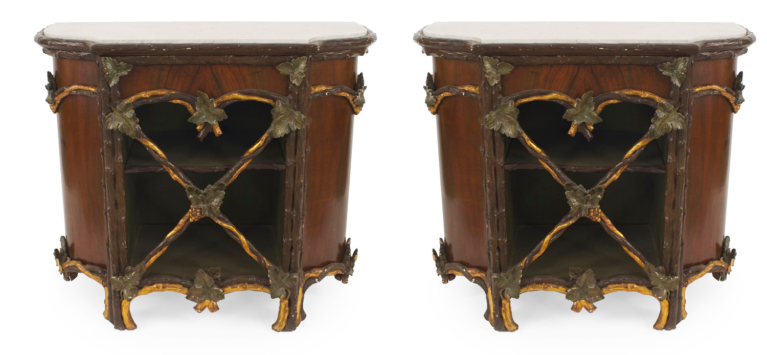 PAIR of Rustic Continental (19th Century) painted and gilt trimmed commodes with carved leaf design on front door with shaped white marble top. (Related item: 056123) (PRICED AS PAIR).