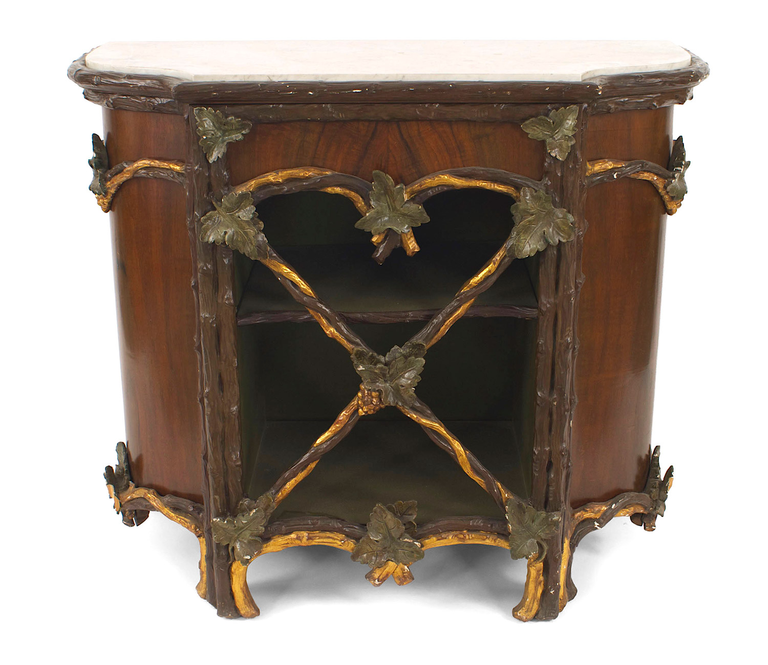 PAIR of Rustic Continental (19th Century) painted and gilt trimmed commodes with carved leaf design on front door with shaped white marble top. (Related item: 056123) (PRICED AS PAIR)..