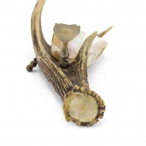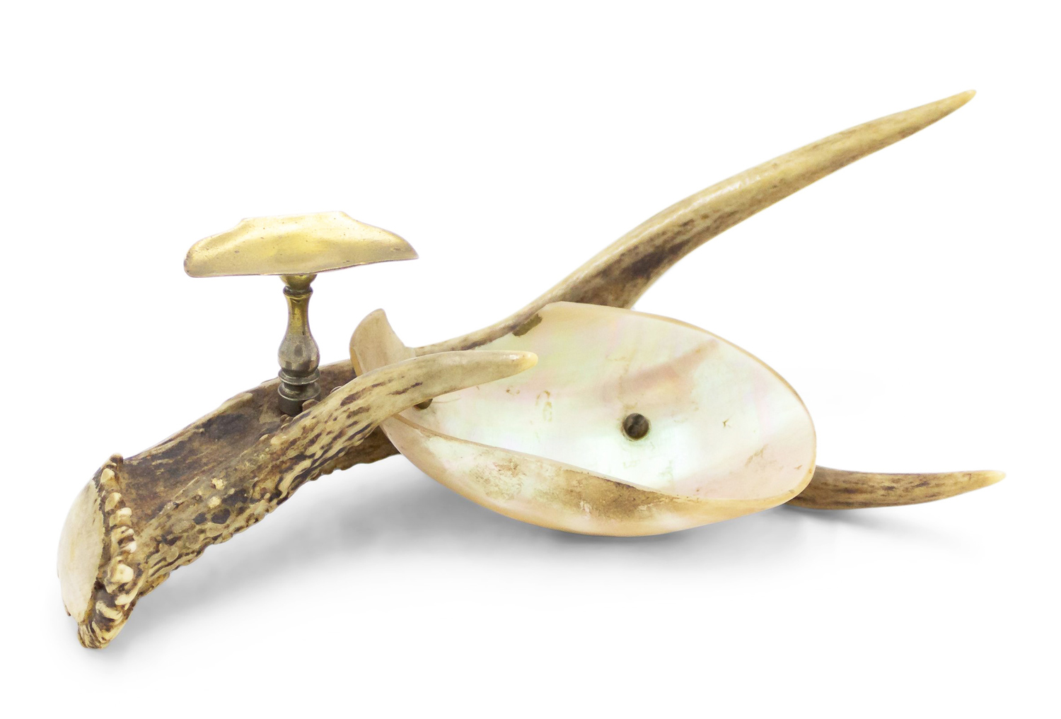 Rustic Continental style pearl ashtray cradled in animal horn base with brass cigarette stand (as is-break in pearl).