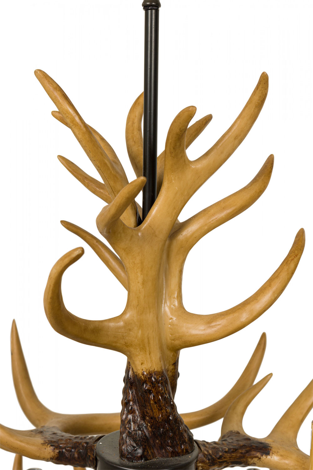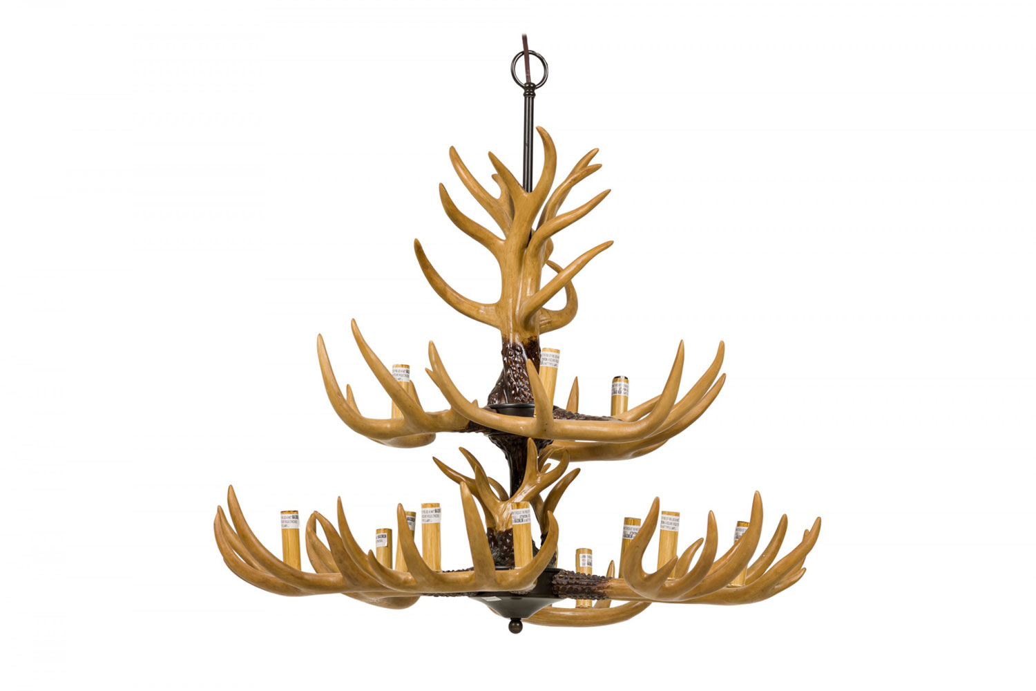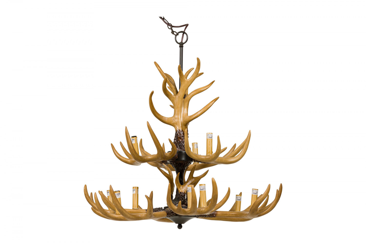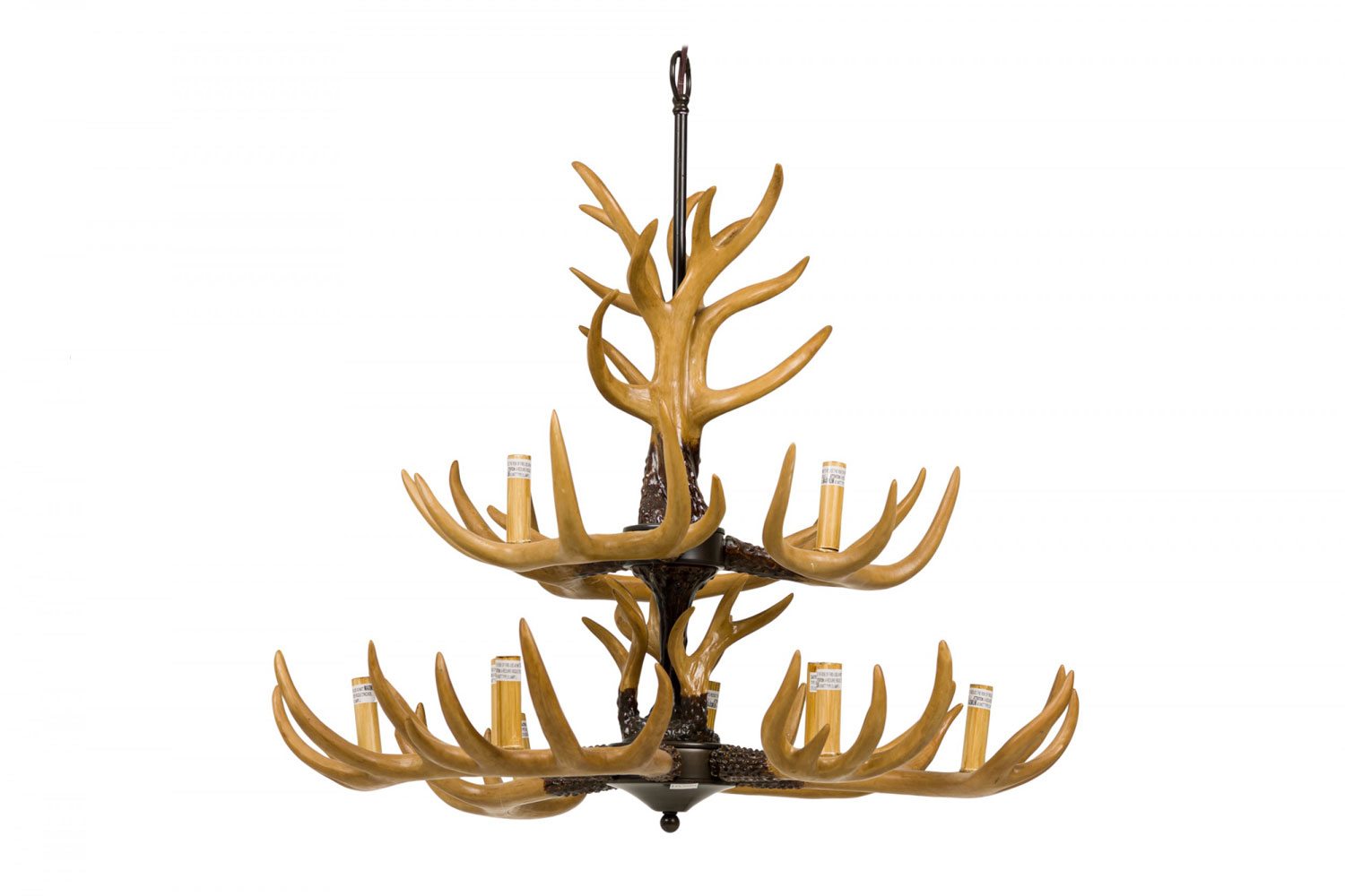 Rustic Continenetal-style three tier 12 light faux antler resin and metal chandelier.