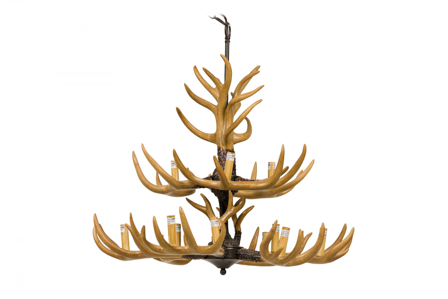 Rustic Continenetal-style three tier 12 light faux antler resin and metal chandelier..