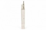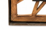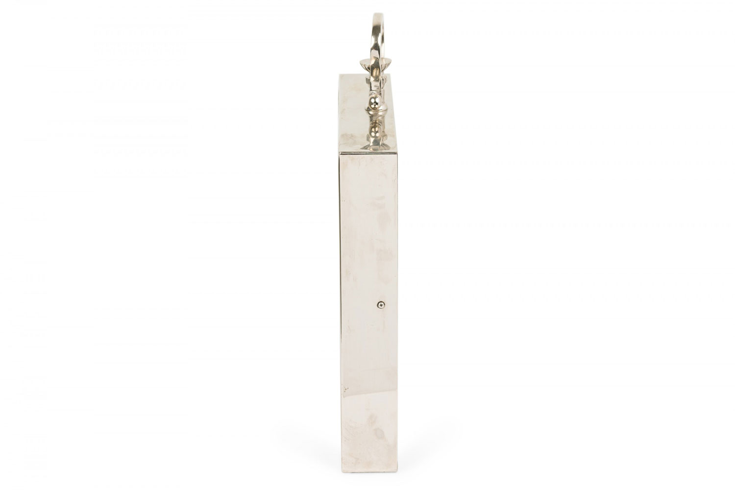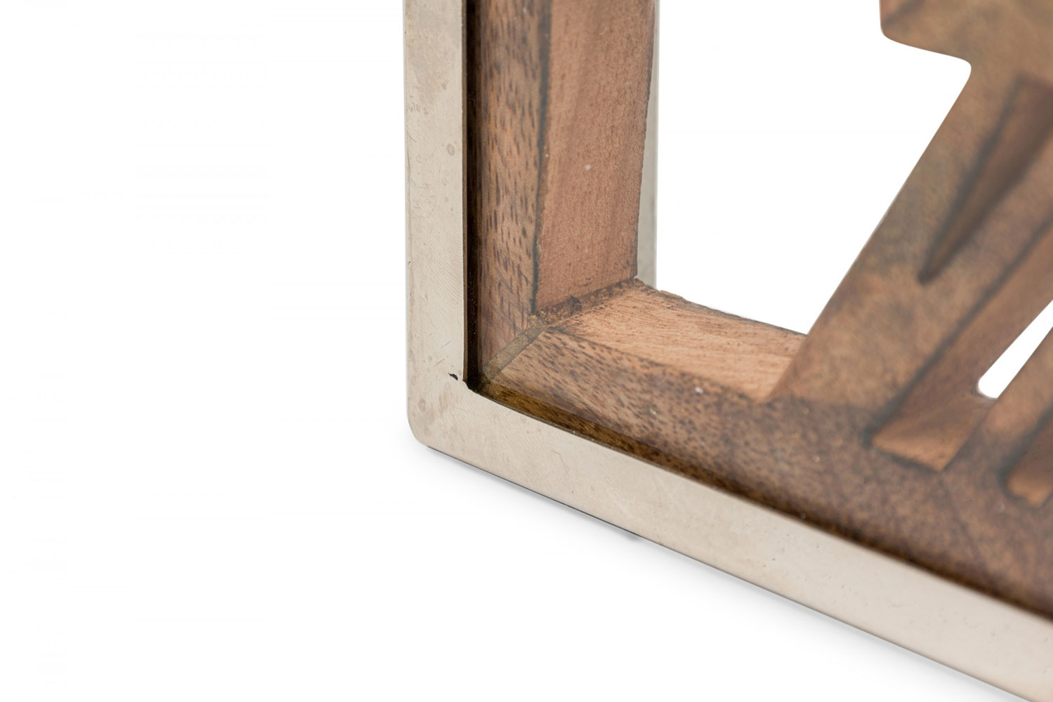 Rustic Continental-style square table or wall clock with a silver metal and glass case containing carved wooden Roman numerals surrounding a central beige and black clock face, topped with a metal eyelet for hanging (Mclaughlin & Scott)..