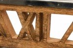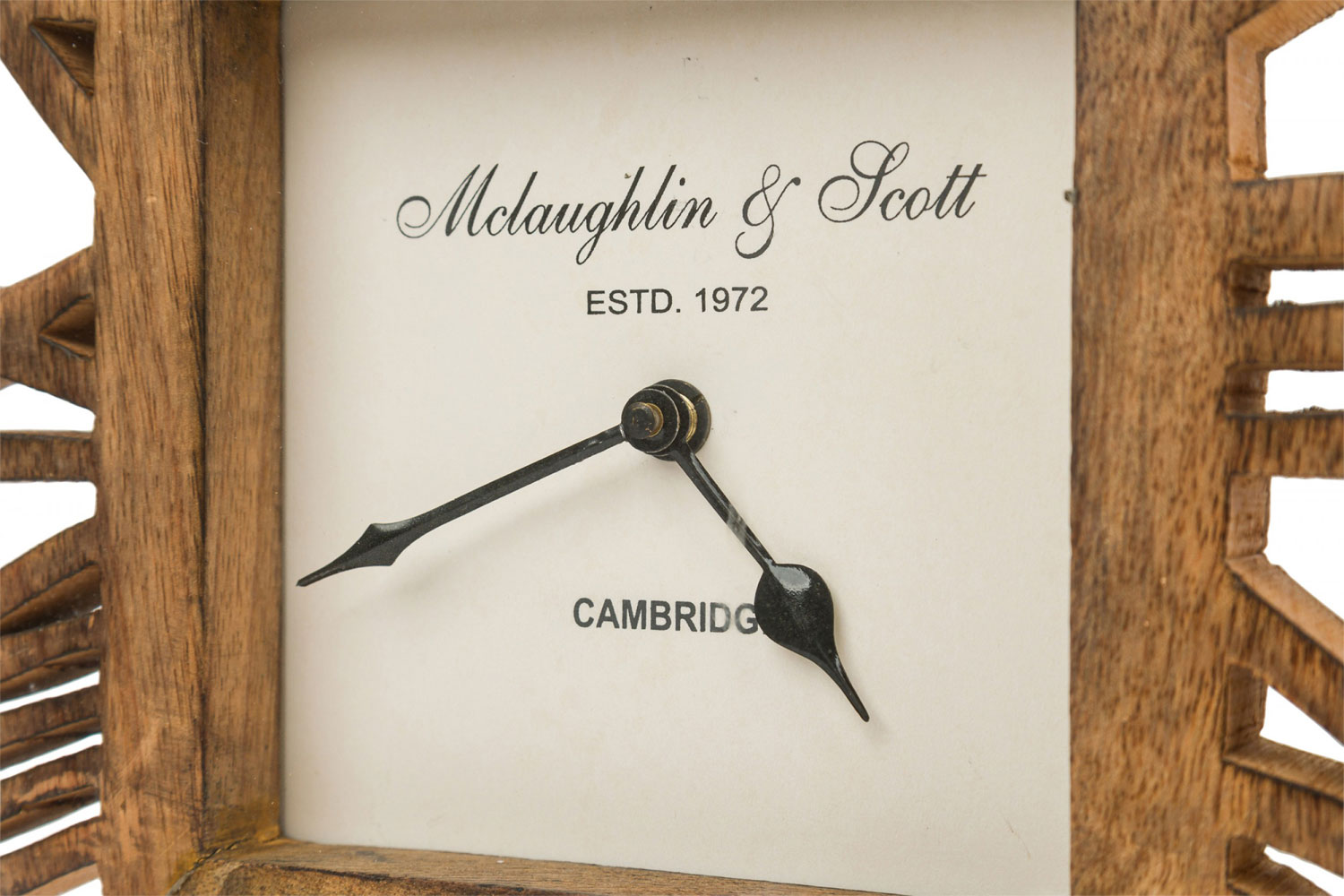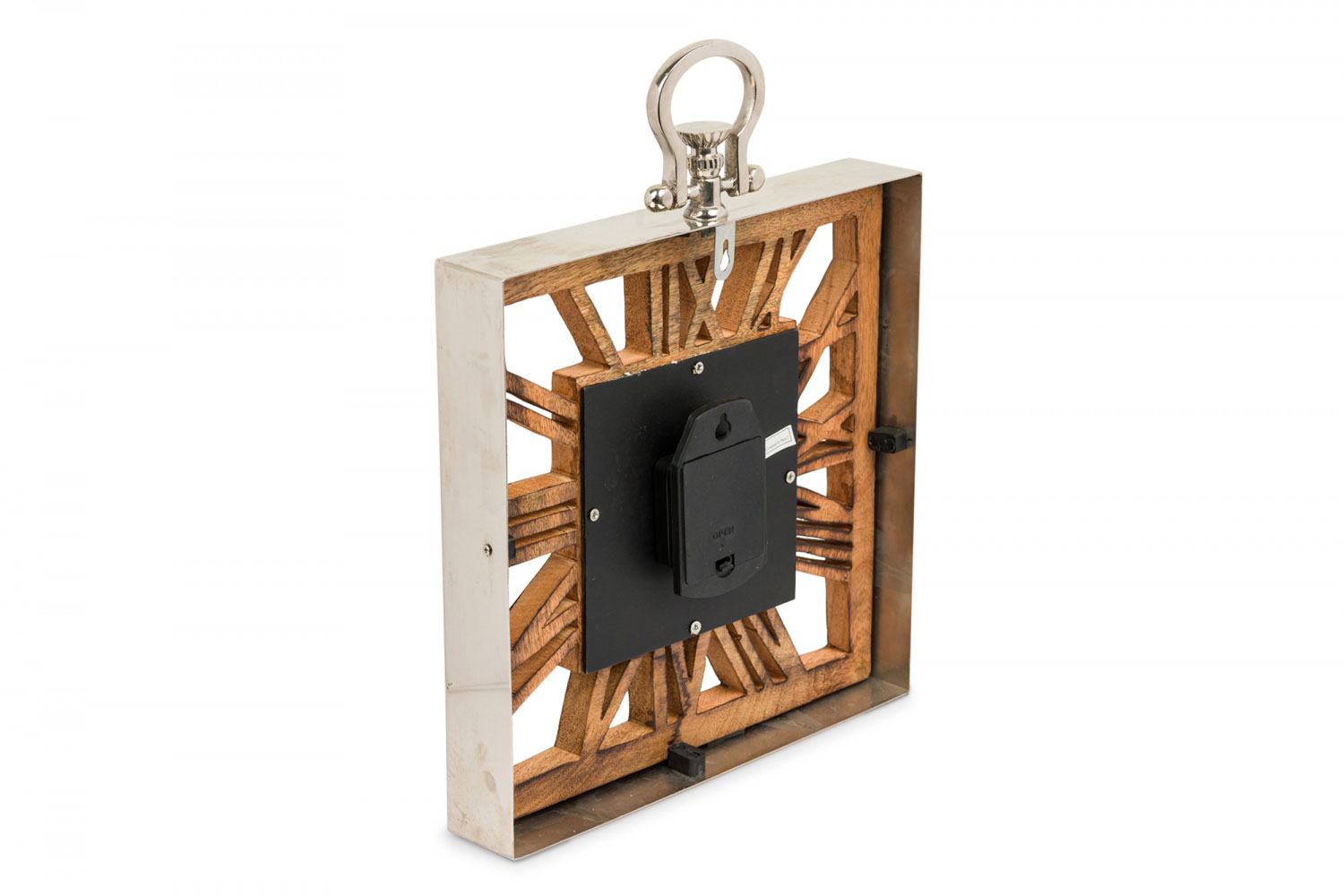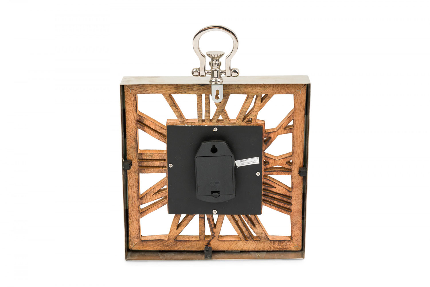Rustic Continental-style square table or wall clock with a silver metal and glass case containing carved wooden Roman numerals surrounding a central beige and black clock face, topped with a metal eyelet for hanging (Mclaughlin & Scott).