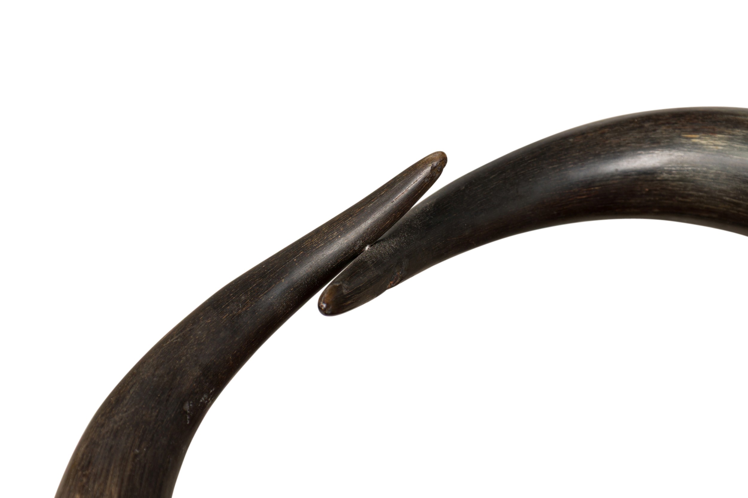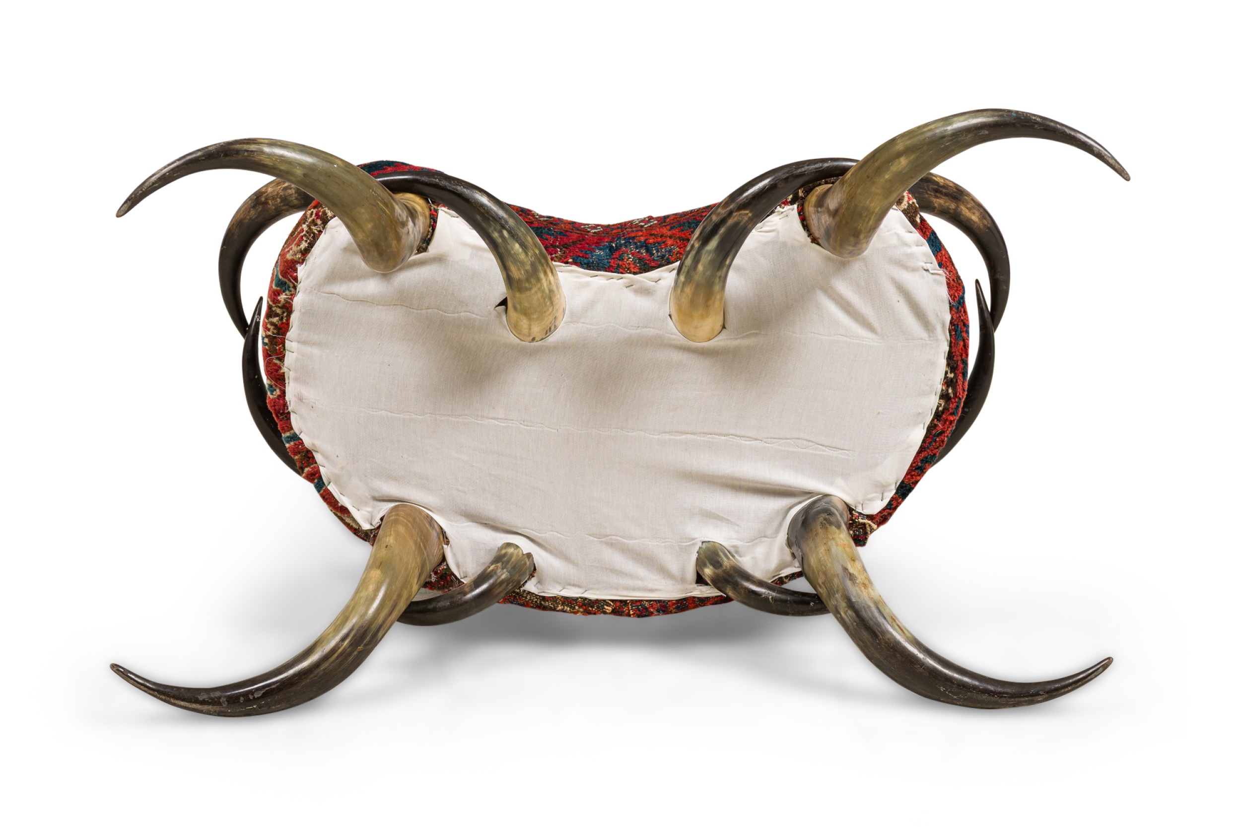American Rustic horn (early 20th Century) and Kilim upholstered chair / bench having a 14-point steer horn low chair back with a Middle Eastern Kilim upholstered seat