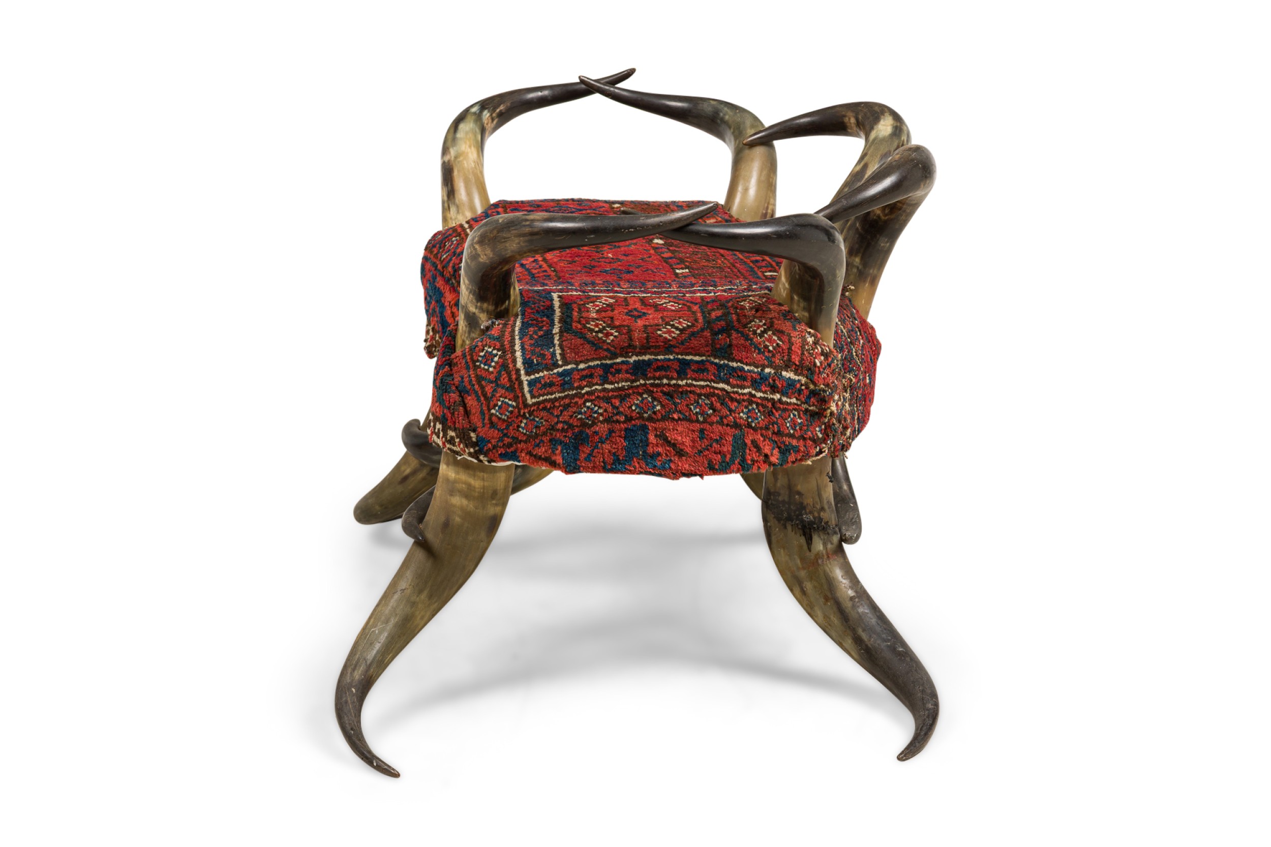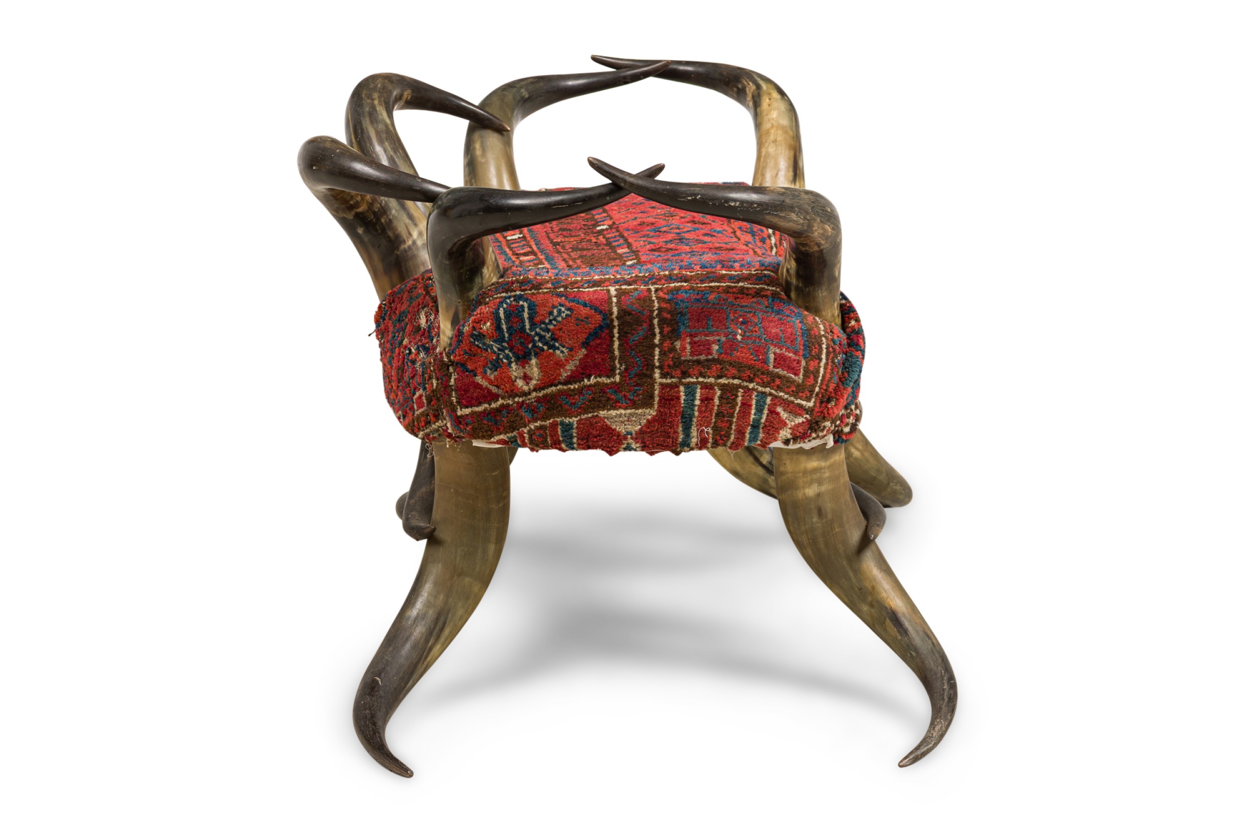 American Rustic horn (early 20th Century) and Kilim upholstered chair / bench having a 14-point steer horn low chair back with a Middle Eastern Kilim upholstered seat.