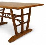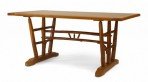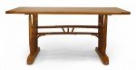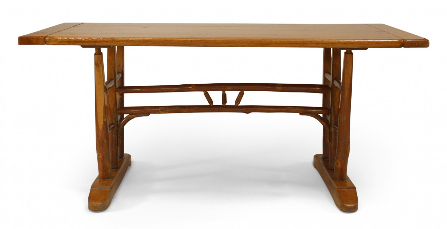 Rustic Old Hickory (1940s) dining table with rectangular top on trestle supports joined by a spindle stretcher (Branded: Old Hickory; Martinsville, Indiana) (Related item: 059634)