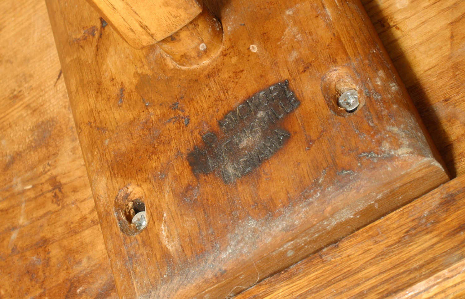 Rustic Old Hickory (1940s) dining table with rectangular top on trestle supports joined by a spindle stretcher (Branded: Old Hickory; Martinsville, Indiana) (Related item: 059634).