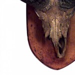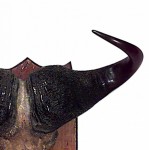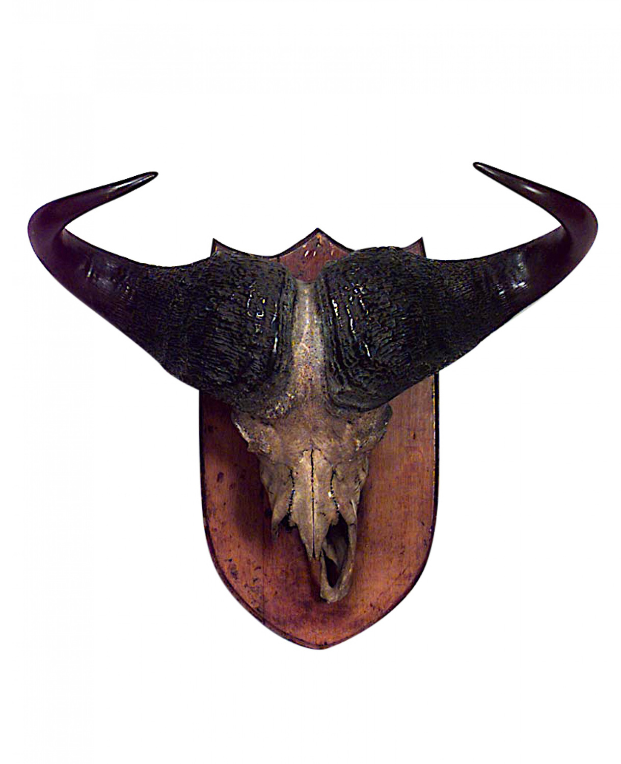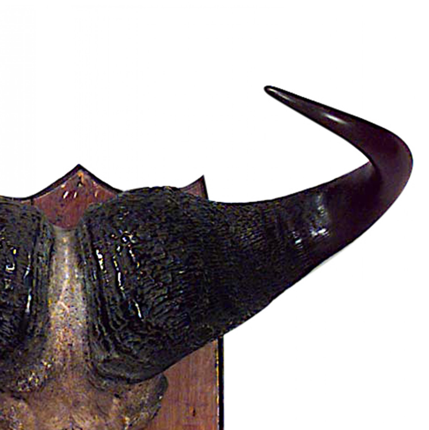 African style taxidermy large water buffalo skull mounted on oak shield shaped wall plaque (19/20th Cent.).