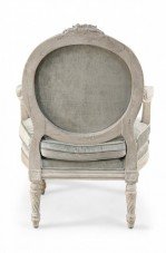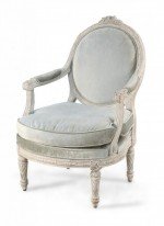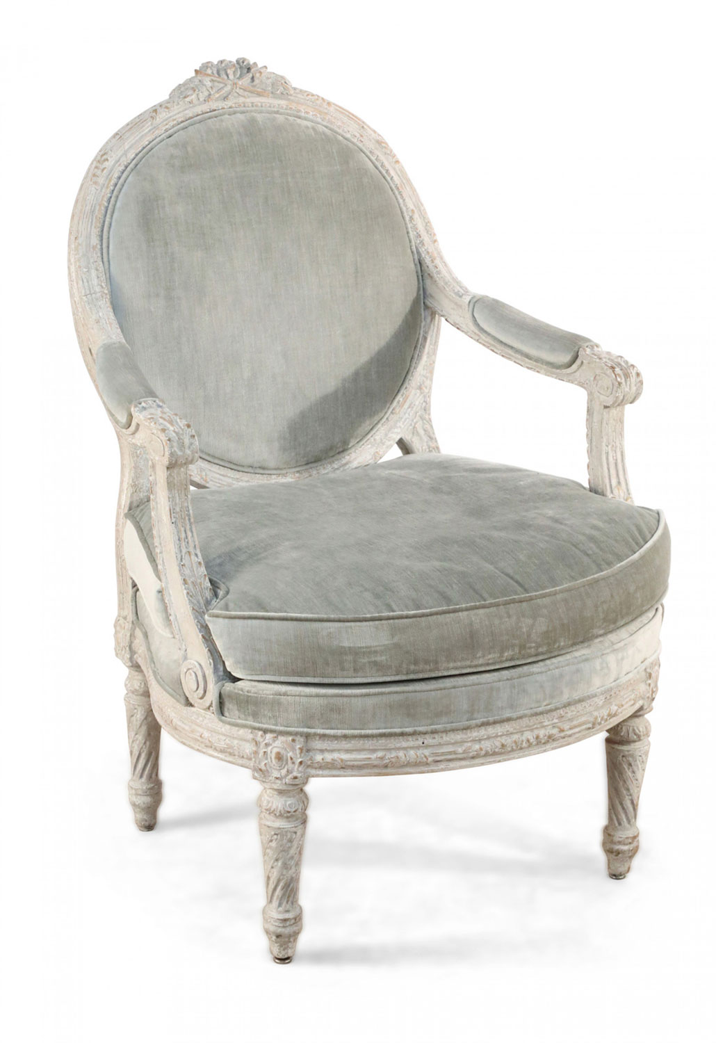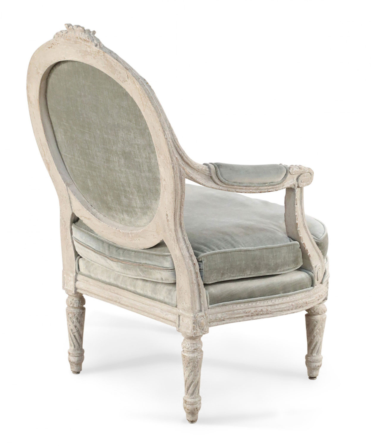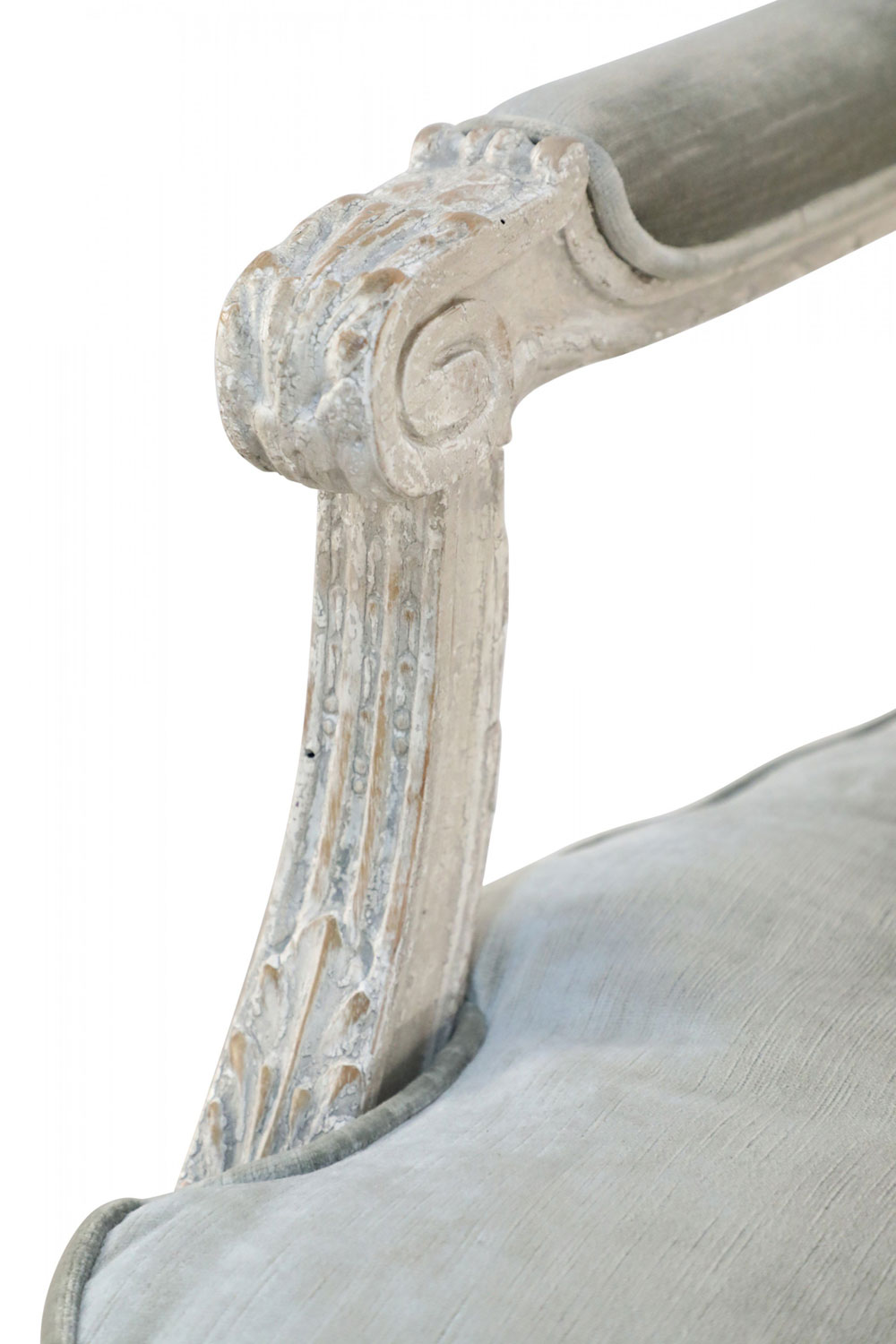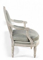 PAIR of Italian Piedmontese (c.1785) open arm chairs with a rounded back having a carved floral crest, the frame carved with wheat, and the legs having a twisted fluting with light gray velvet upholstery. (PRICED AS PAIR)