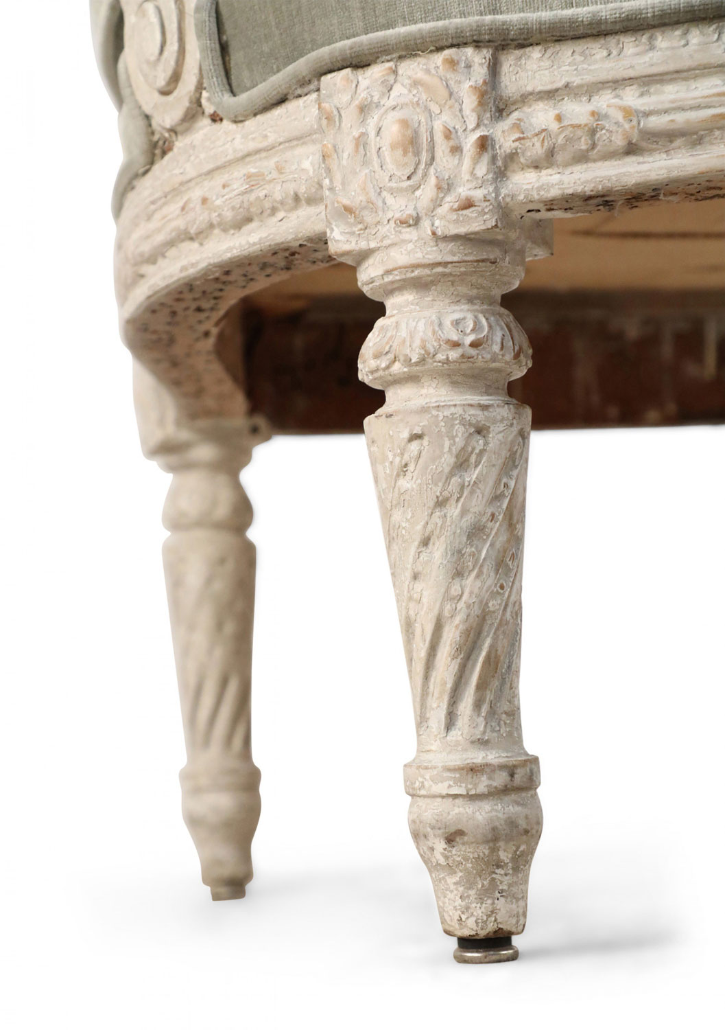 PAIR of Italian Piedmontese (c.1785) open arm chairs with a rounded back having a carved floral crest, the frame carved with wheat, and the legs having a twisted fluting with light gray velvet upholstery. (PRICED AS PAIR).