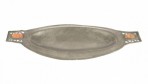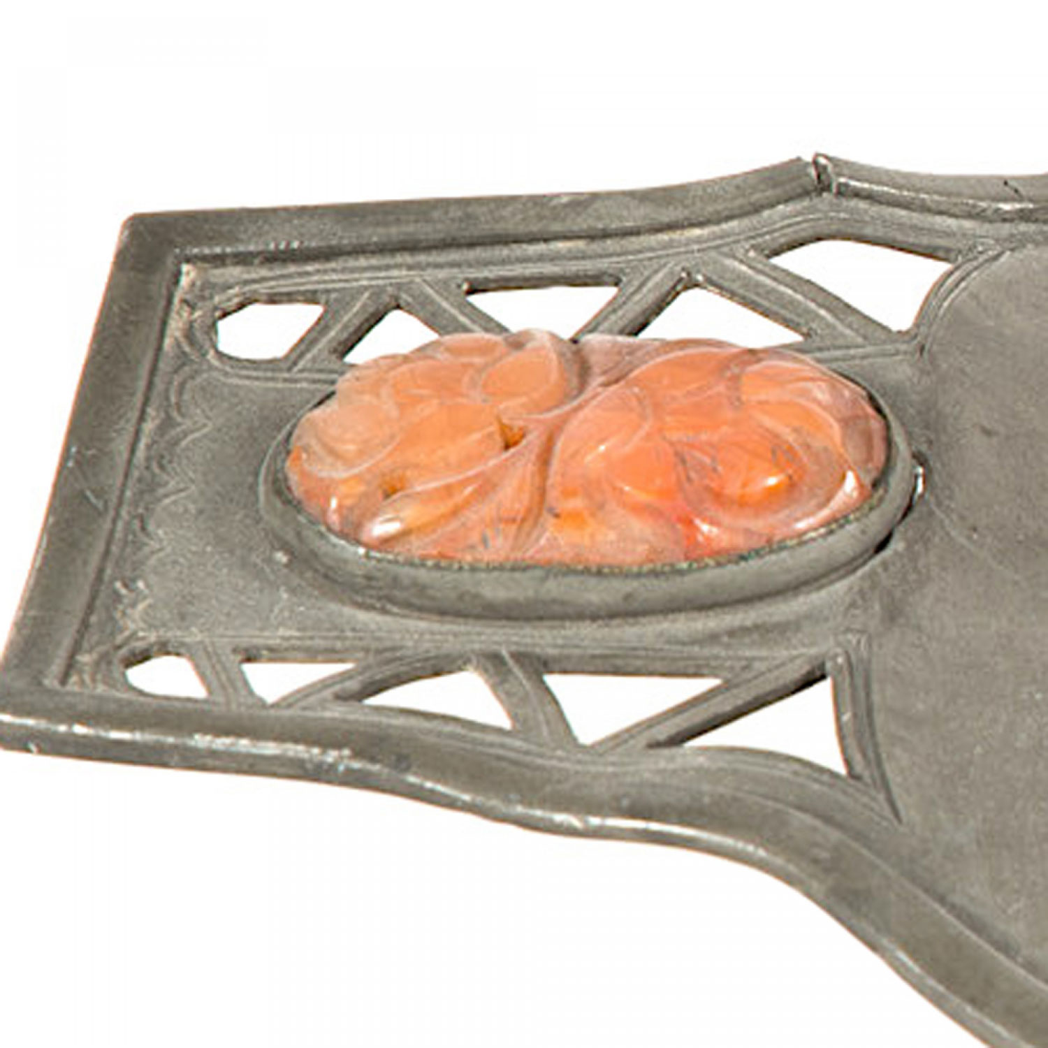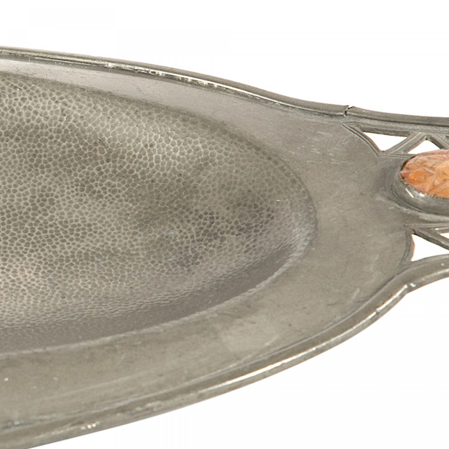 Secessionist oval hammered pewter tray with two handles with decorative cut outs and carved carnelian stone accents.