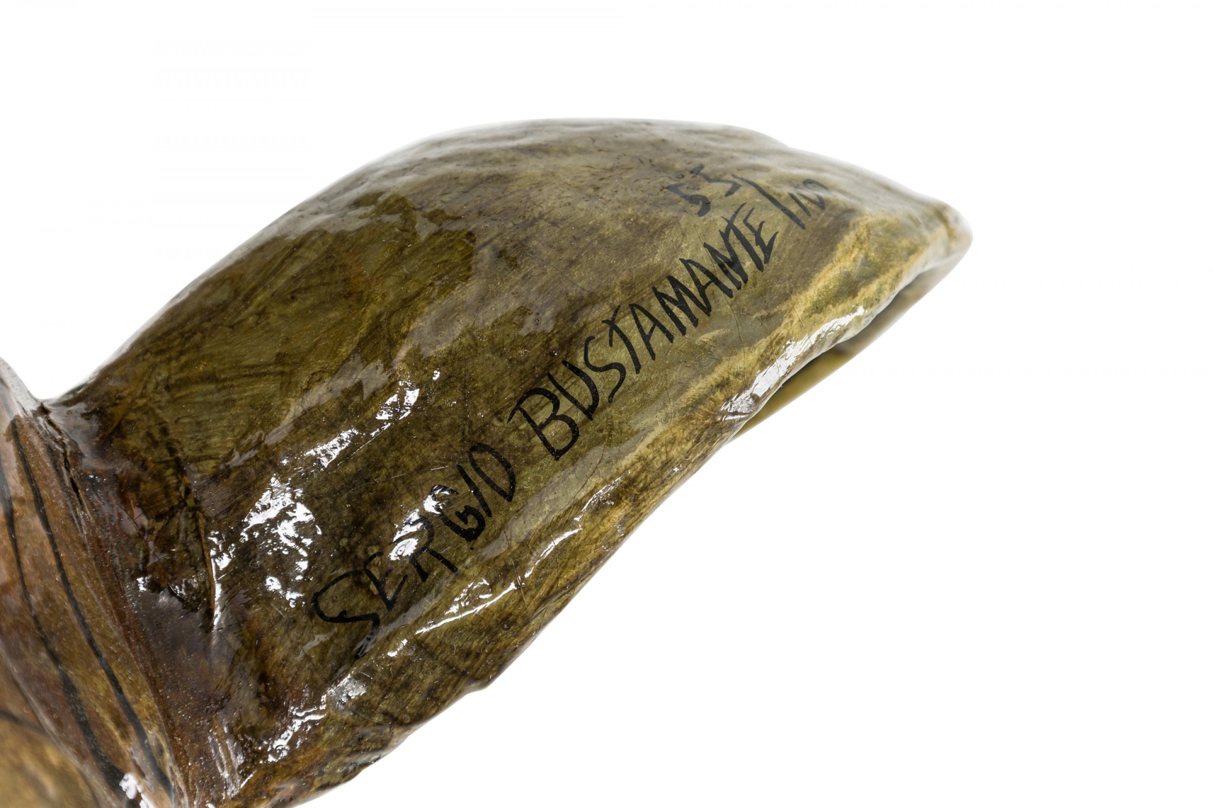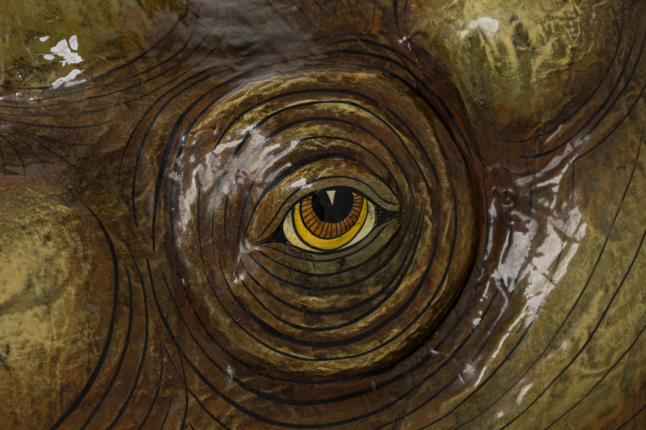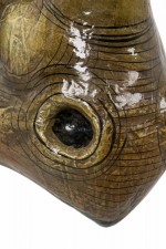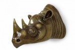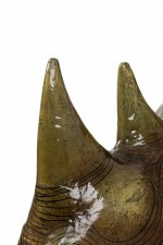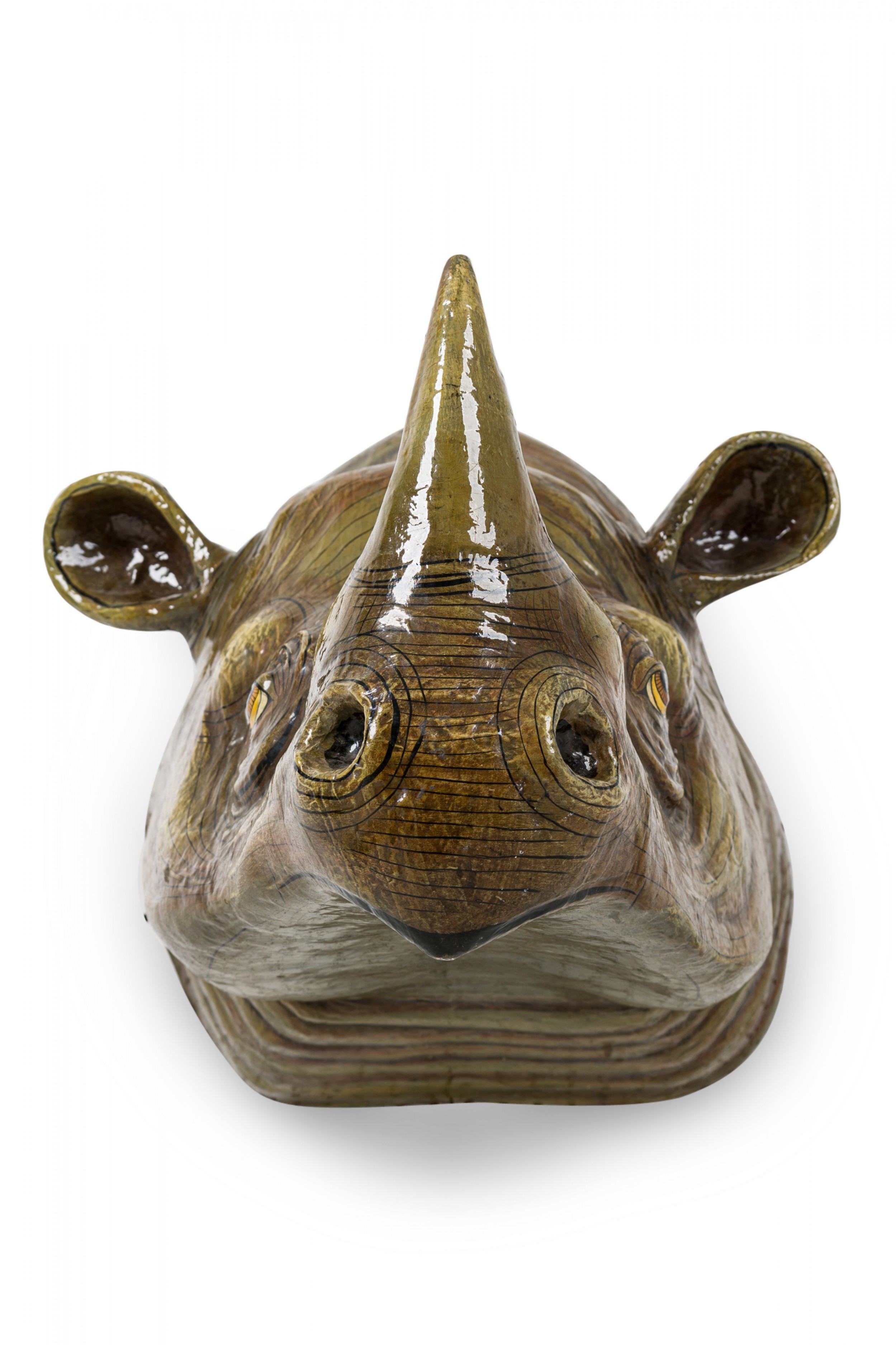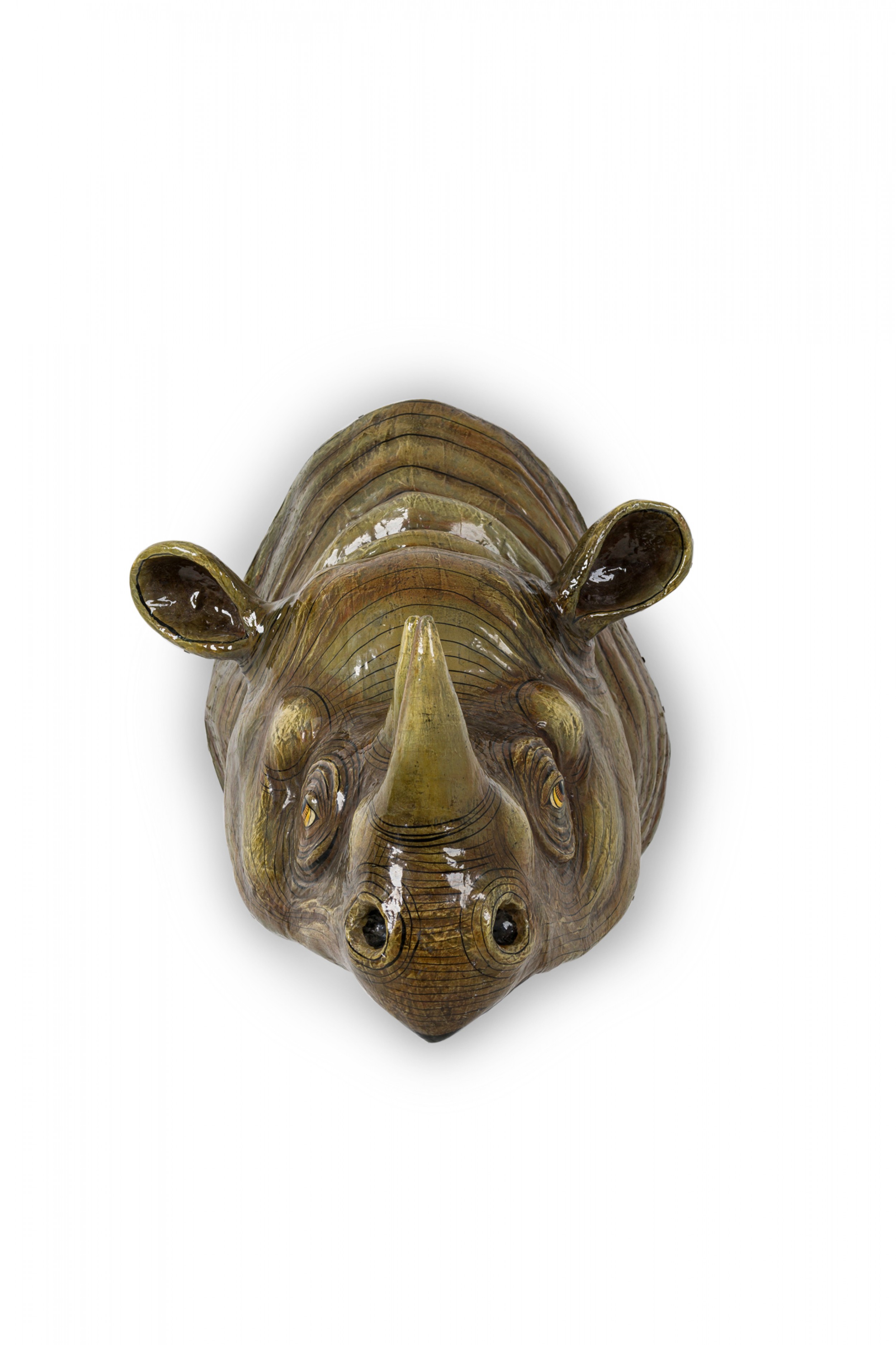Mexican Mid-Century (1970s) wall sculpture of a rhinoceros' head, rendered in papier-mâché, painted and lacquered. (SERGIO BUSTAMANTE)