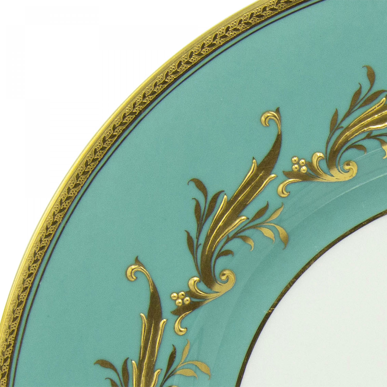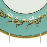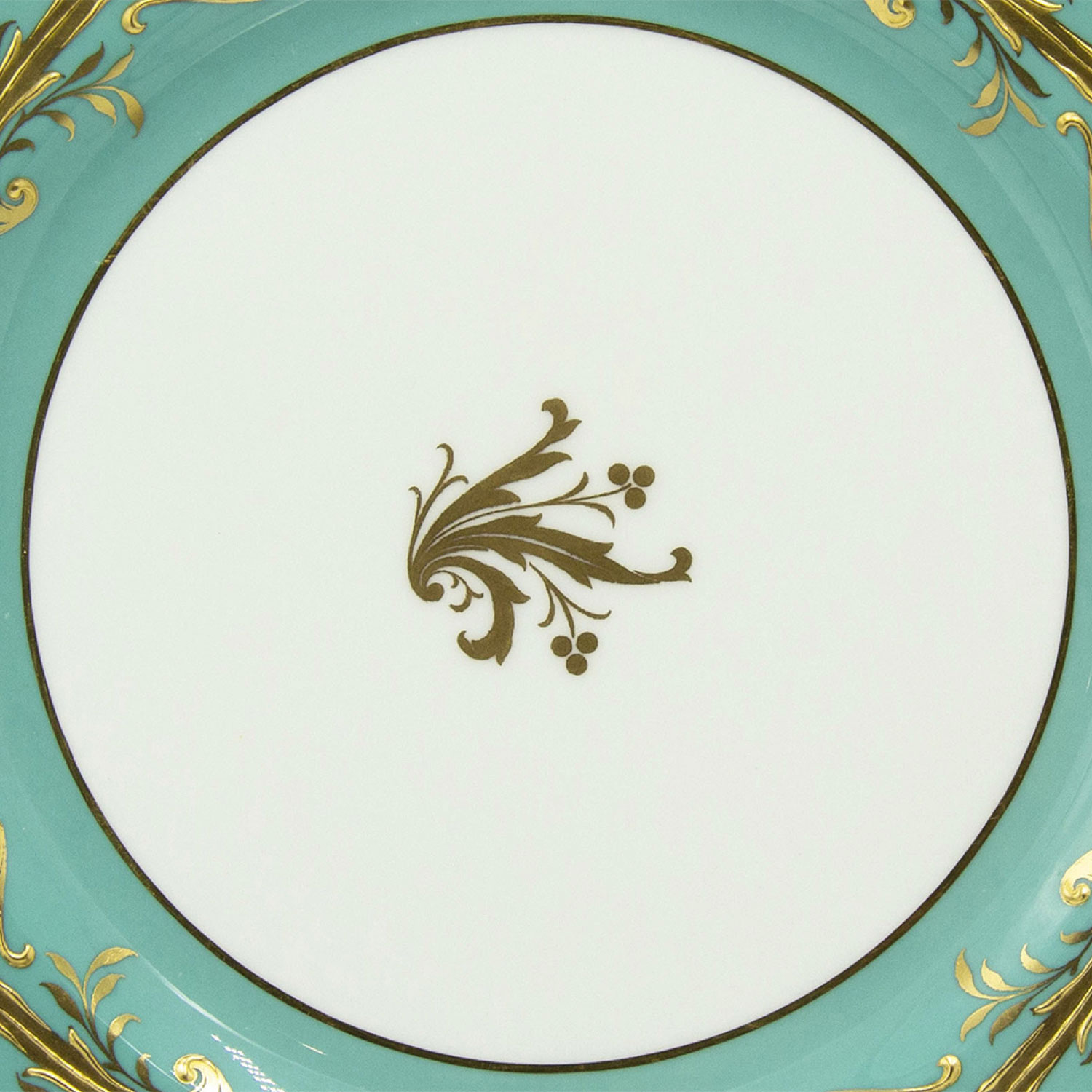 Set of 12 English Victorian turquoise and white Minton porcelain dinner plates with gold trim and floral center (PRICED AS SET).